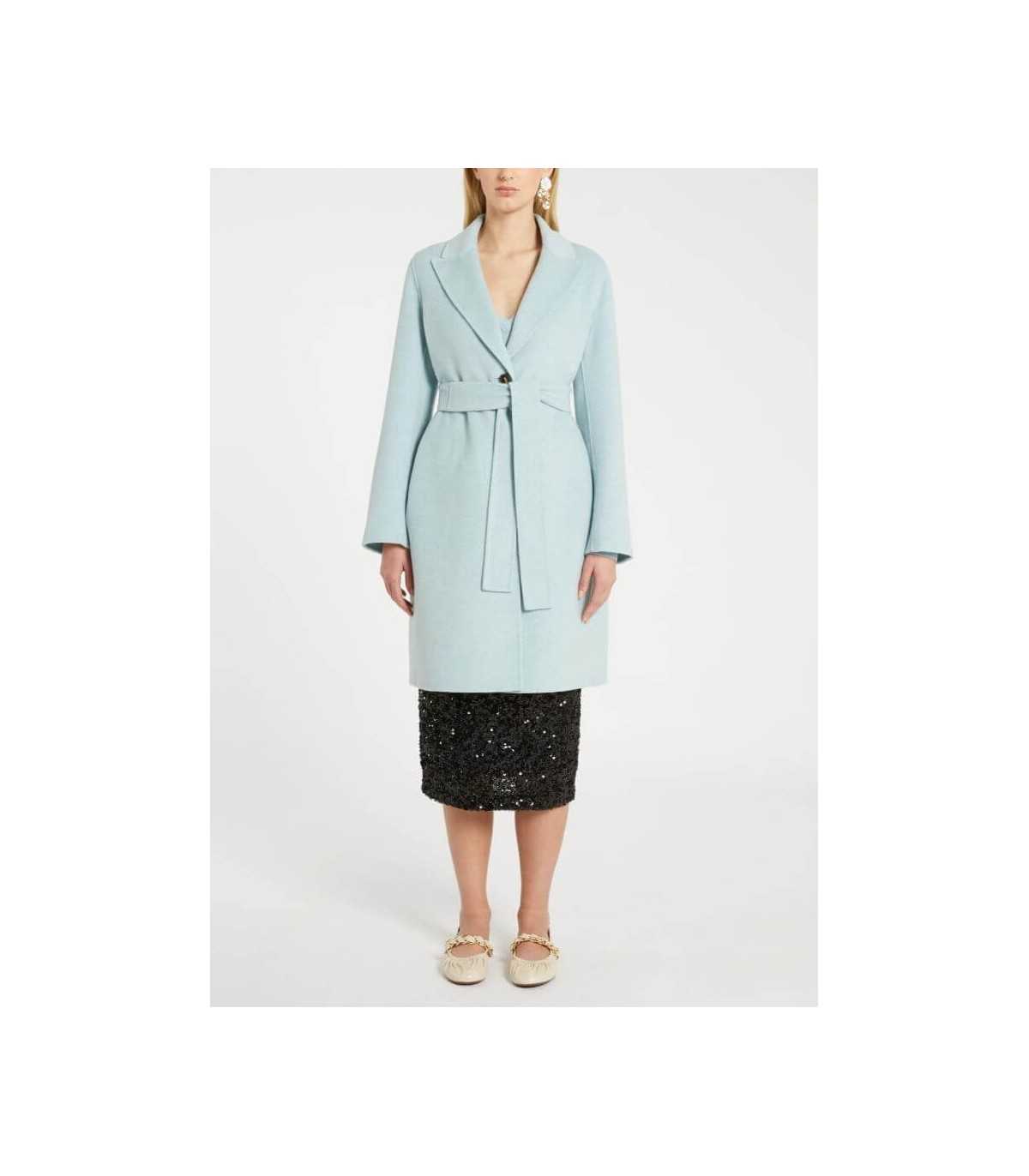 Abrigo midi de lana, color gris claro, corte recto, cuello solapa, cierre de botones con cinturón y bolsillos laterales, de la marca italiana Marella.