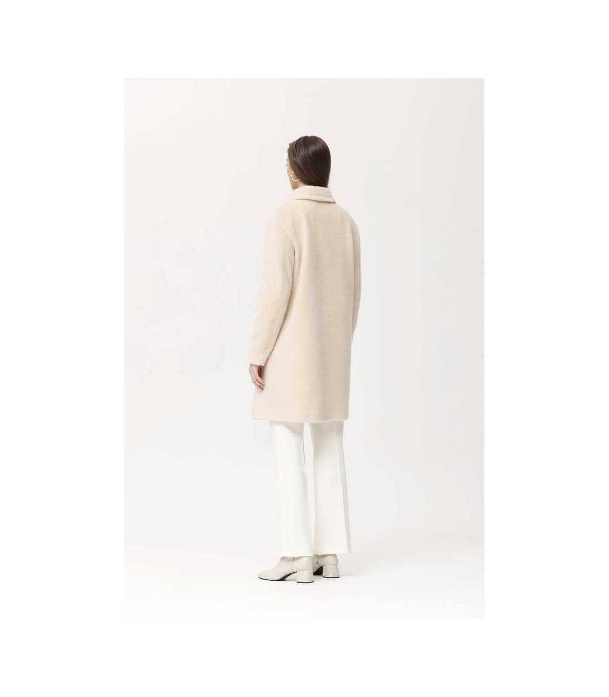 Abrigo de punto grueso enfieltrado en tono crudo, línea recta, cierre frontal de botones, bolsillos laterales y cuello extraíble de pelo sintético de la marca española Oky.
