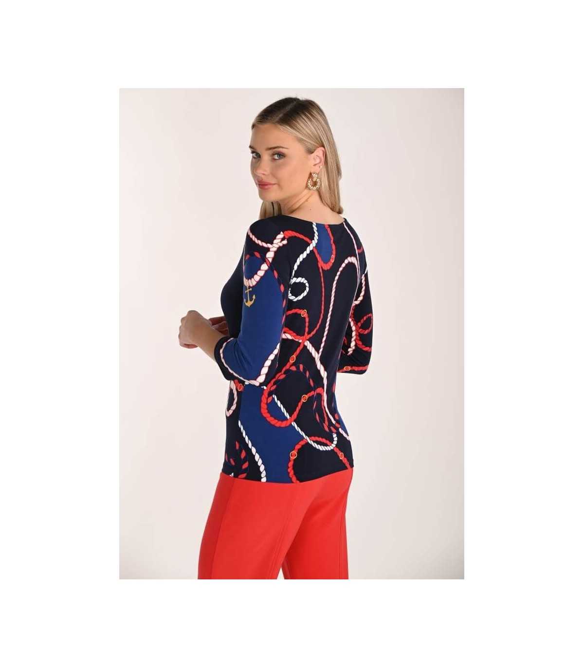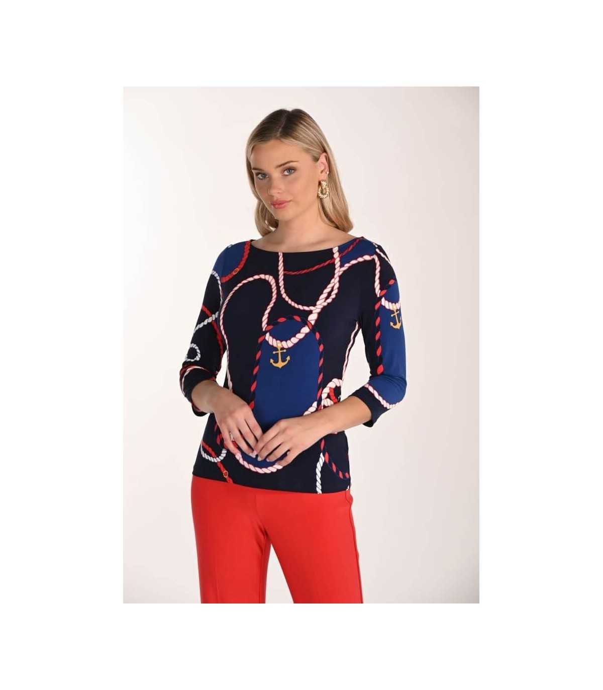 Top en tejido de punto de seda, color azul marino con estampación de nudos marineros en blanco y rojo, cuello redondeado y manga francesa, de la marca canadiense Frank Lyman.