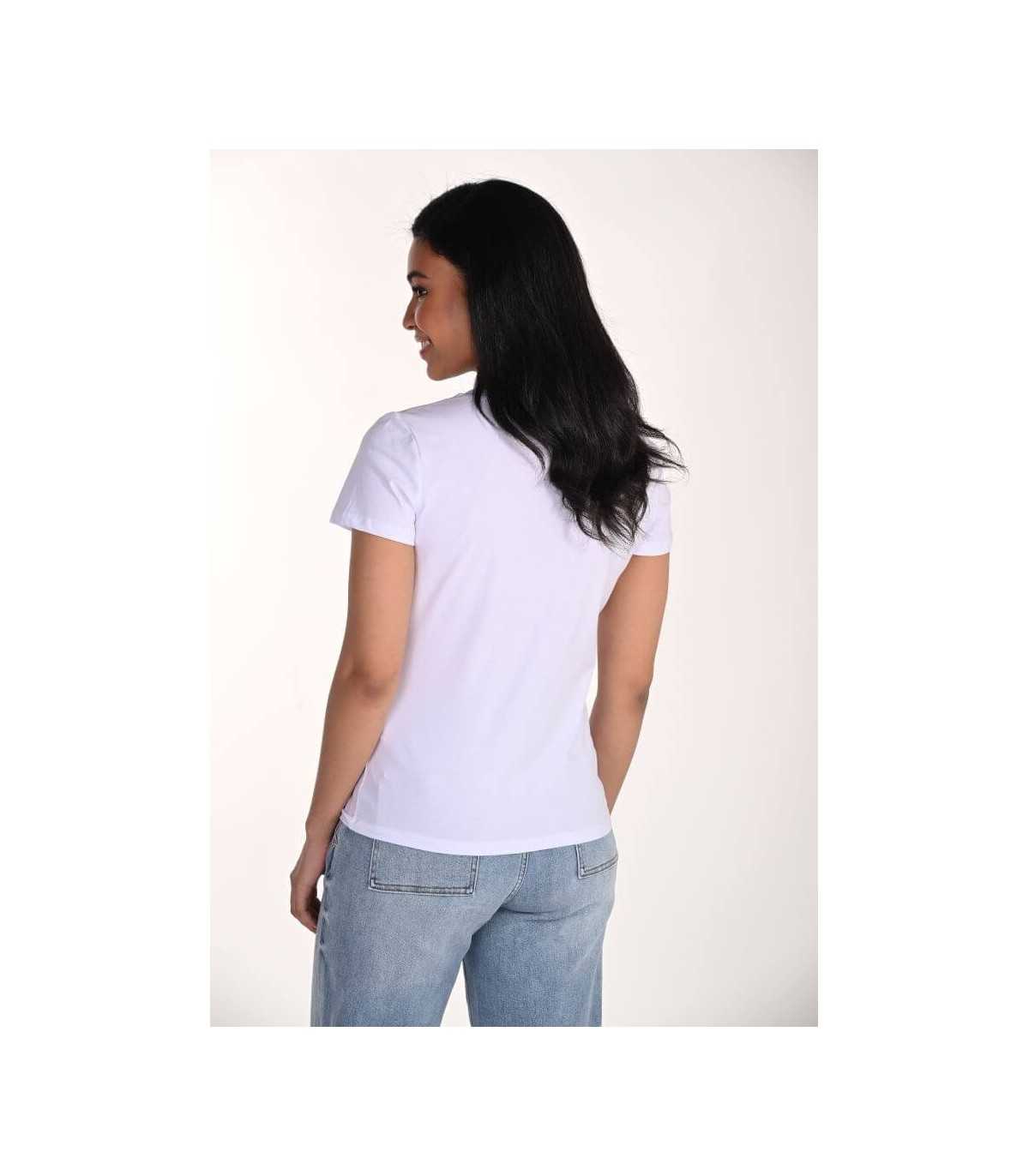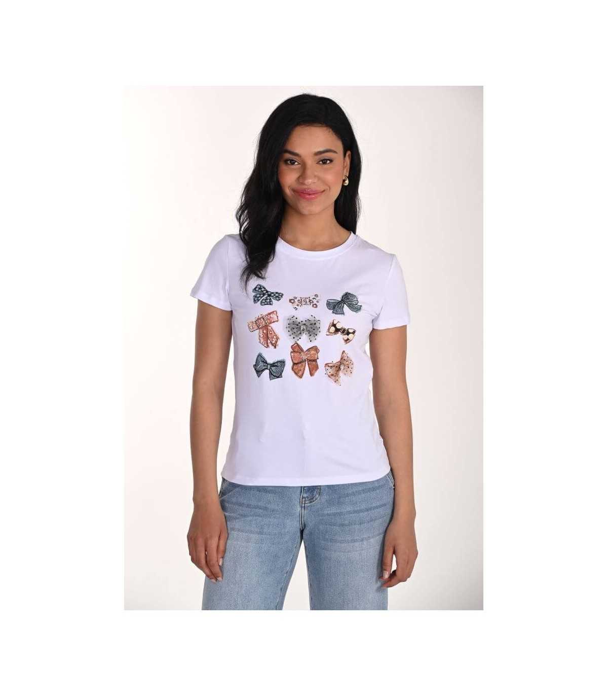 Camiseta color blanco con estampado grafico de lazos, cuello redondo y manga corta, de la marca canadiense Frank Lyman.