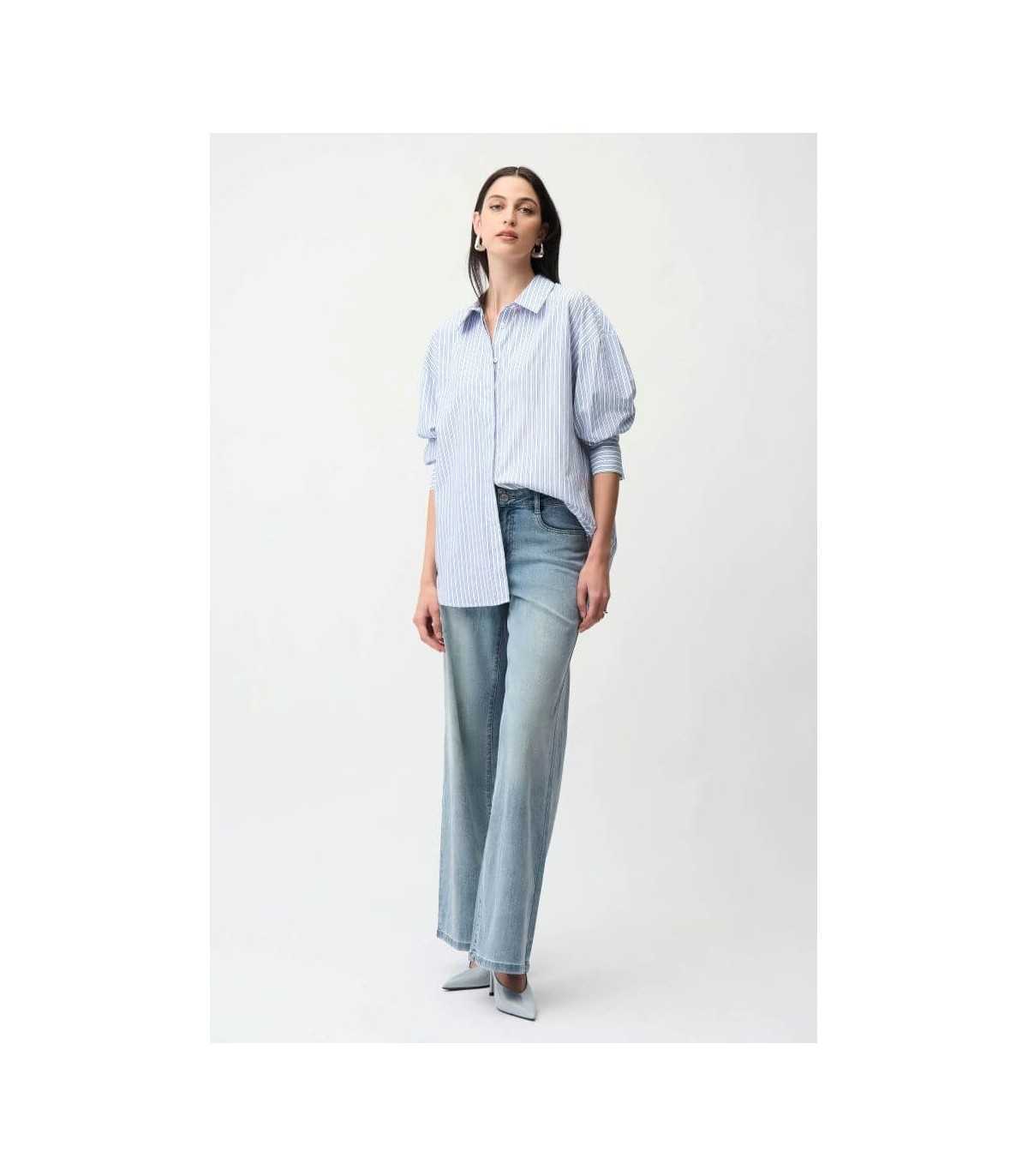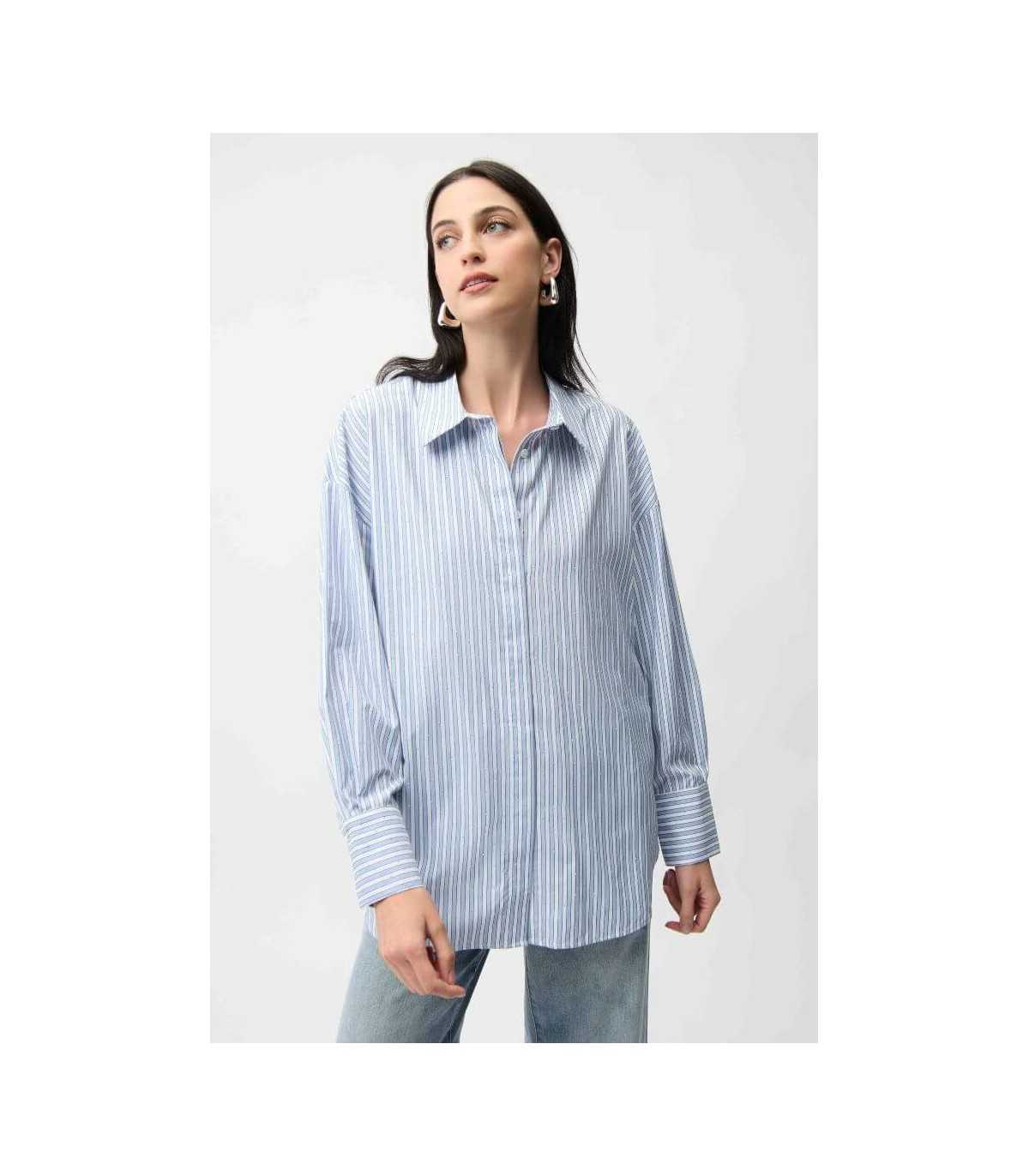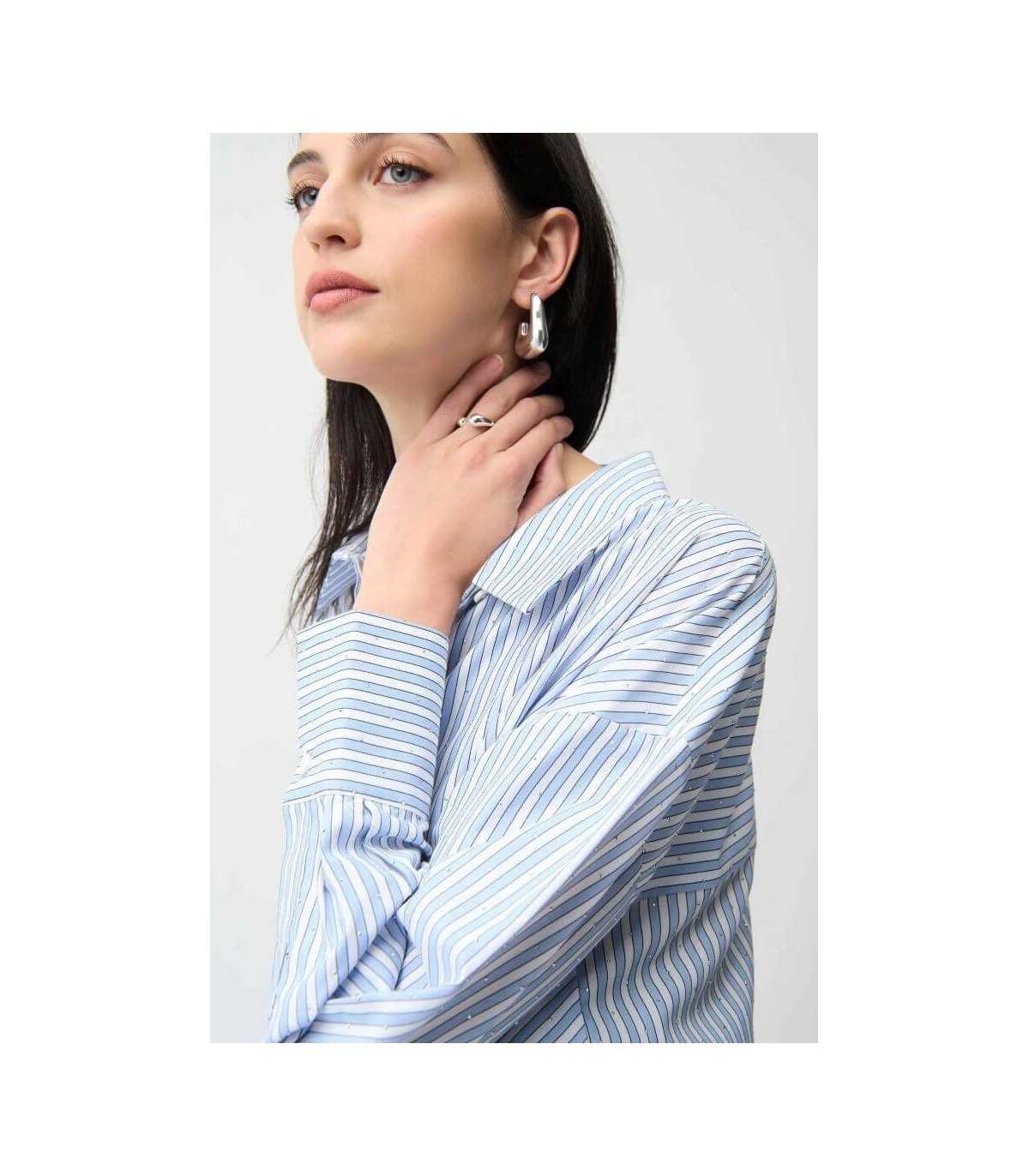Blusa estampada de rayas, tejido tencel ligero, corte boxy, tapeta con botones ocultos y detalles plateados, de la marca canadiense Joseph Ribkoff.