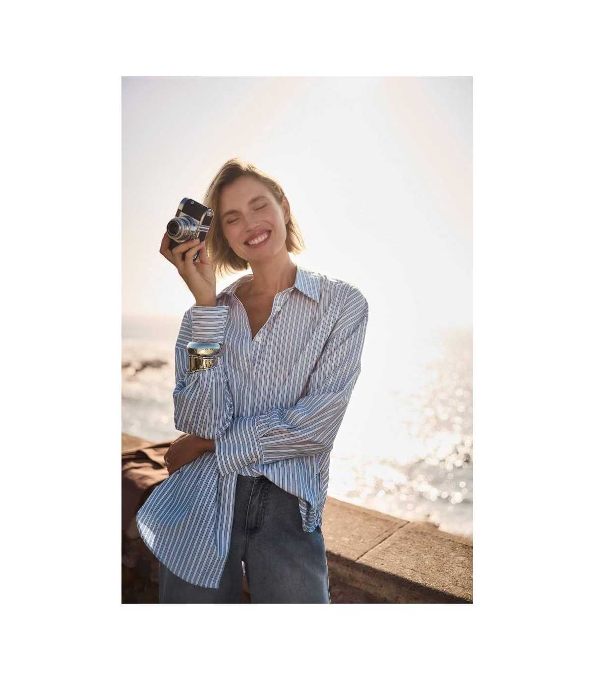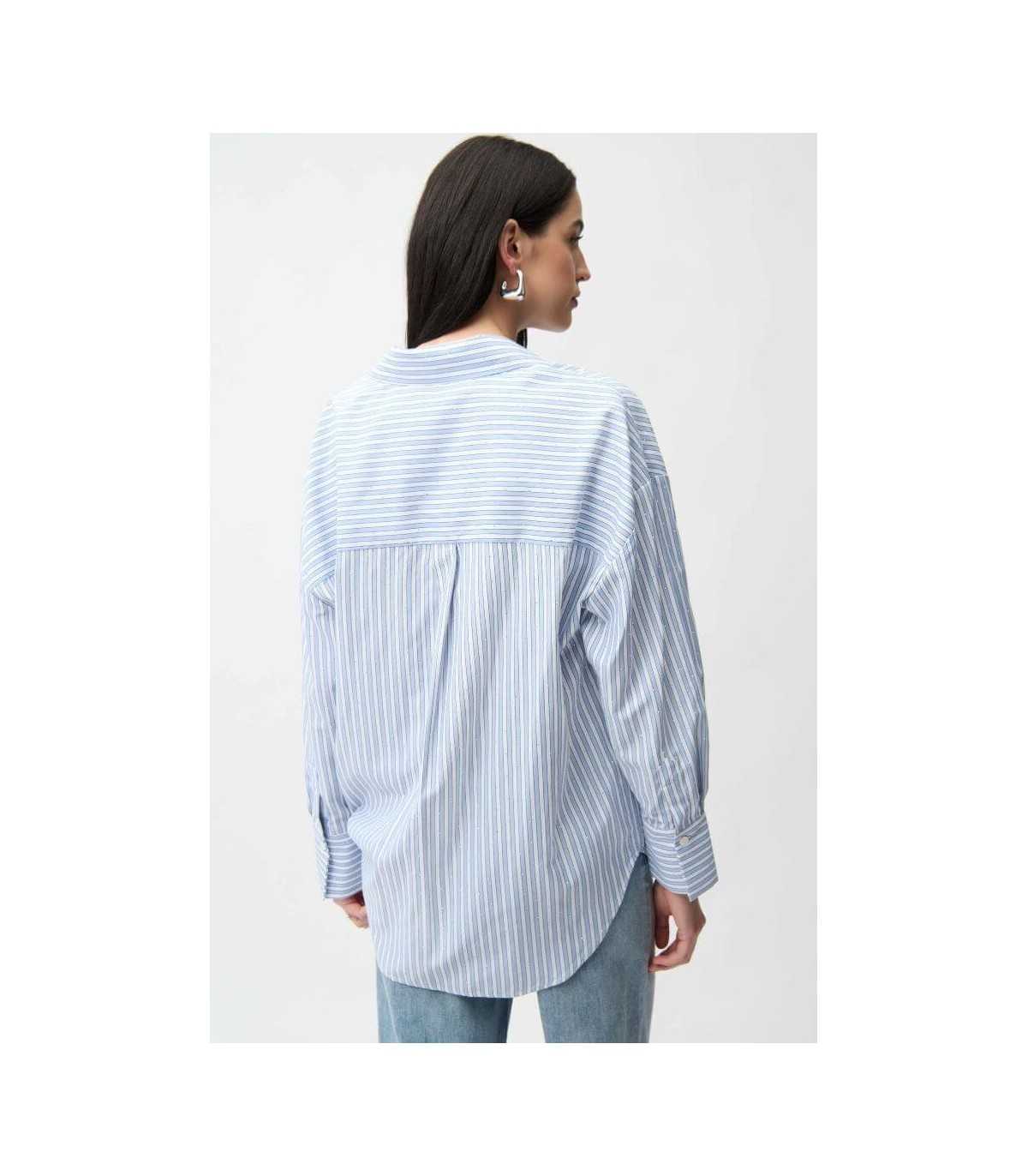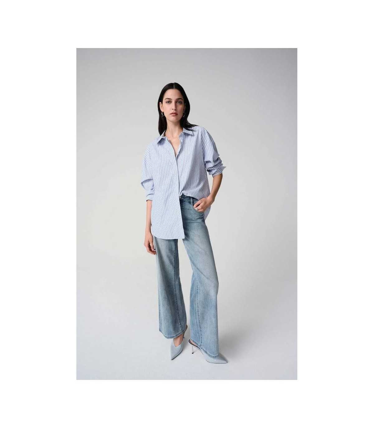 Blusa estampada de rayas, tejido tencel ligero, corte boxy, tapeta con botones ocultos y detalles plateados, de la marca canadiense Joseph Ribkoff.