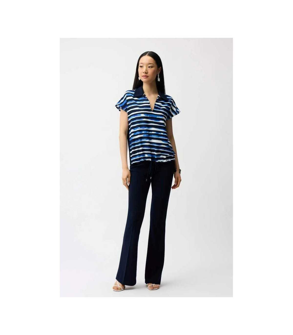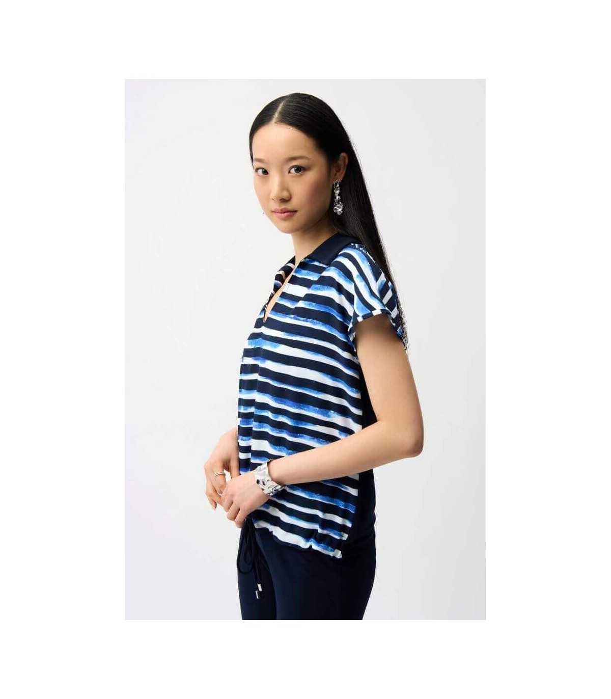 Top en tejido punto de seda, estampado de rayas en bloque de color, escote en v, cuello de camisa, mangas dolmán cortas y dobladillo con cordón, de la marca canadiense Joseph Ribkoff.