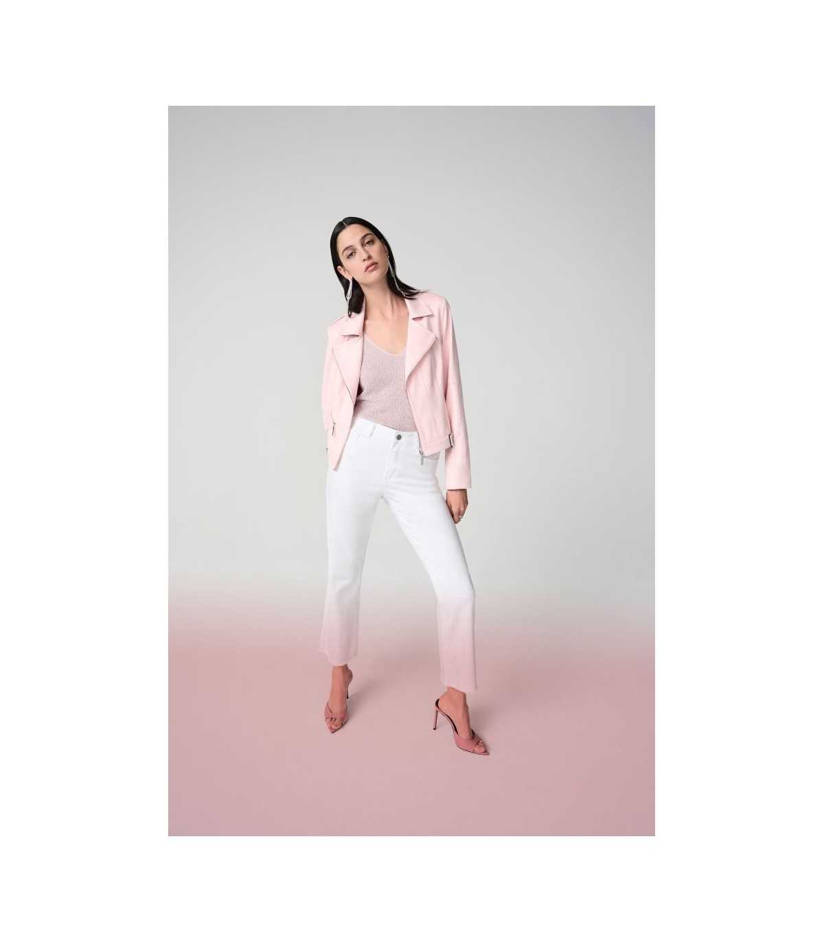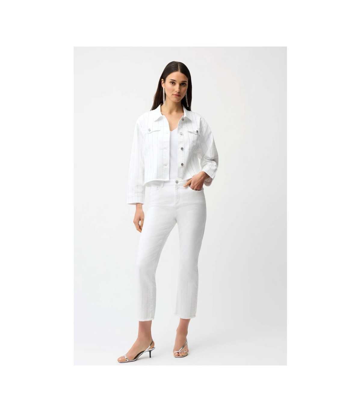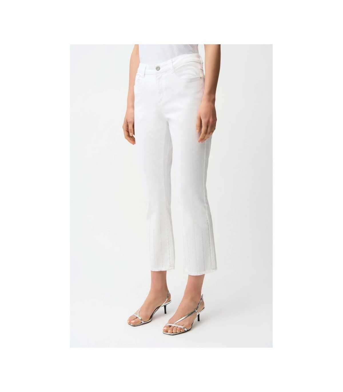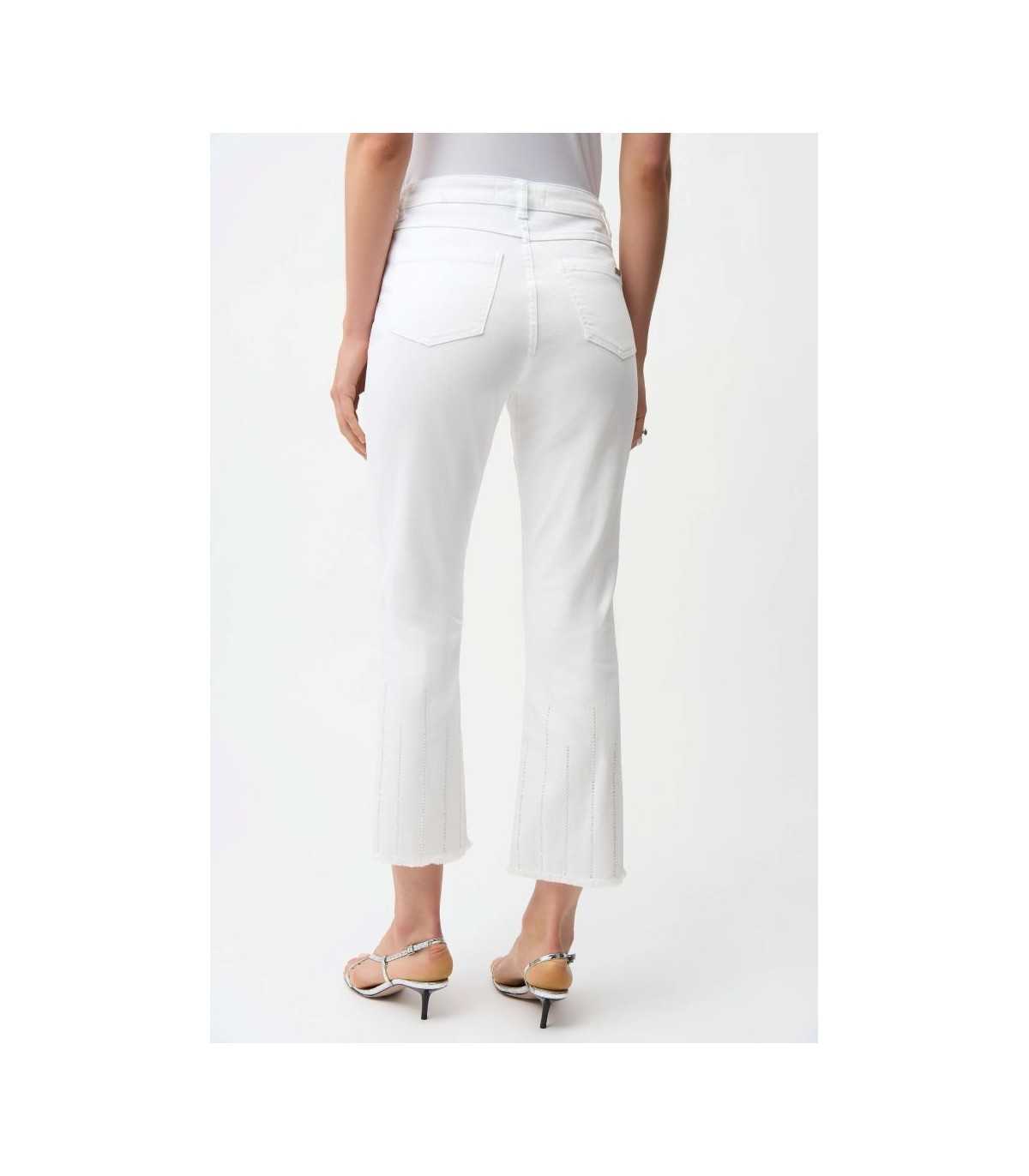 Pantalón vaquero blanco, dobladillo deshilachado y detalles de pedrería, de la marca canadiense Joseph Ribkoff.