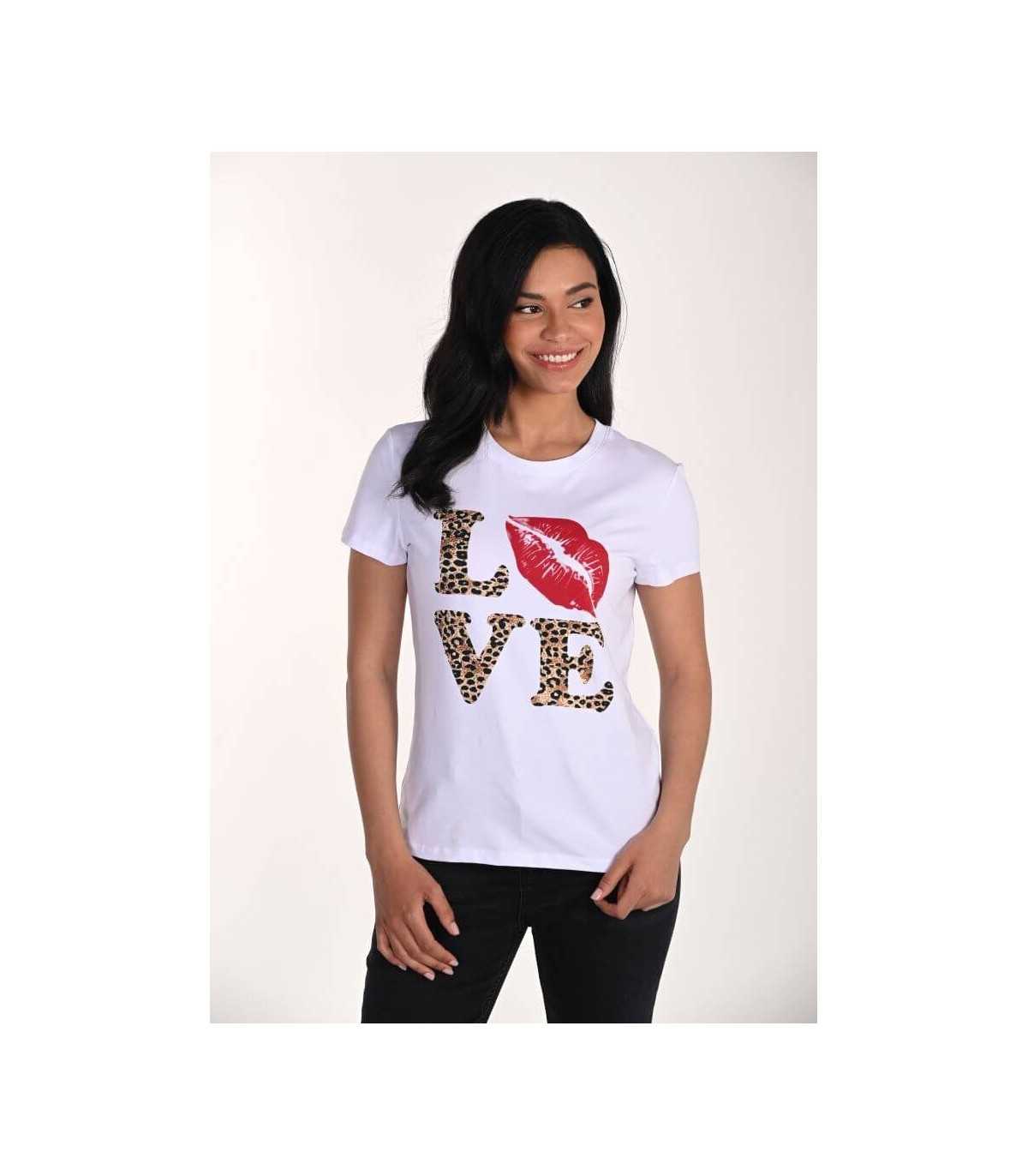 Camiseta en color blanco, aplicaciones de letras estampadas en animal print y beso, manga conta y cuello redondeado, de la marca canadiense Frank Lyman.