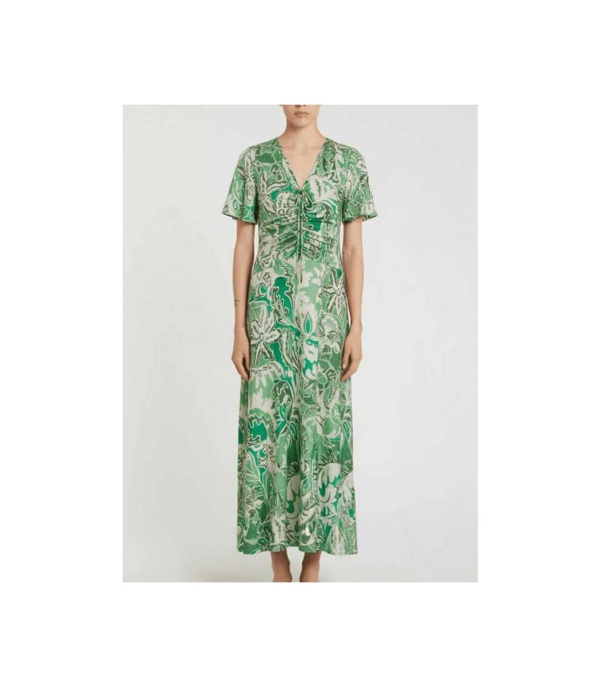 Vestido punto de viscosa, corte regular, cuello de pico con lazo, frunce y manga corta, de la marca italiana Marella.