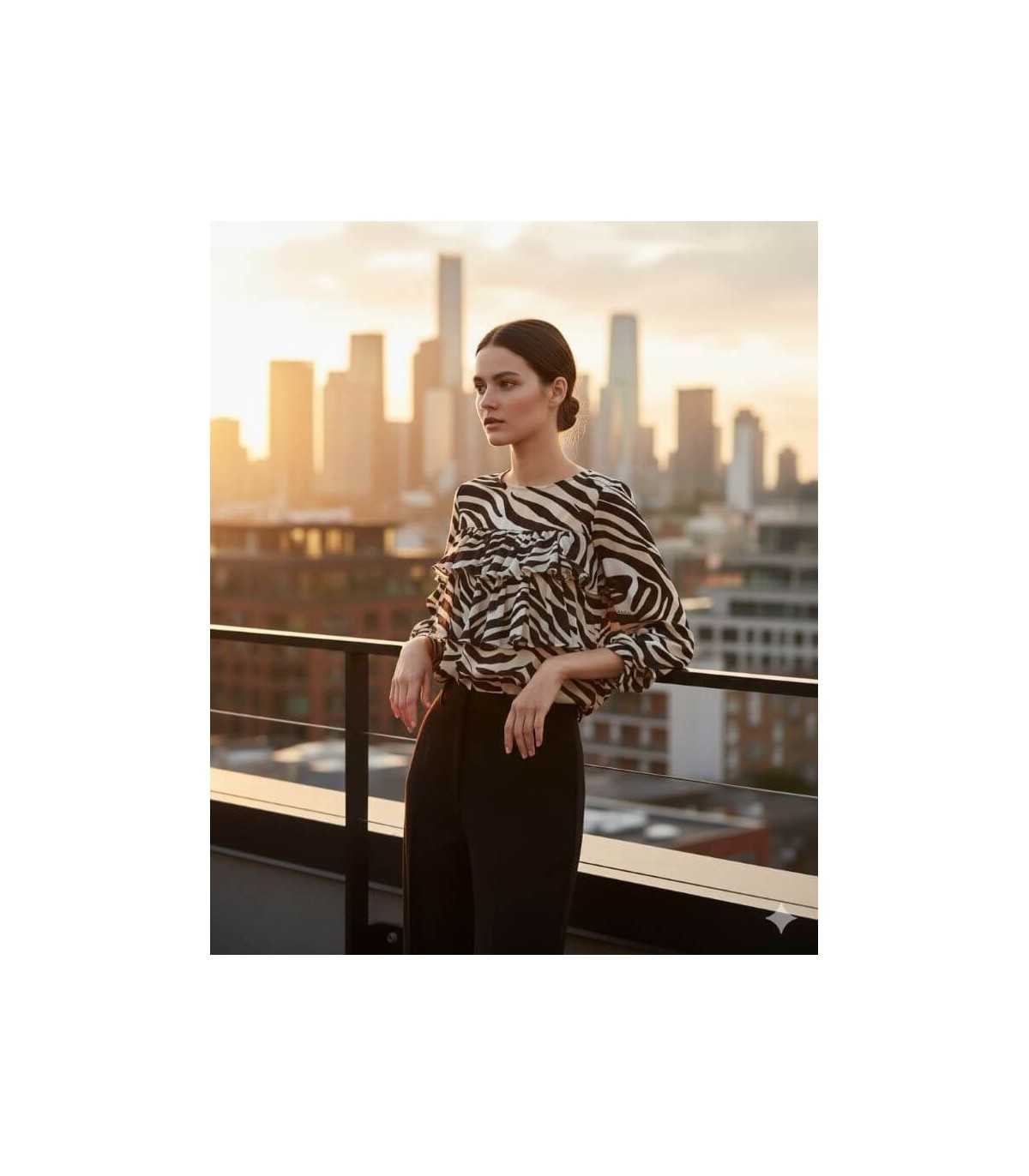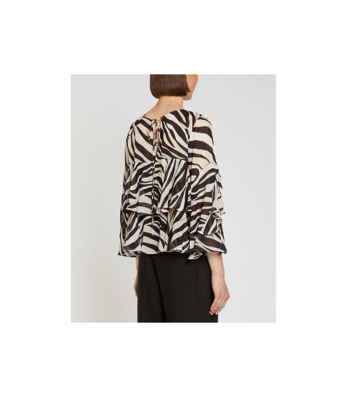 Blusa de georgette de viscosa, estampada de cebra, corte recto, escote barco con lazo en la espalda, detalle de volante y mangas fruncidas, de la marca italiana Marella.