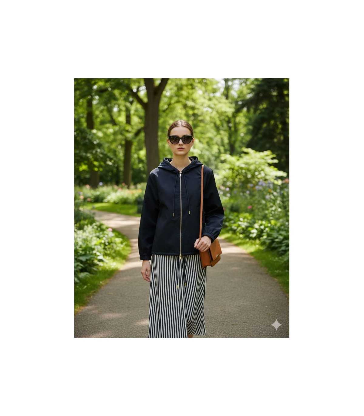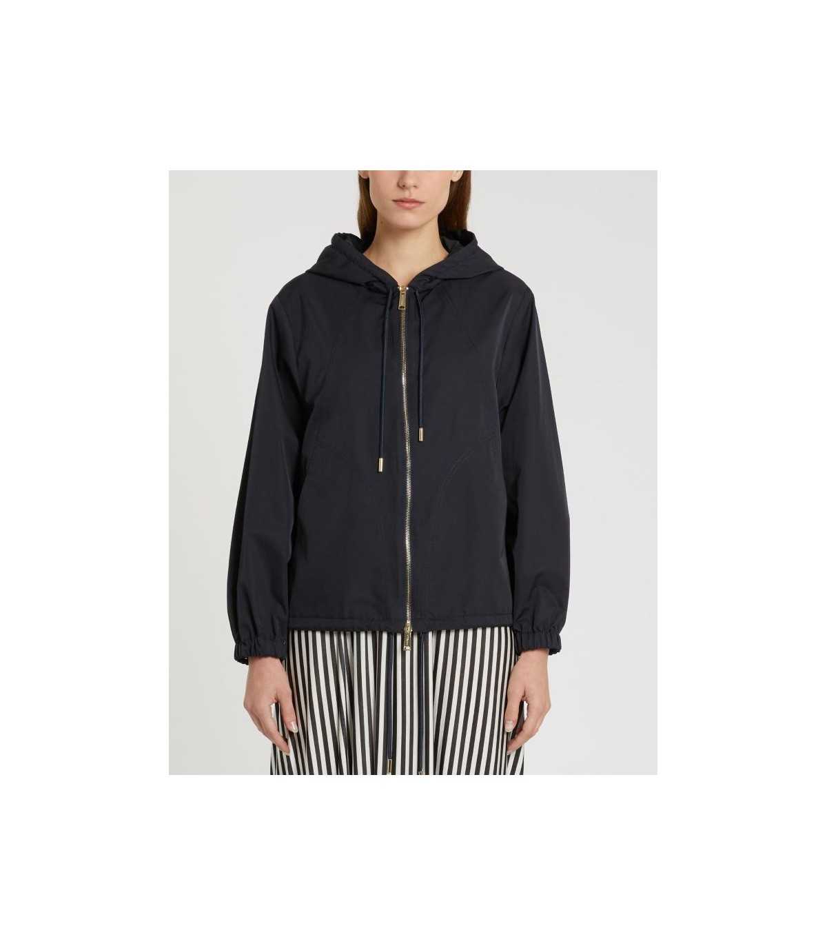 Chaqueta impermeable azul marino, capucha con cordón ajustable, corte regular, cierre de cremallera y bolsillos laterales, de la marca italiana Marella.