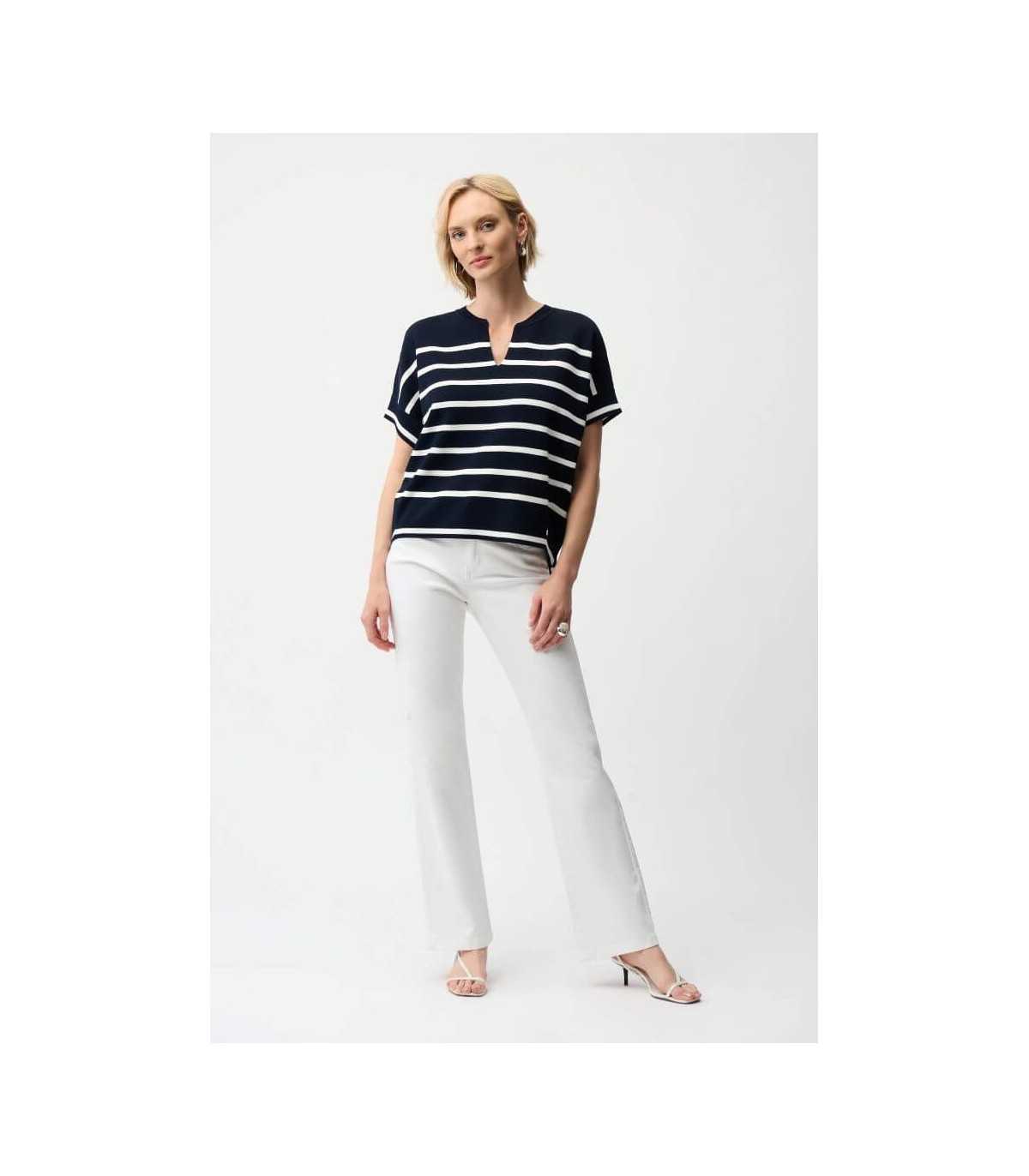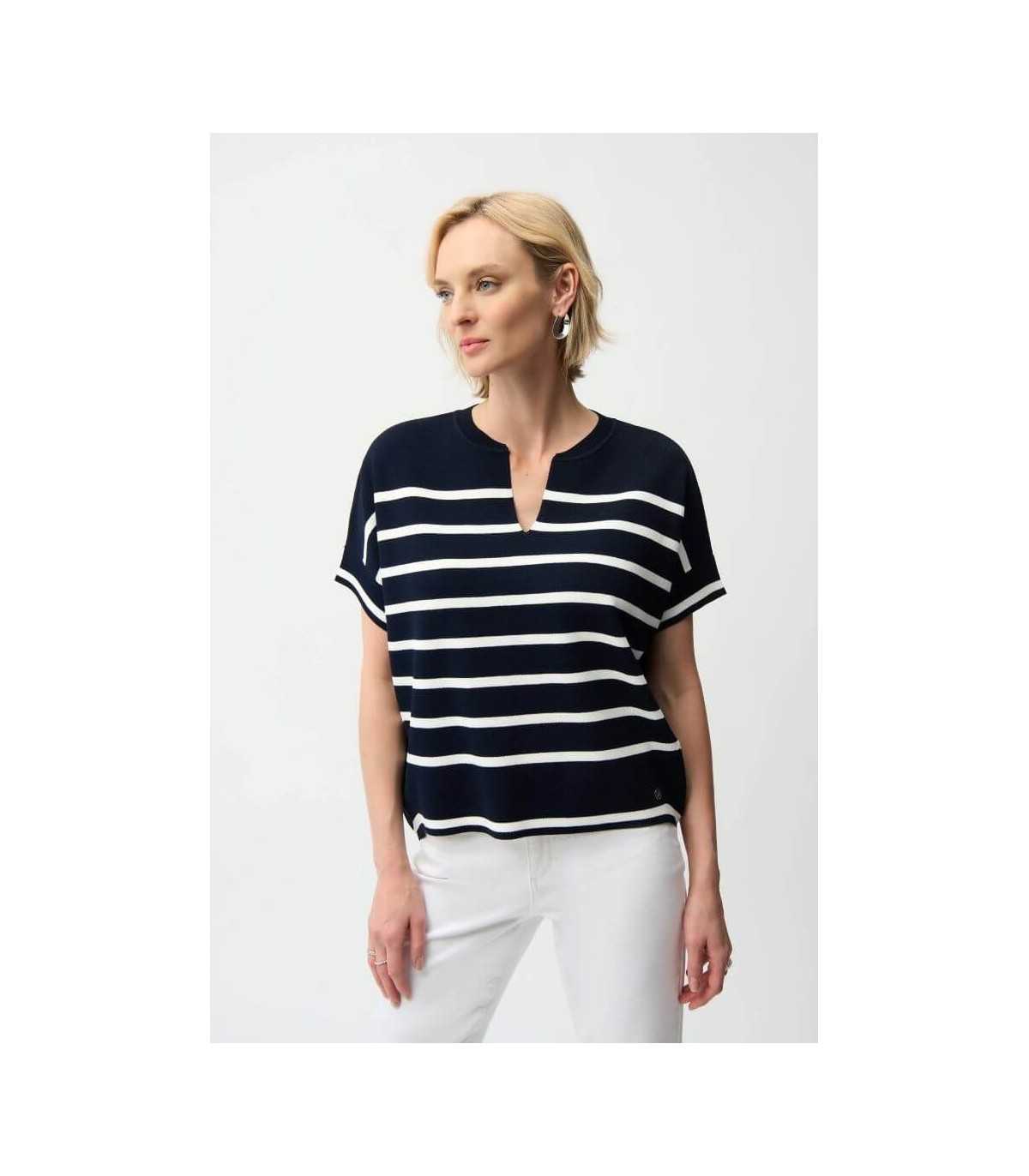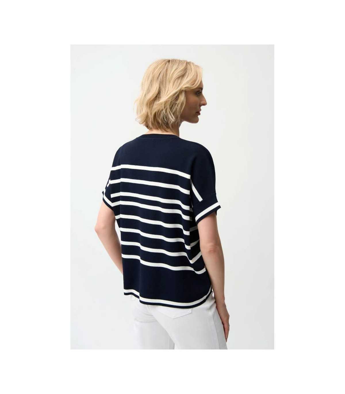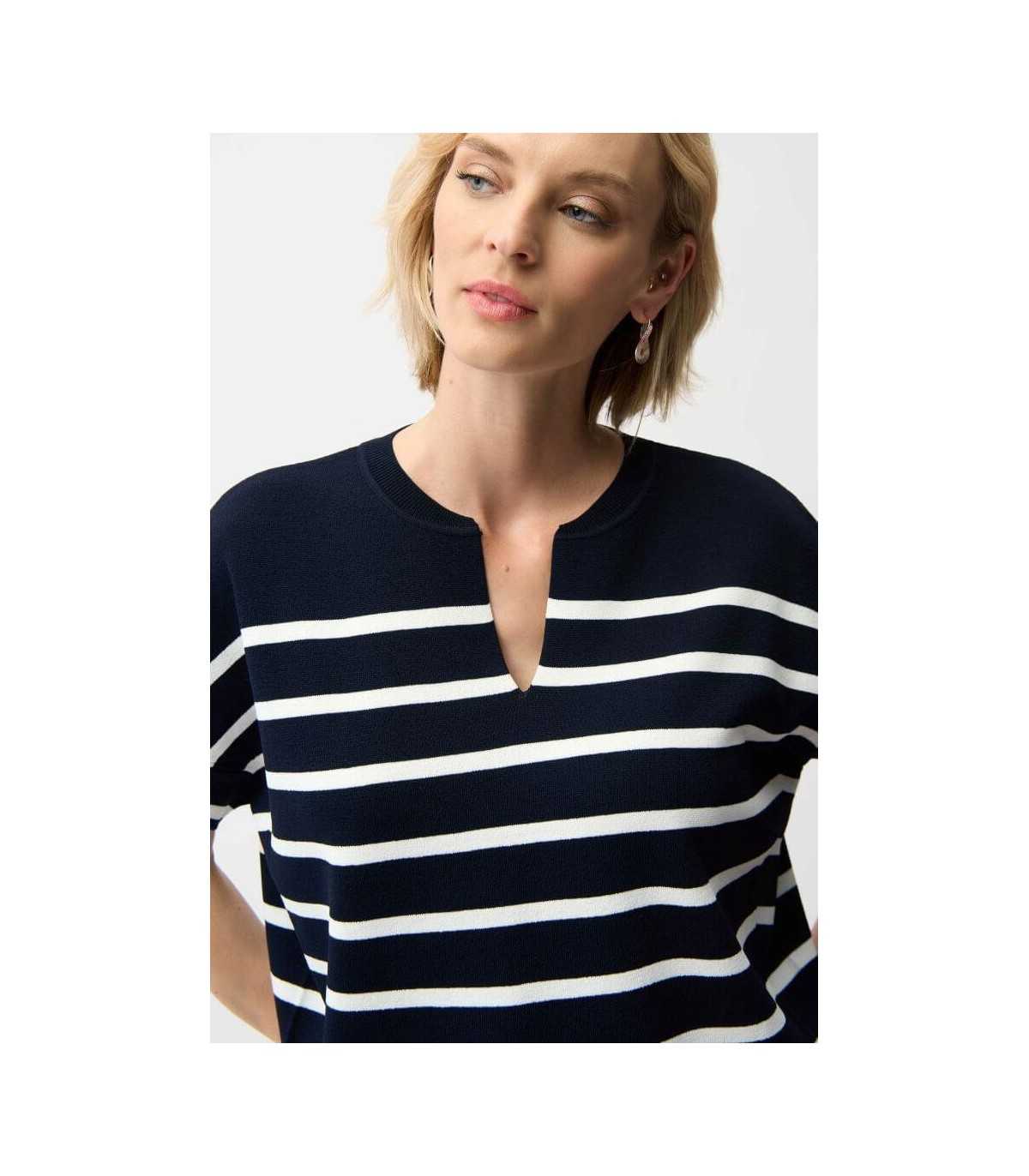 Jersey en color azul marino rayas blancas, escote en v con muesca, mangas dolmán y silueta boxy, de la marca canadiense Joseph Ribkoff.