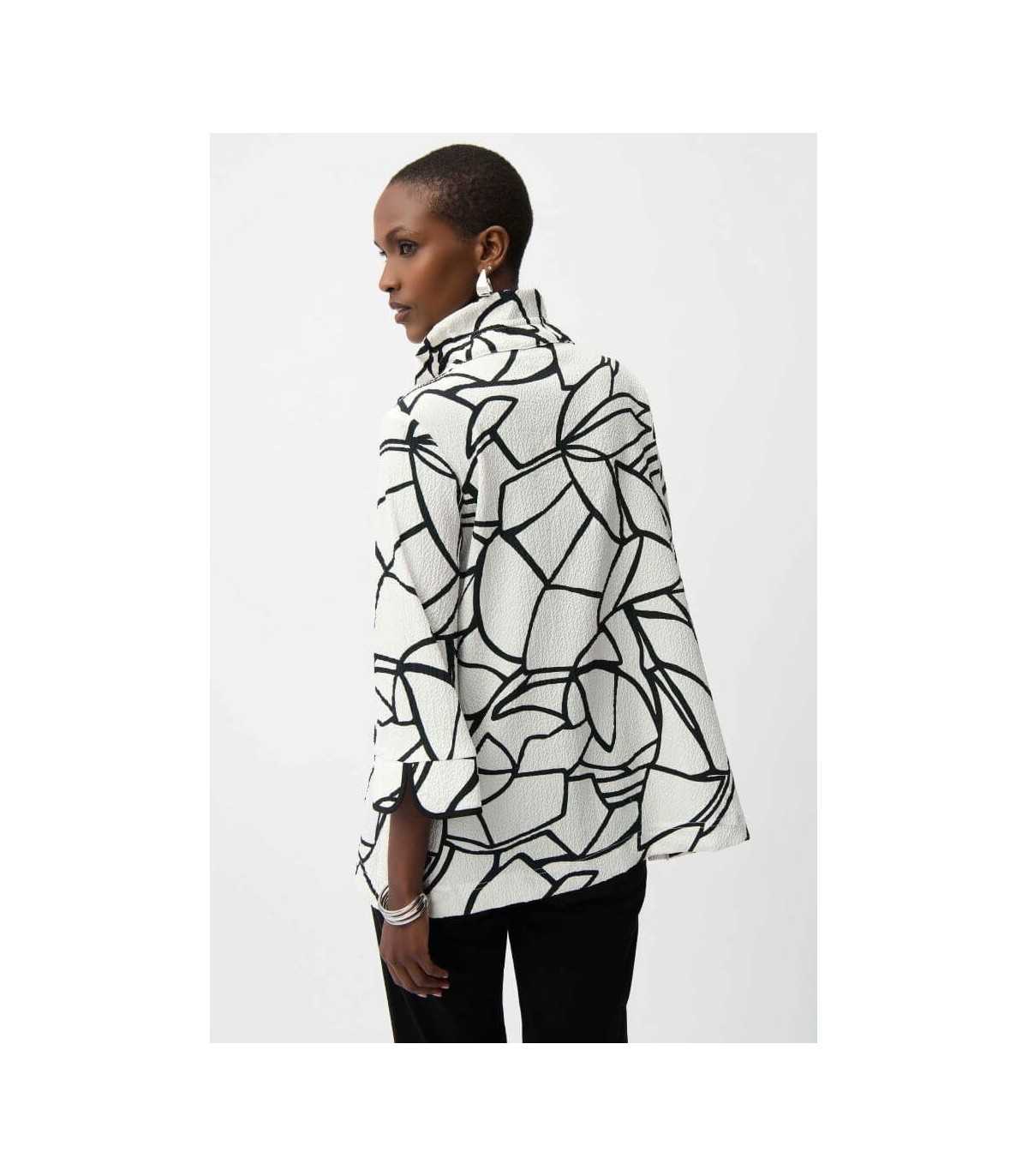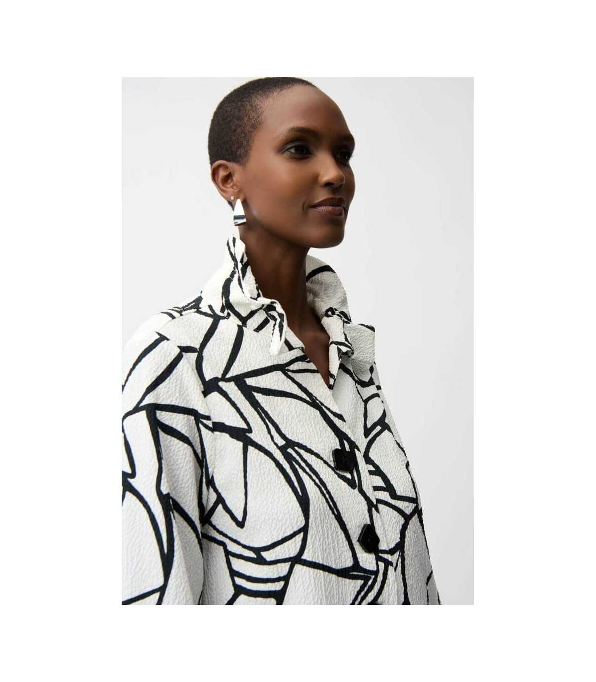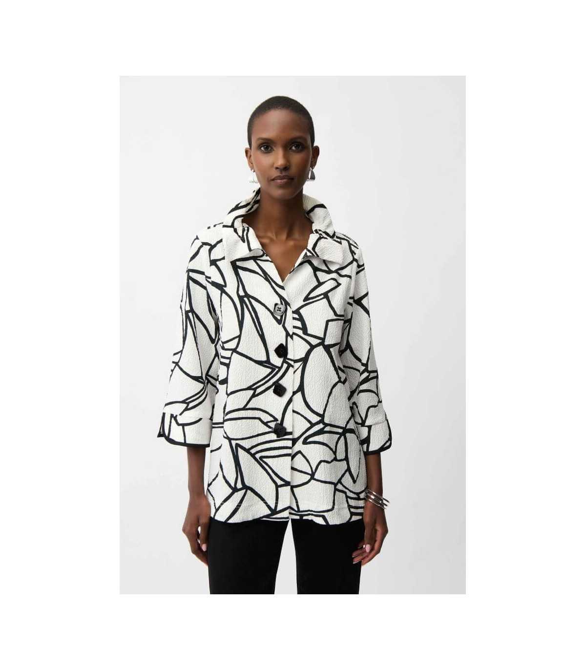 Chaqueta corte trapecio, estampado abstracto, cuello fruncido, cierre frontal de botones en contraste y aberturas laterales, de la marca canadiense Joseph Ribkoff.