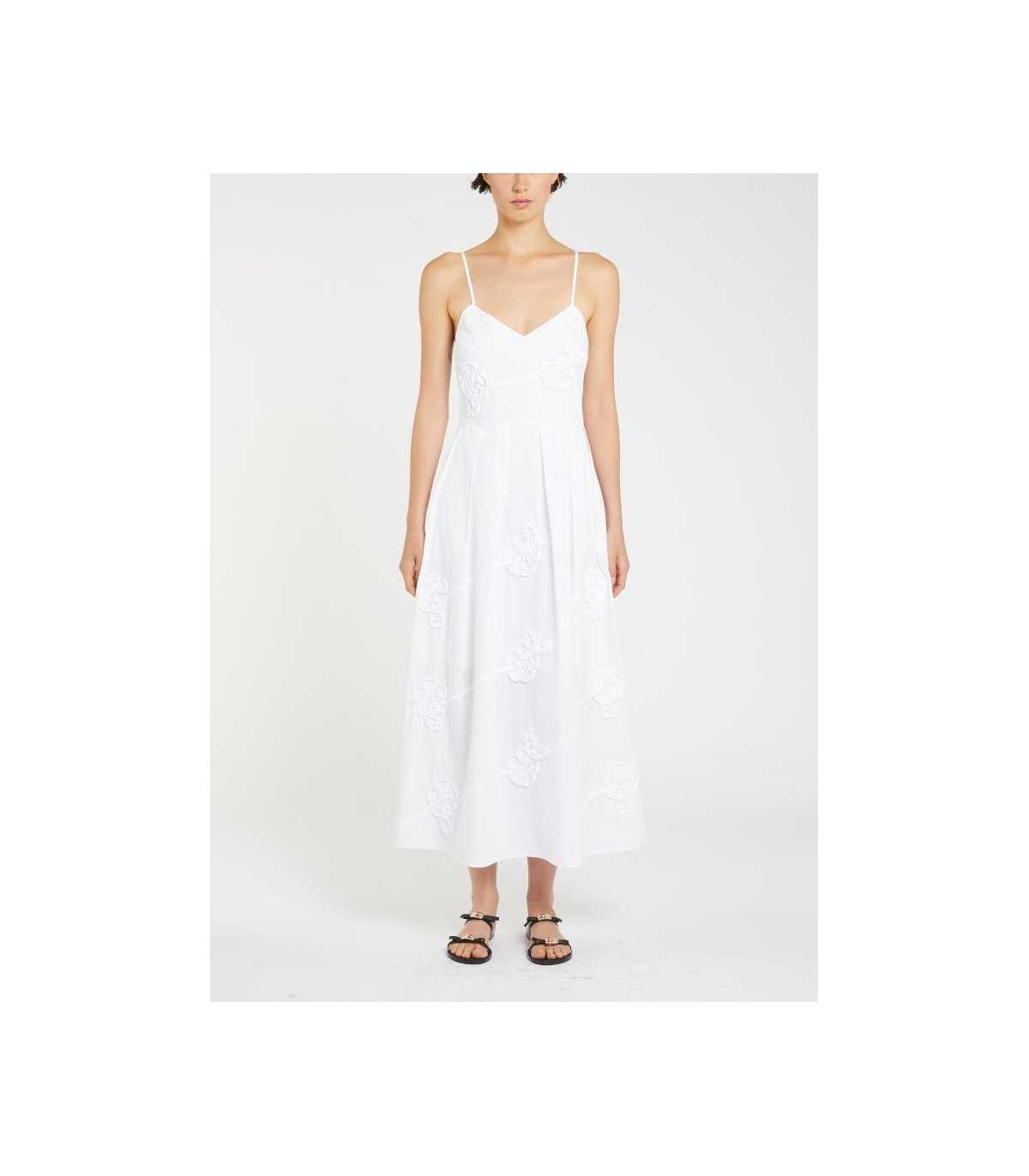 Vestido popelina algodón, color blanco, corte recto, escote pico, tirantes finos, corte en la cintura, cierre con cremallera oculta en el lateral, falda amplia con bolsillos laterales y bordado, de la marca italiana Marella.