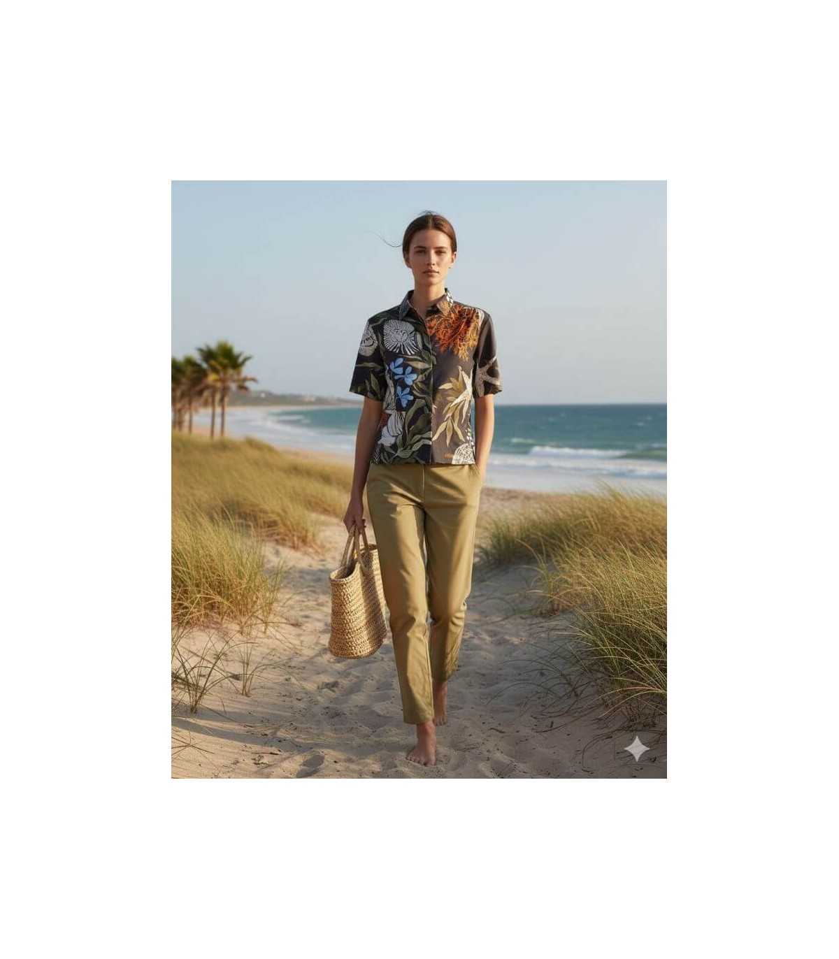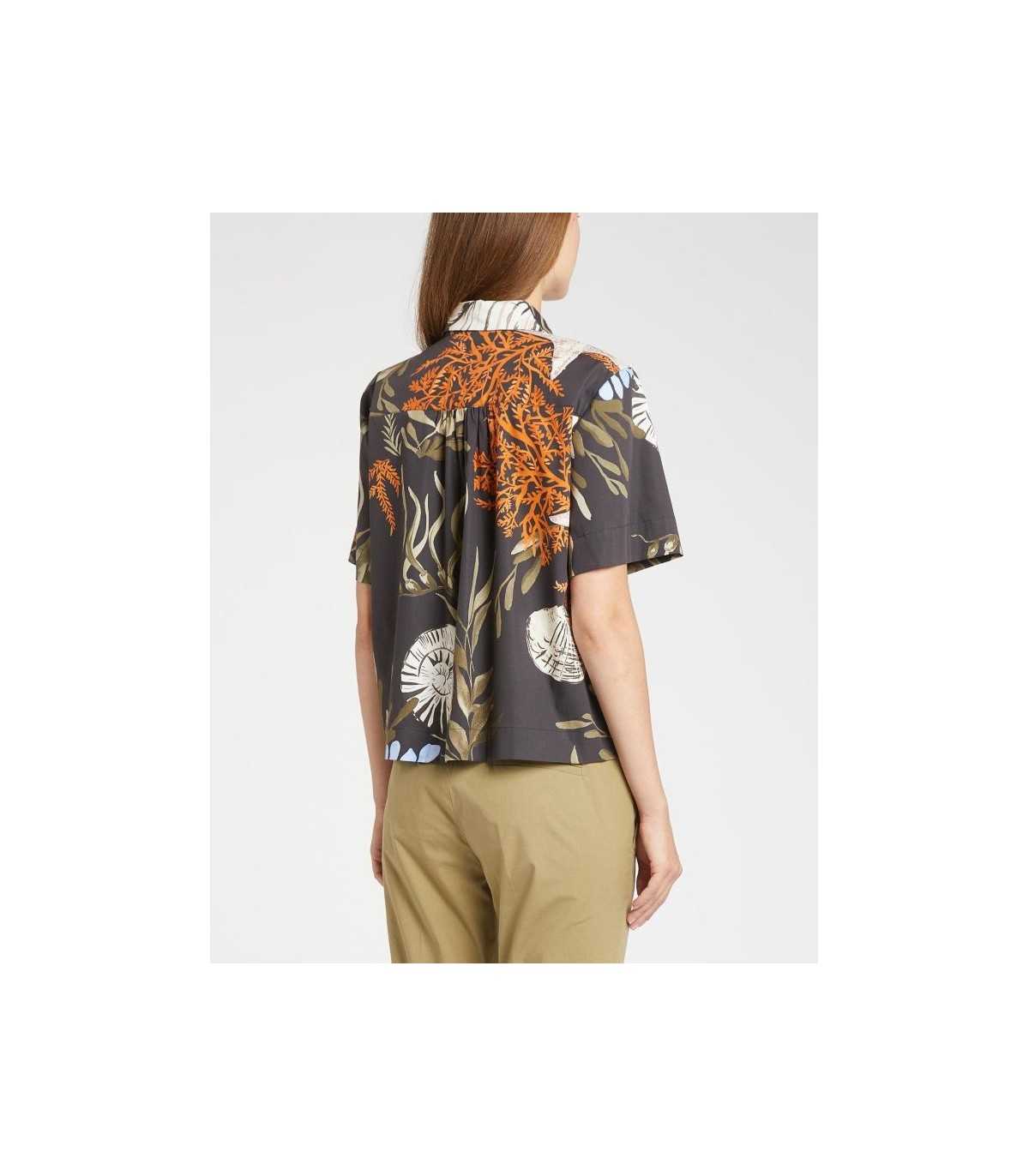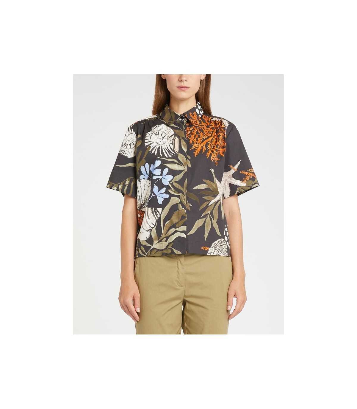 Camisa popelina de algodón, estampado fondo marino, corte recto, cuello camisa, botonadura oculta con primer botón visto y fruncido en el canesú delantero y trasero, de la marca italiana Marella.