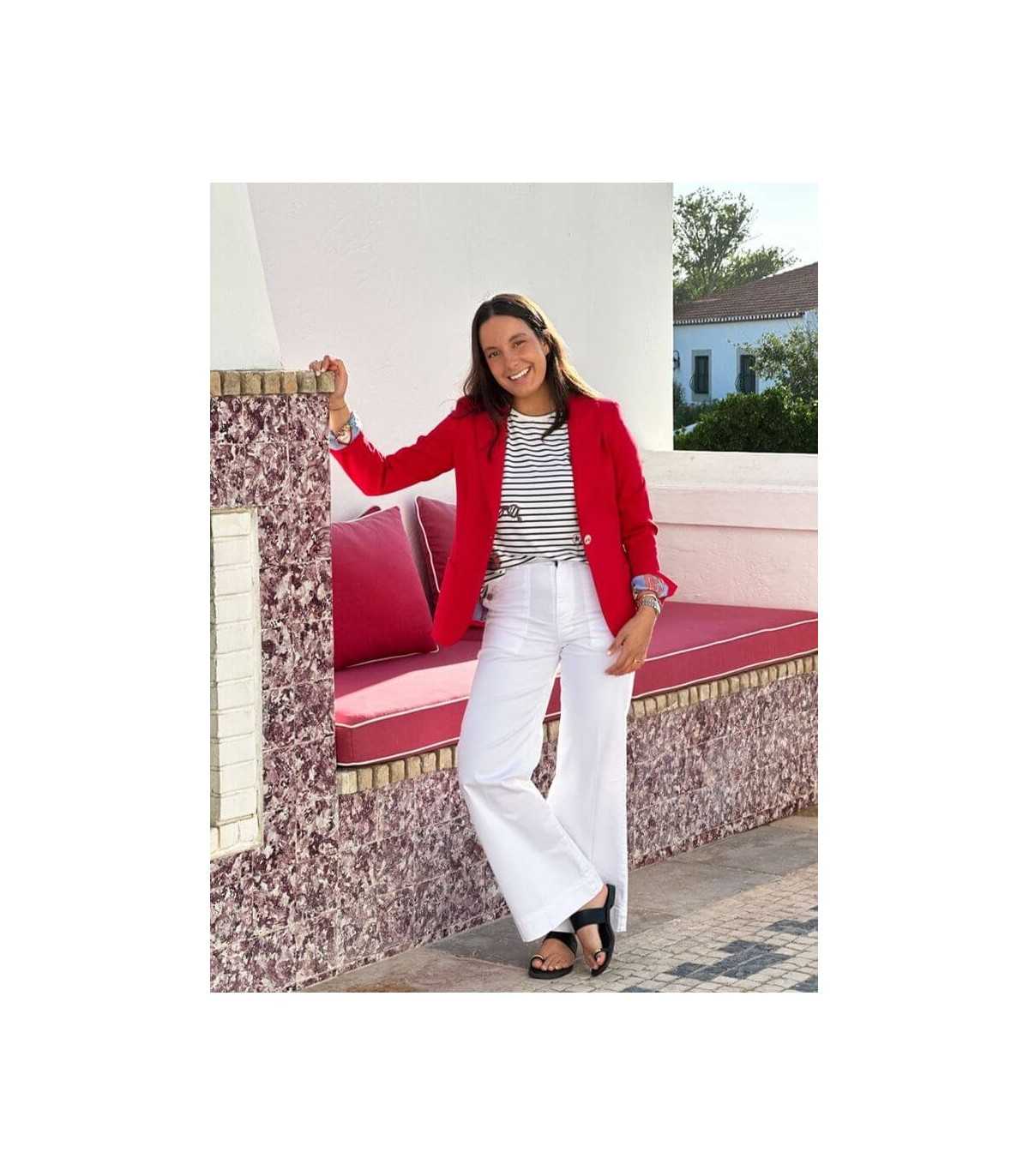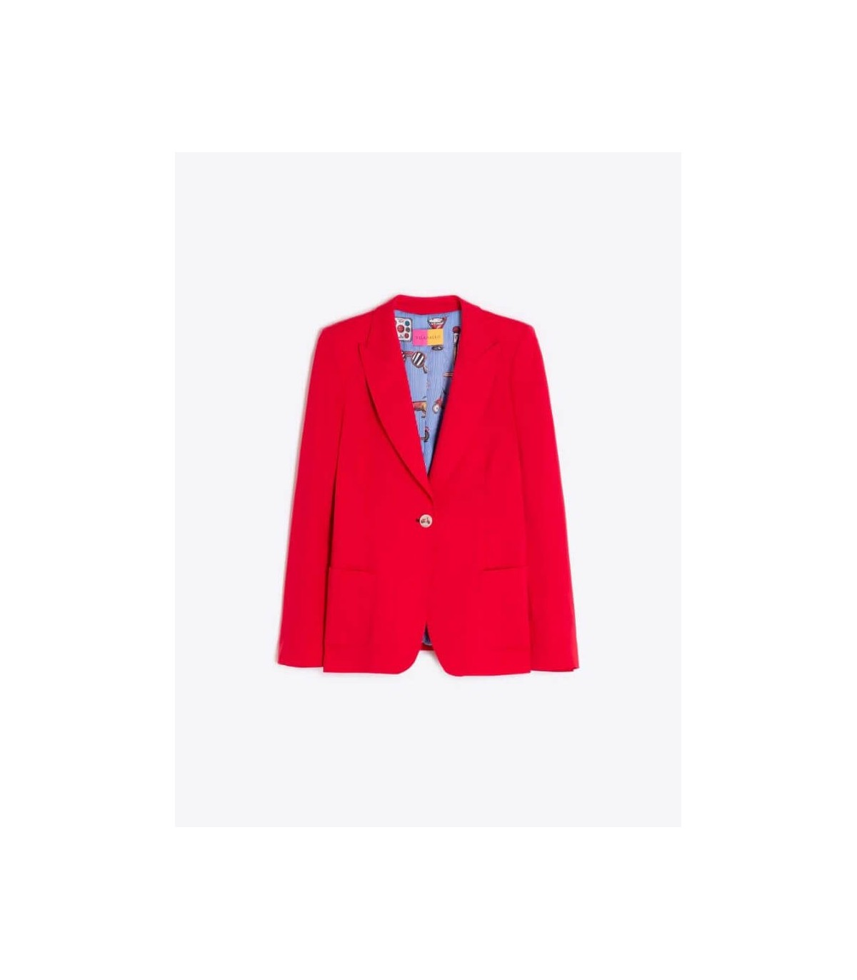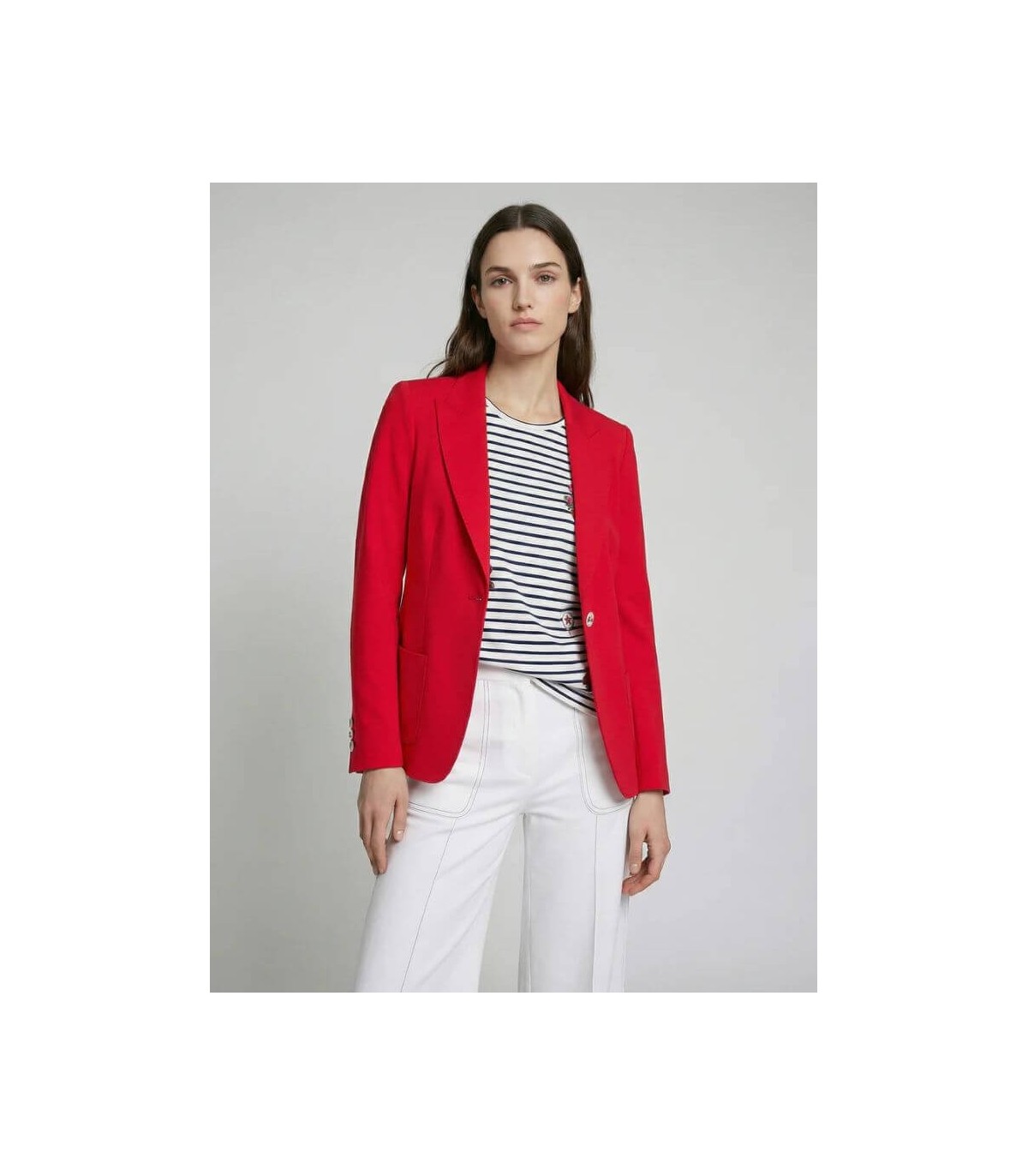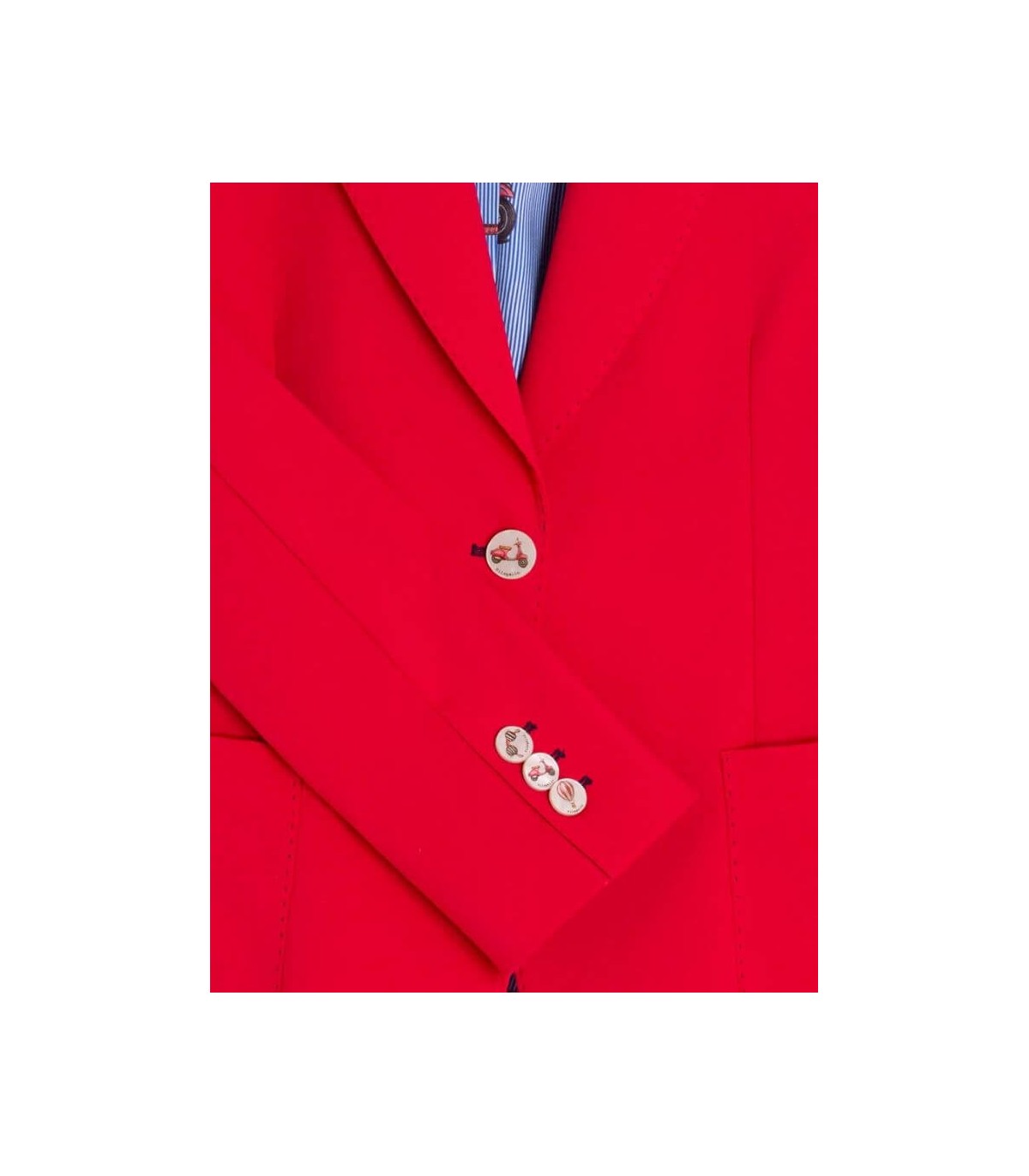 Chaqueta roja con solapa clásica y cierre de botón ilustrado. Incluye dos bolsillos de parche con pespunte visible y forro interior, de la marca española Vilagallo.