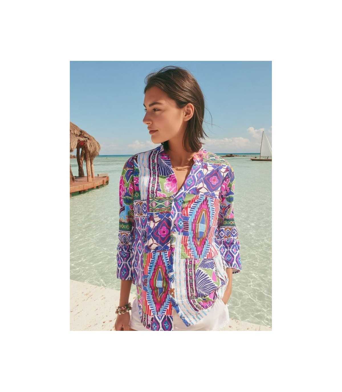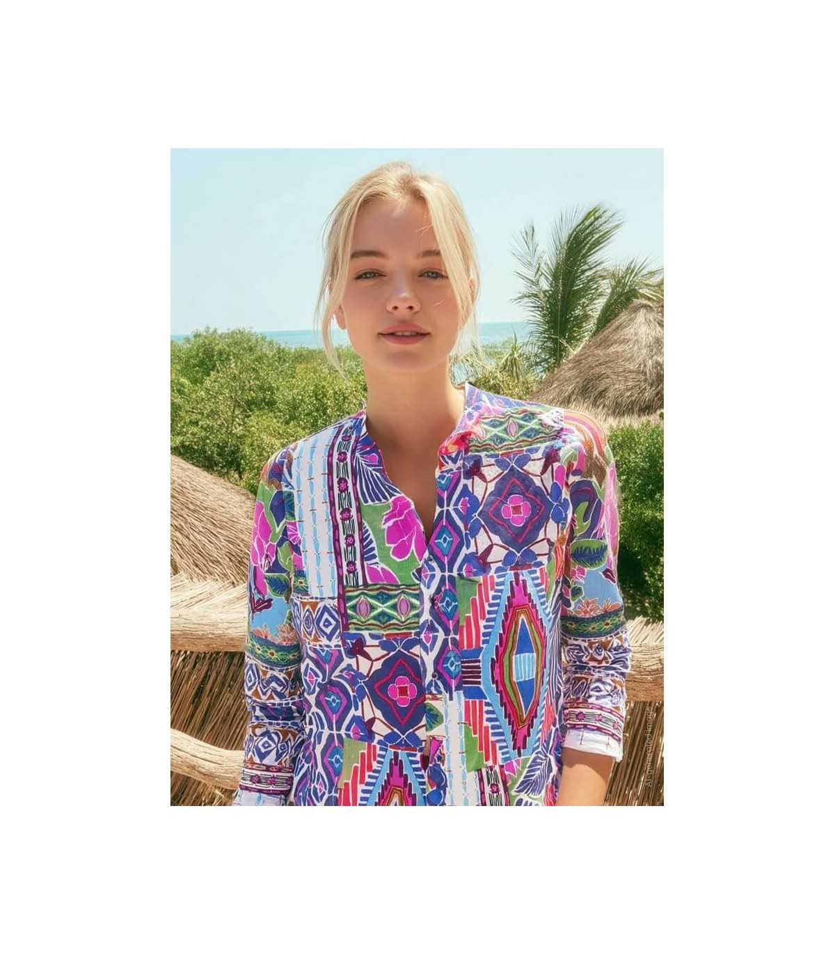 Camisa estampado geométrico multicolor, cuello tirilla con escote en forma de V, cierre de botones delantero y manga francesa, de la marca española Vilagallo.