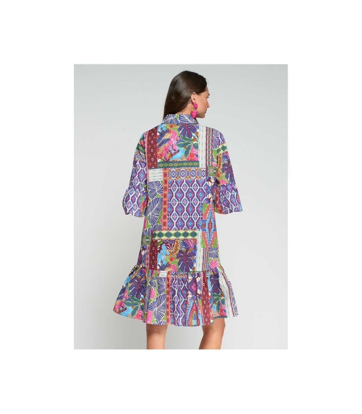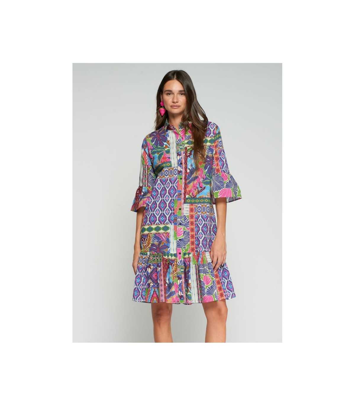 Vestido camisero cortp, estampado patchwork multicolor con cierre de botones delantero, línea recta, manga tres cuartos, terminación de mangas y bajos con volante, de la marca española Vilagallo.