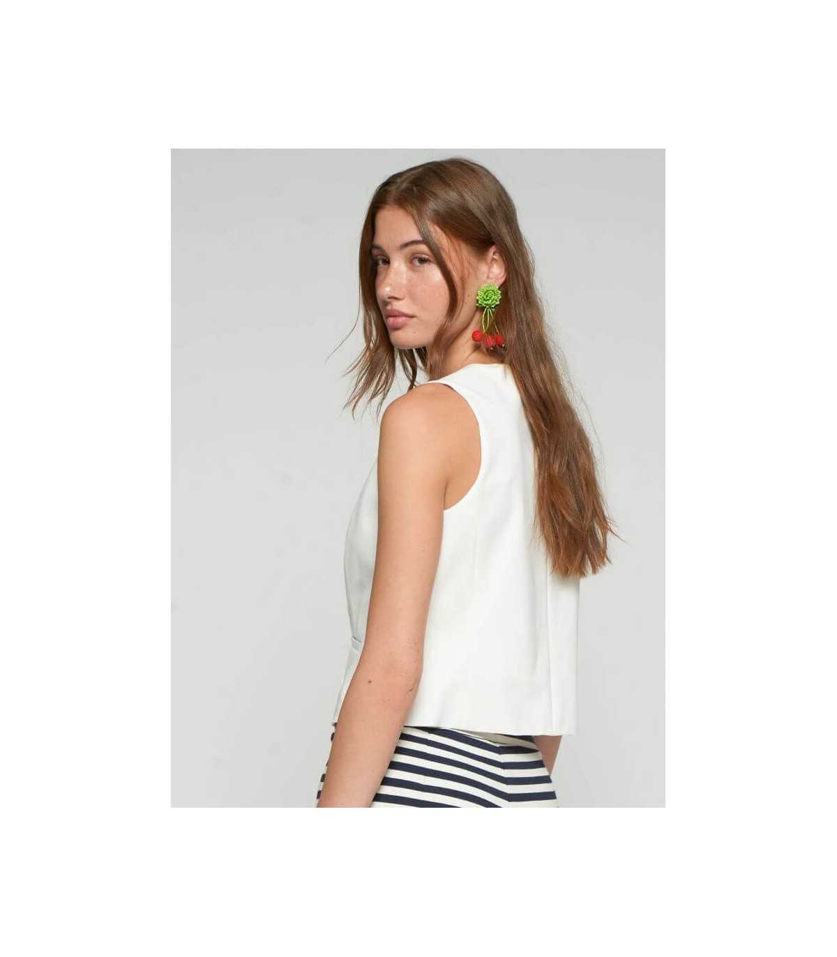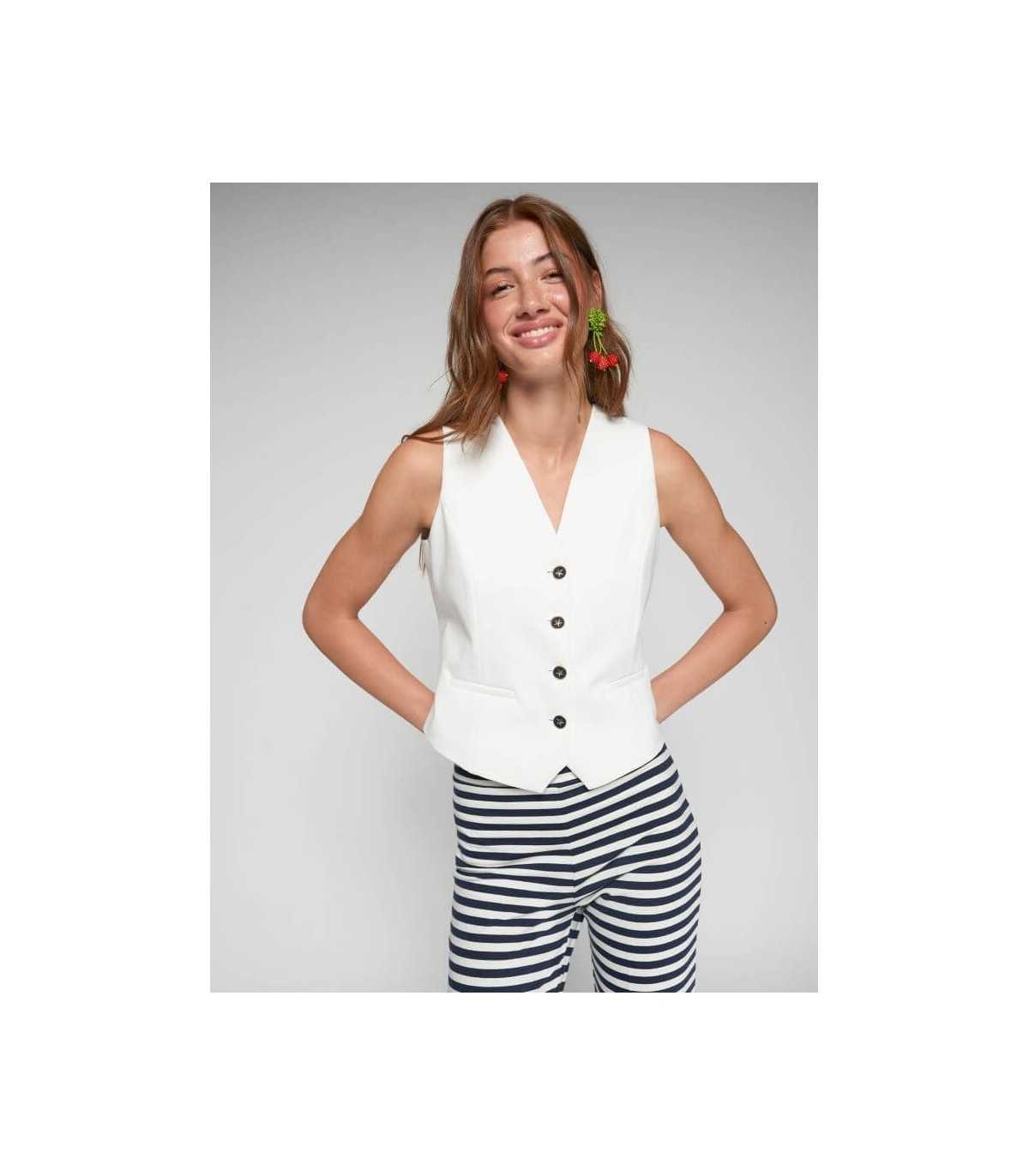 Chaleco blanco con escote en pico y cierre frontal con botones. Bolsillos de vivo en la parte delantera y bajo acabado en pico, de la marca española Vilagallo.