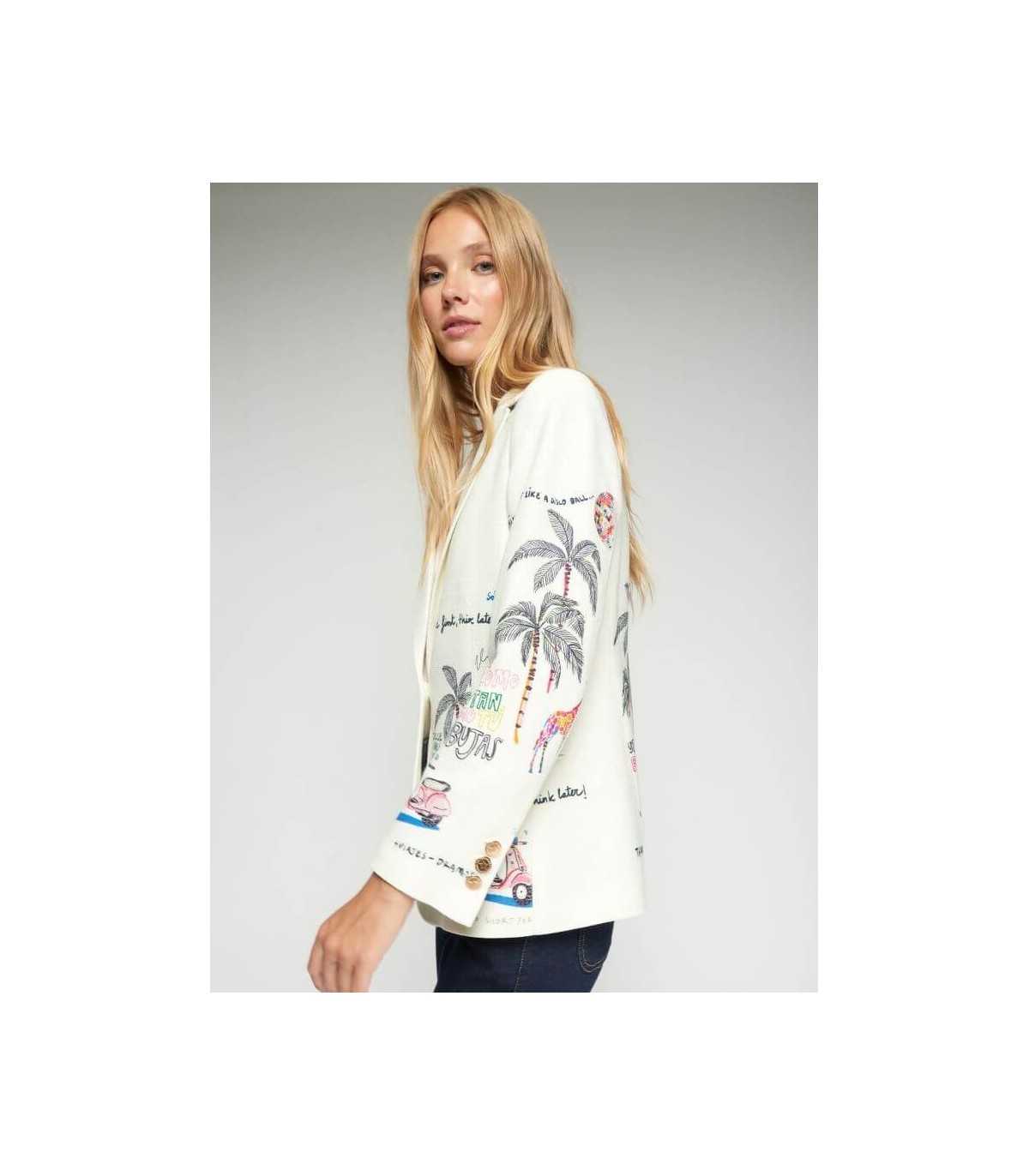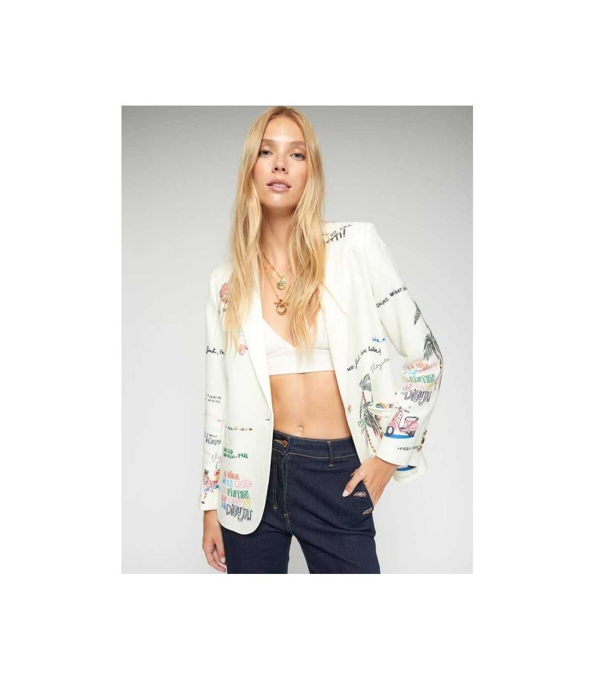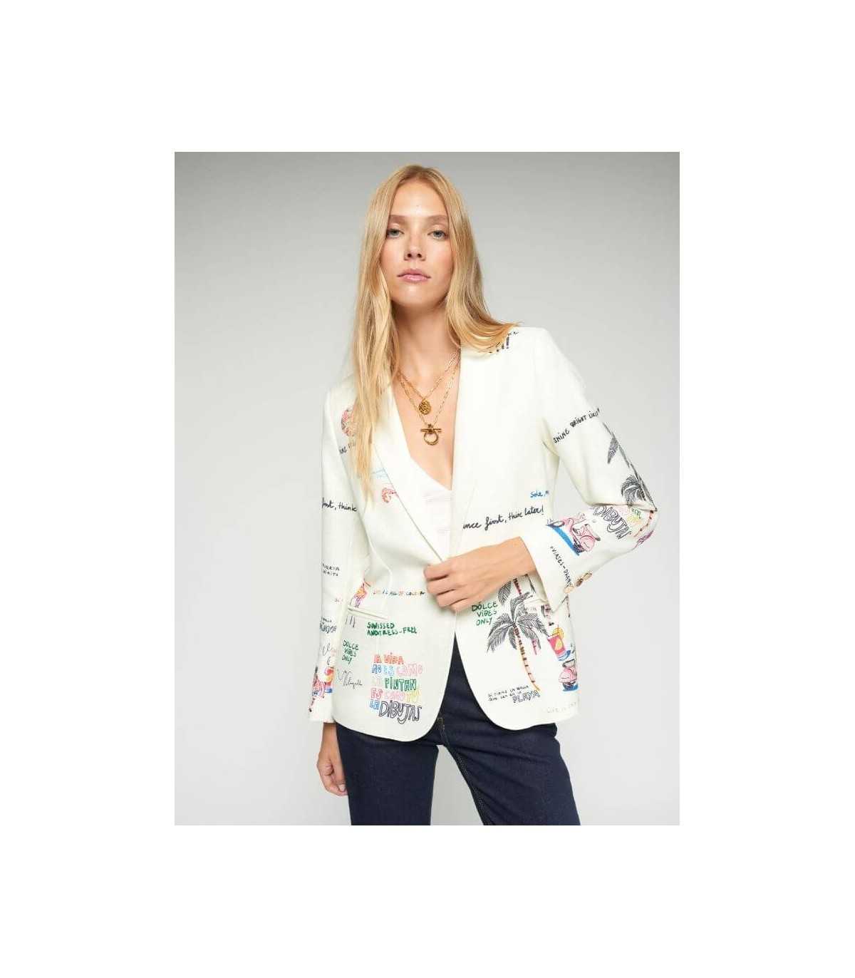 Chaqueta blanca de corte recto con estampado quirky multicolor de ilustraciones y mensajes gráficos. Diseño con solapa clásica, cierre frontal con botón y bolsillos de vivo. Manga larga. Interior forrado, de la marca española Vilagallo.