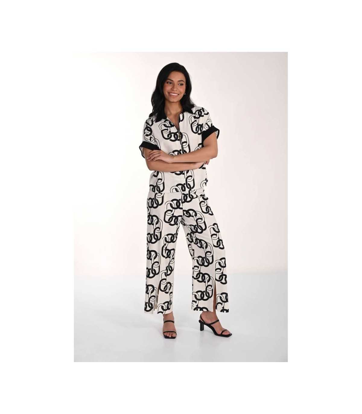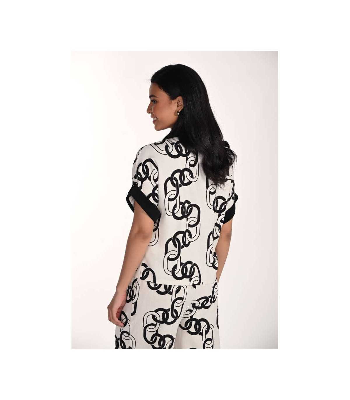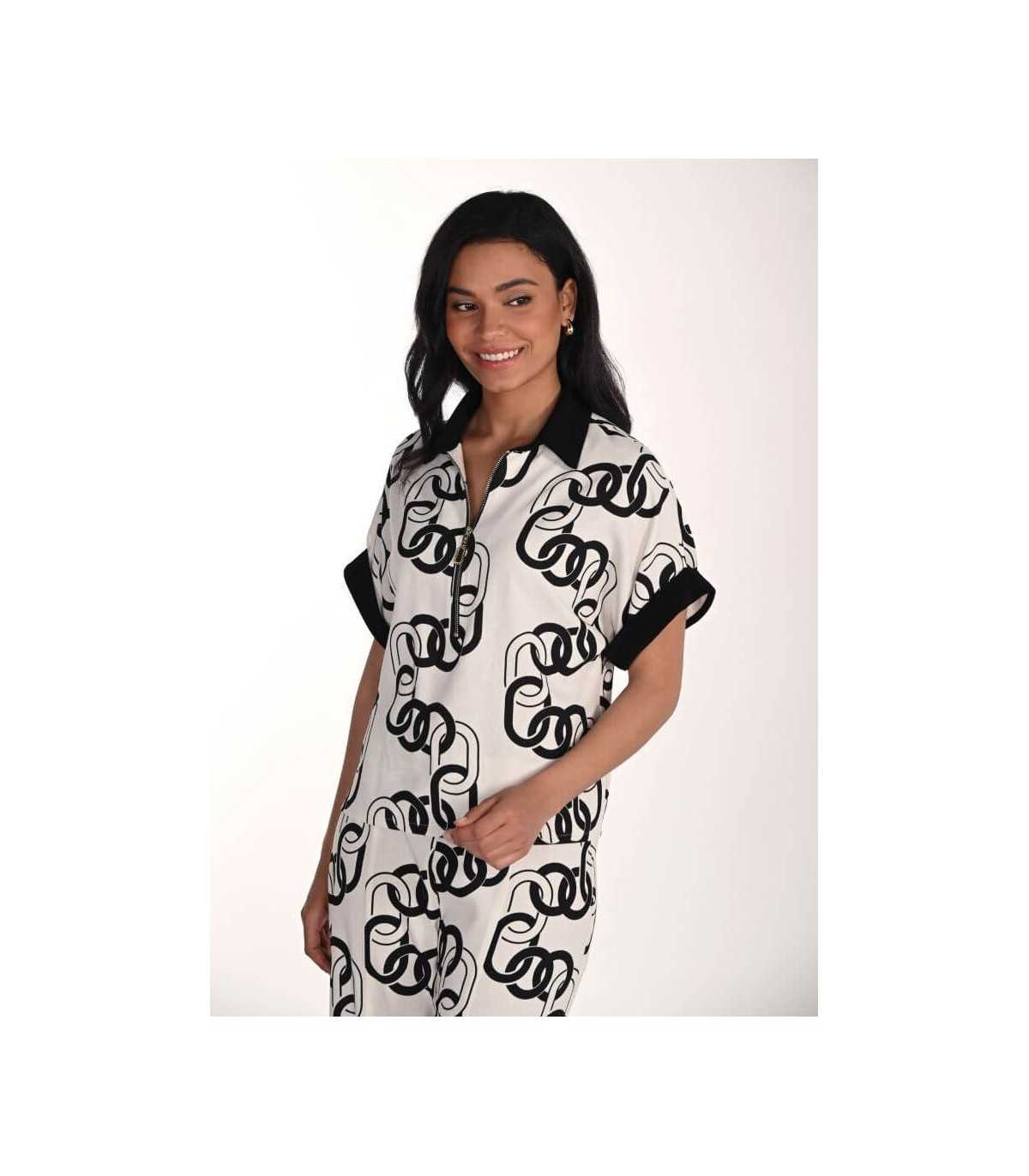 Top color blanco con estampación de cadenas en tono negro, cuello polo con cierre de cremallera, manga caída arremangada y línea recta, de la marca canadiense Frank Lyman.
