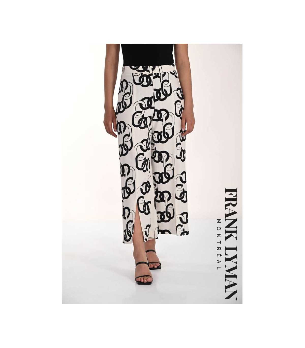 Pantalón culotte,, color blanco con estampado de cadenas en color negro, cinturilla elástica y dos aberturas en la terminación del bajo, de la marca canadiense Frank Lyman.
