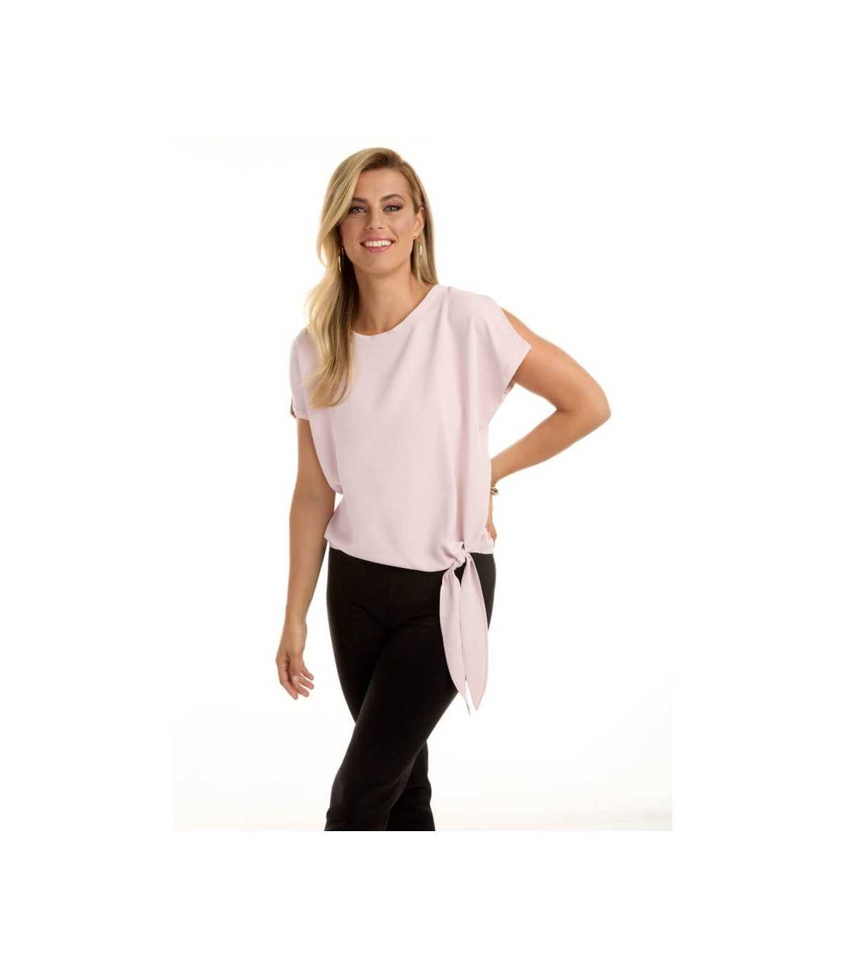 Top manga caída con abertura, color rosa muy claro y ajuste de lazo en el bajo, de la marca canadiense Frank Lyman.