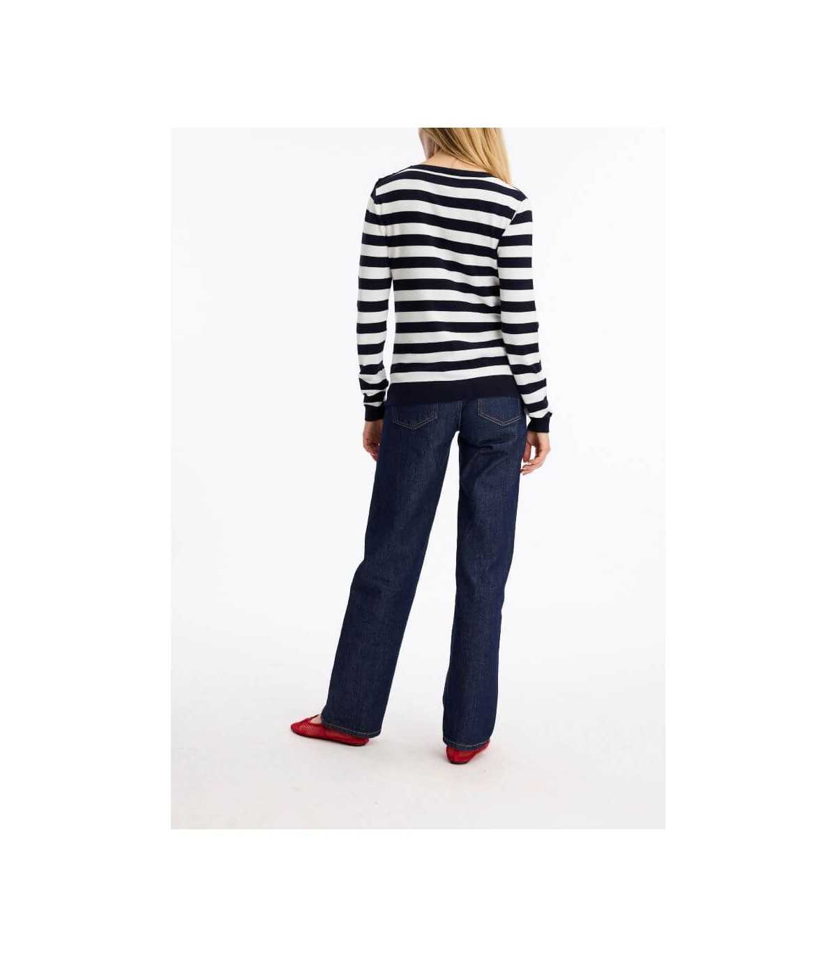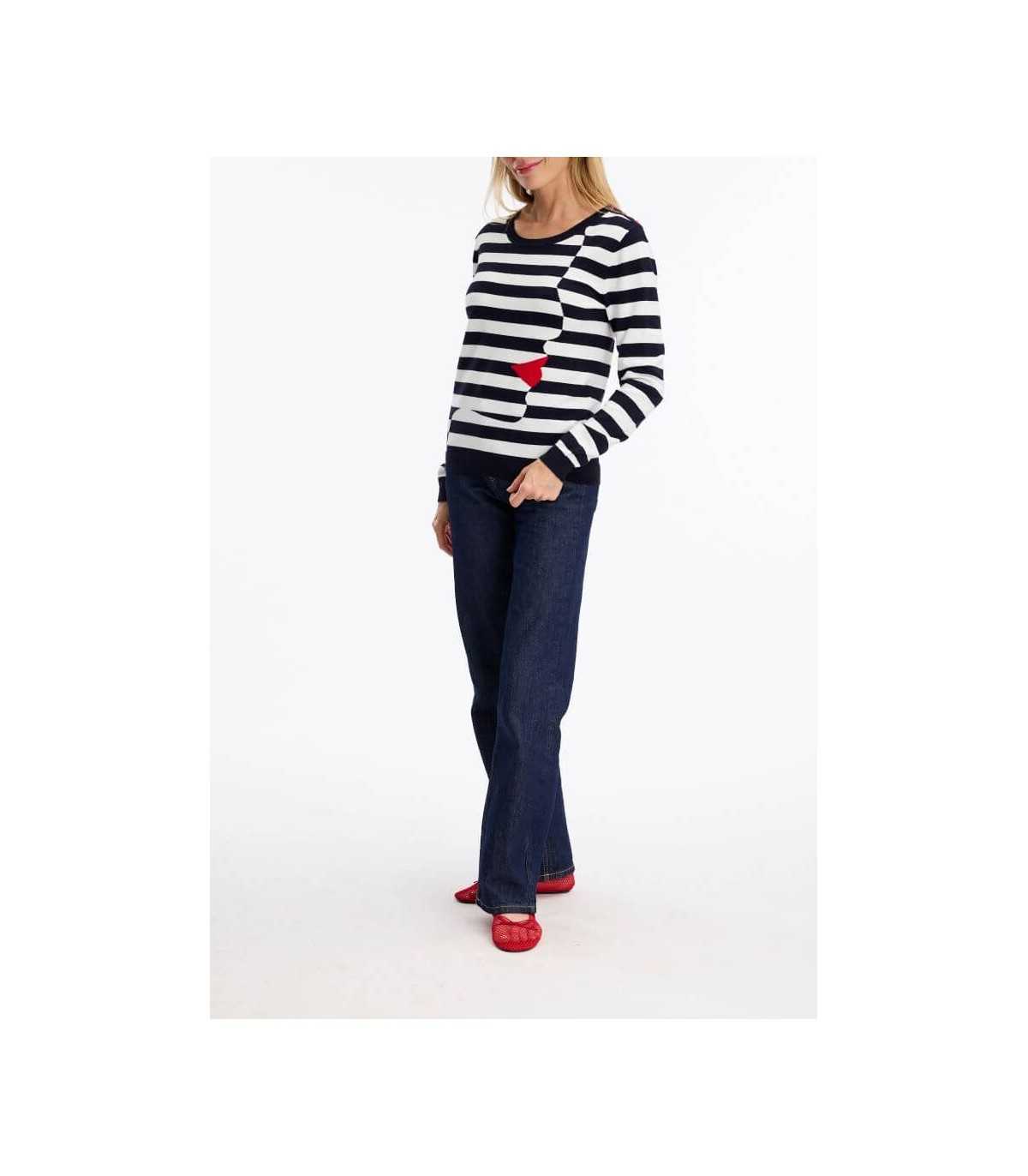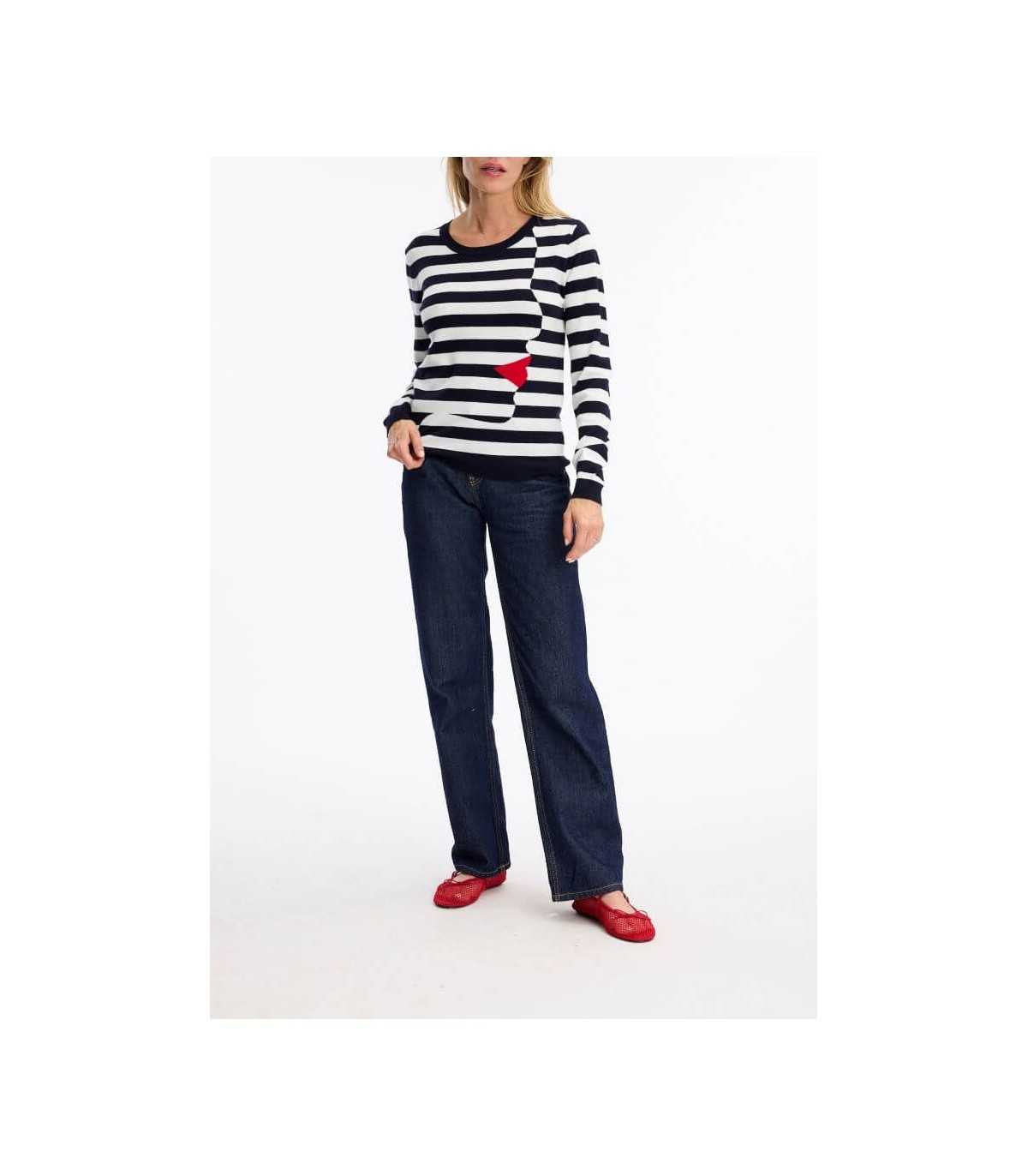 Suéter de rayas formando perfil silueta cara mujer, en color azul marino y blanco, manga larga y cuello redondeado, de la marca francesa Leo&Ugo.