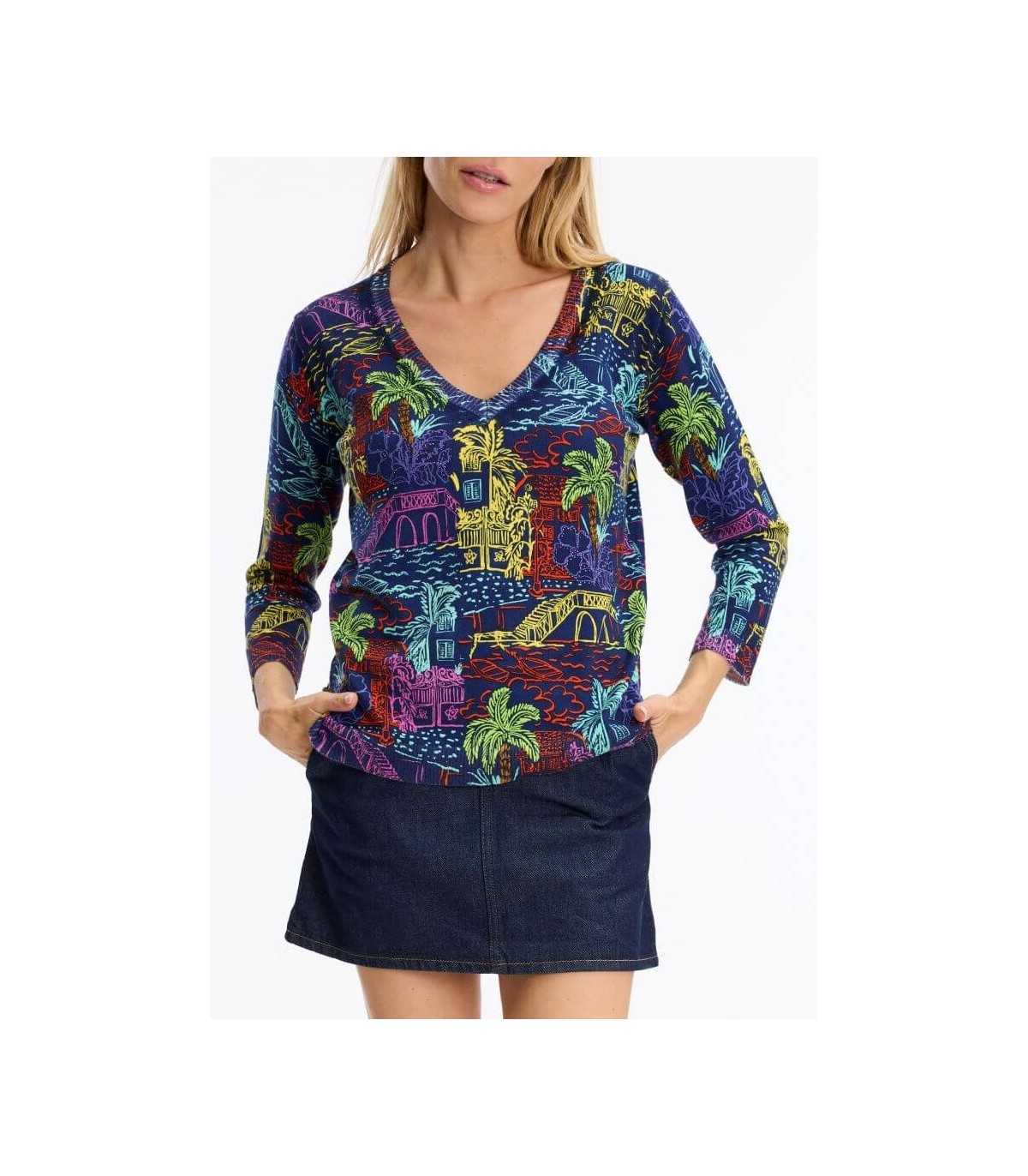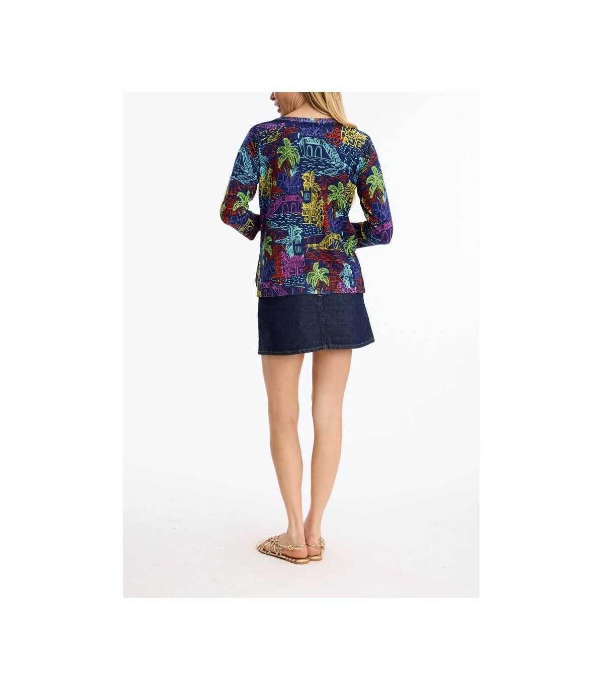Suéter color azul marino con estampación de paisajes en colores con aplicaciones de strass de cristal, manga tres cuartos y escote de pico, de la marca francesa Leo&Ugo.