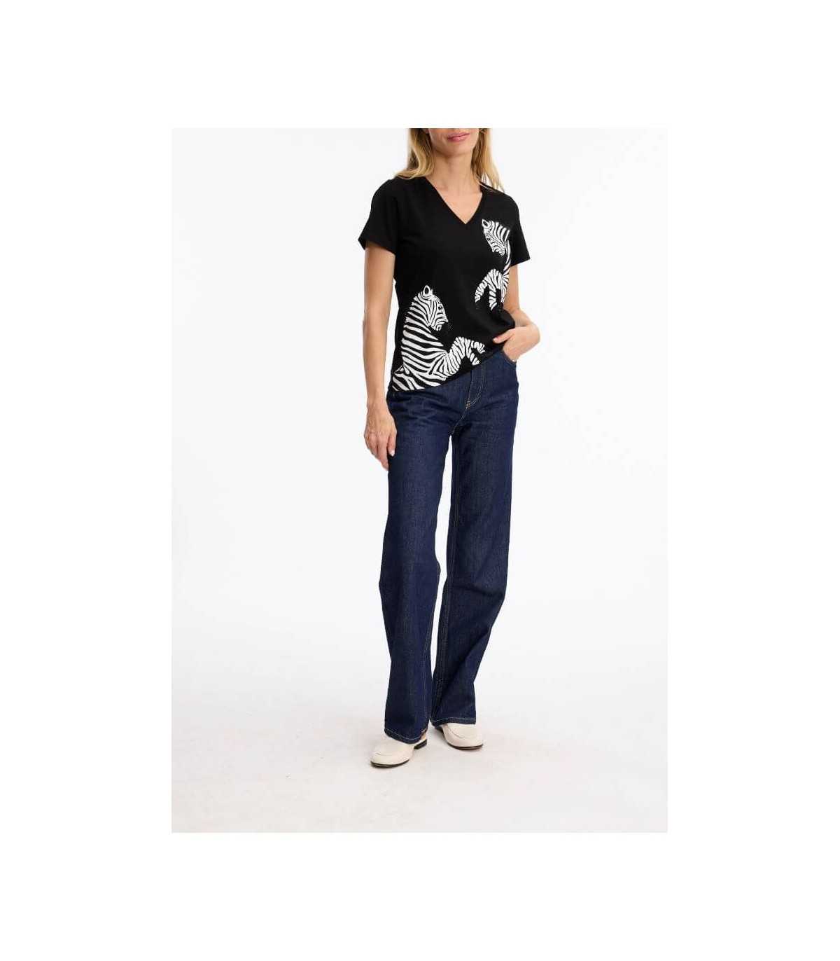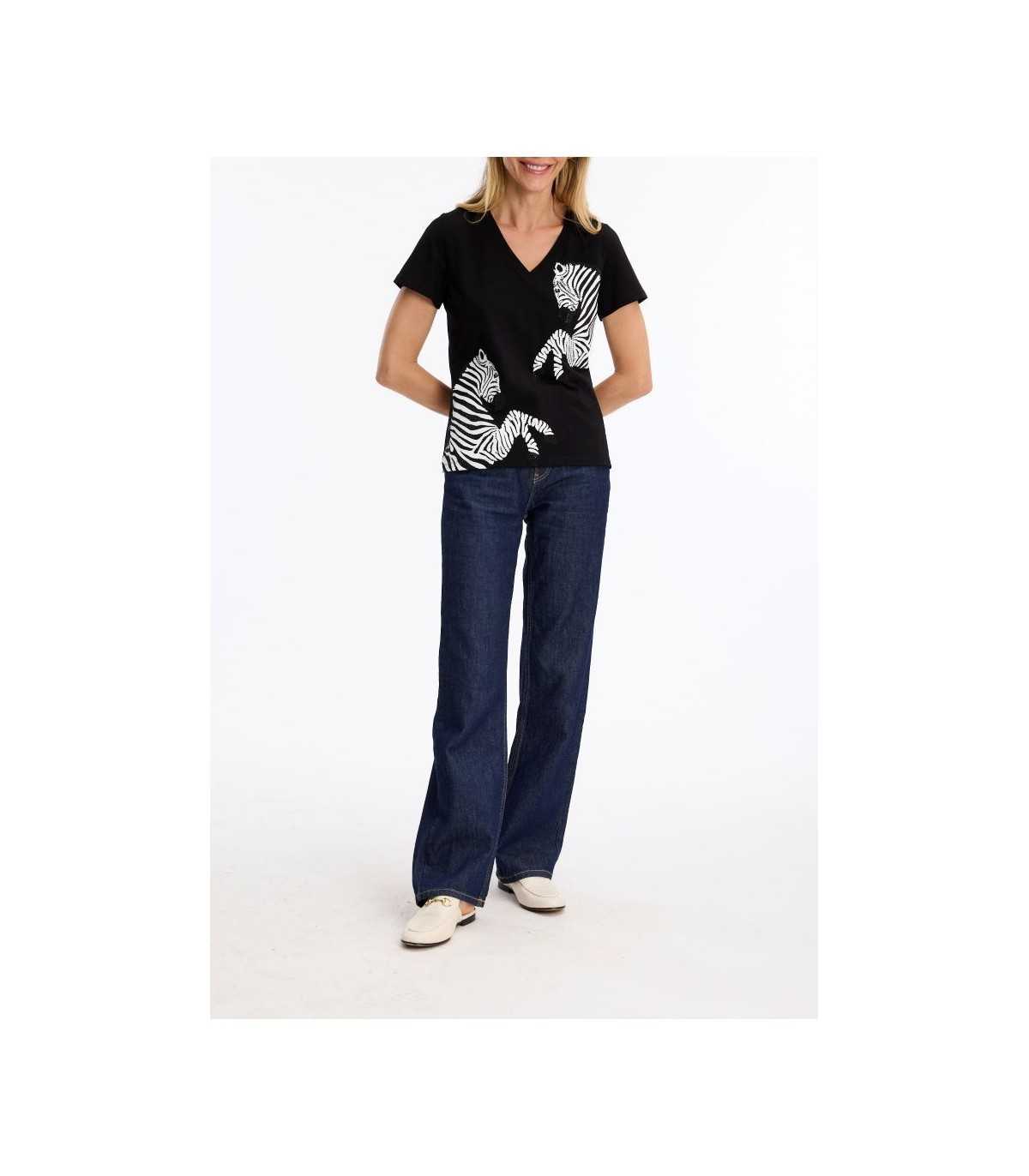 Camiseta en color negro con estampación de cebras en blanco, escote de pico y manga corta, de la marca francesa Leo&Ugo.