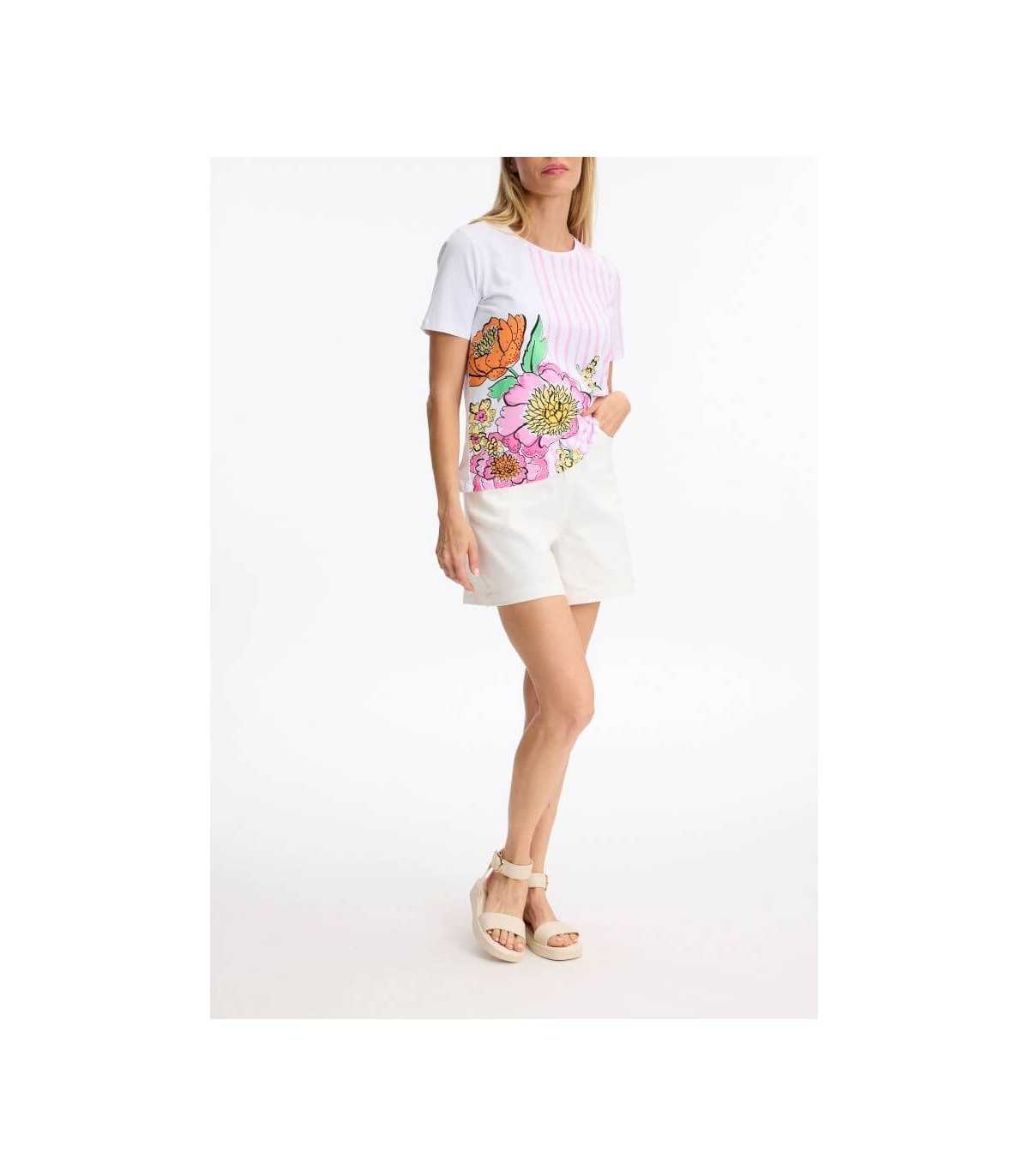 Camiseta color blanco con estampado de flores y rayas en color rosa, cuello redondeado y manga corta, del la marca francesa Leo&Ugo.