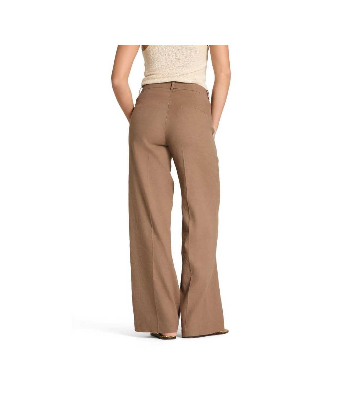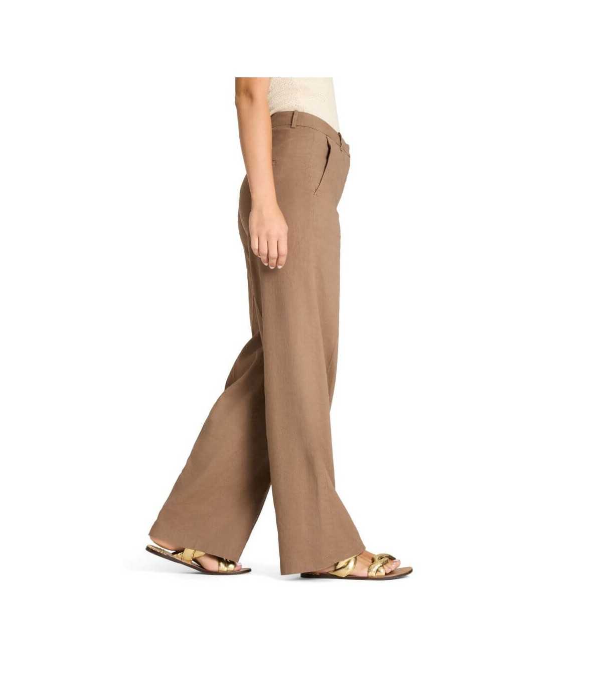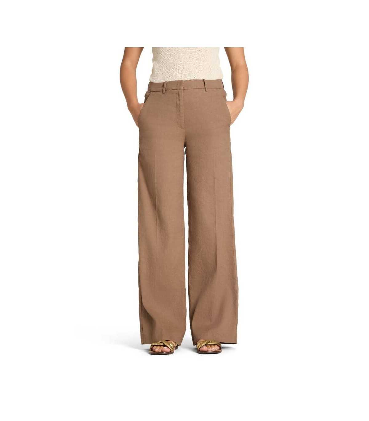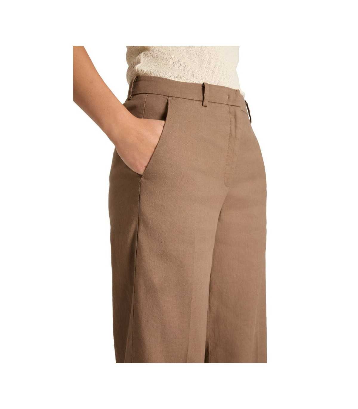 Pantalón color camel, corte recto, tejido de mezcla de lino y algodón, bolsillo francés y parte trasera de ojal, cierre delantero con corchete y cremallera, de la marca alemana Cambio.