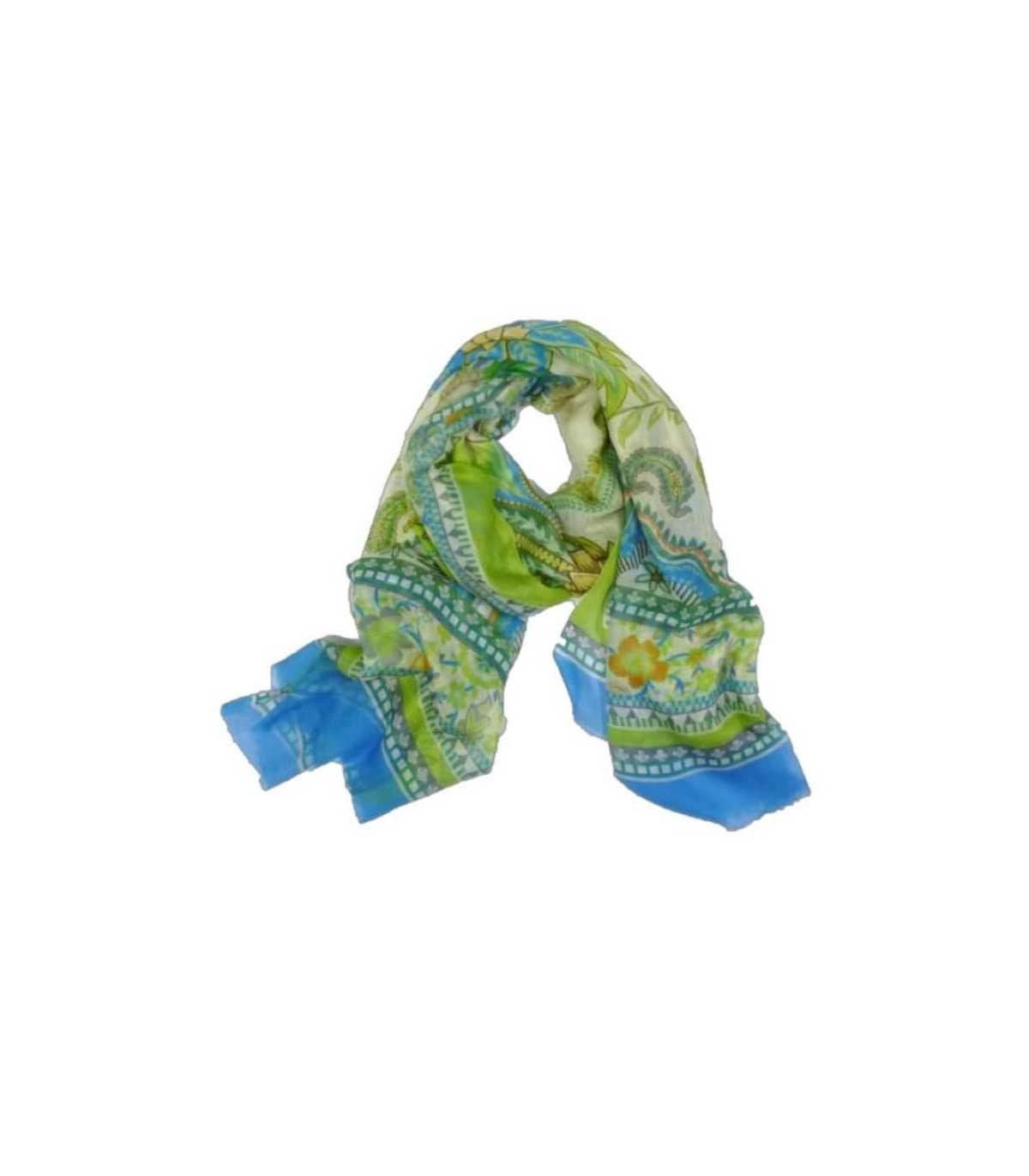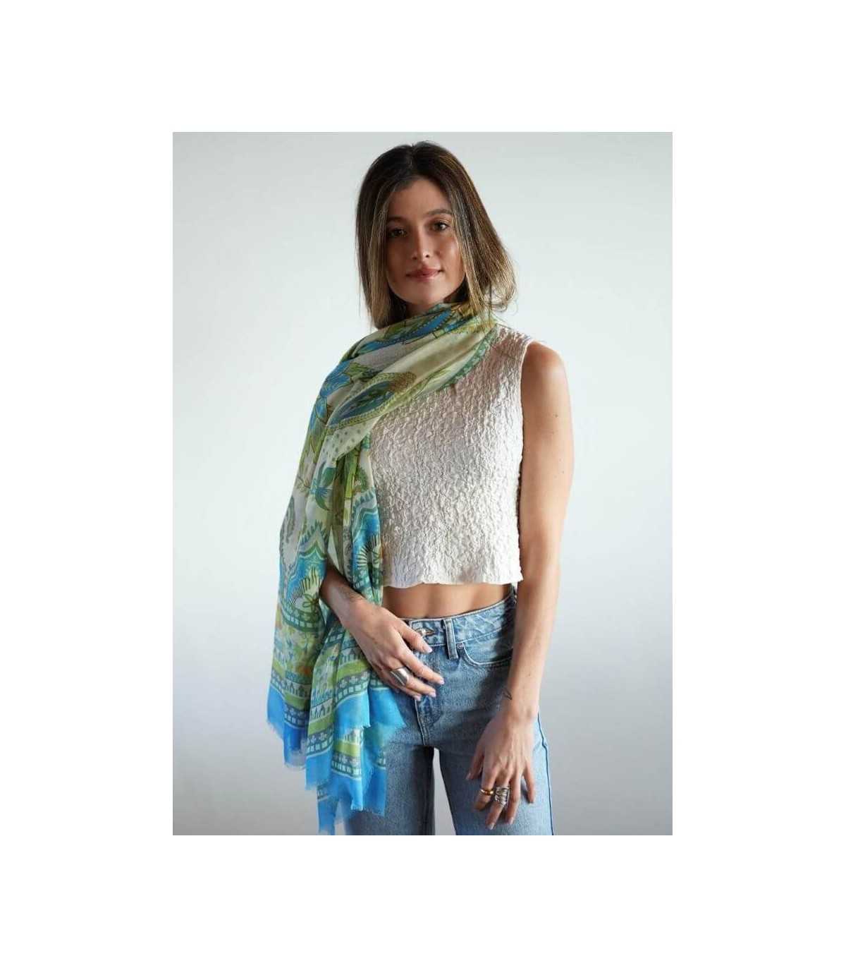 Chal estampado de flores en color verde y azul, de la marca española Noga.