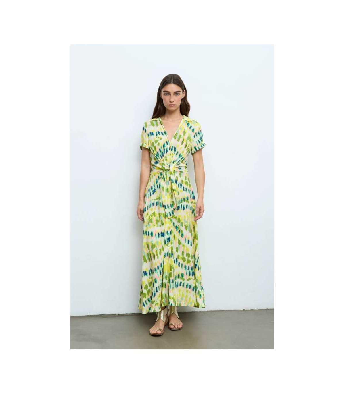 Vestido camisero, estampado en tonos verde, manga corta, cierre de botones en la parte delantera, recogido anudado a la cintura y terminación del bajo en forma evasé, de la marca española Aldo Martins.