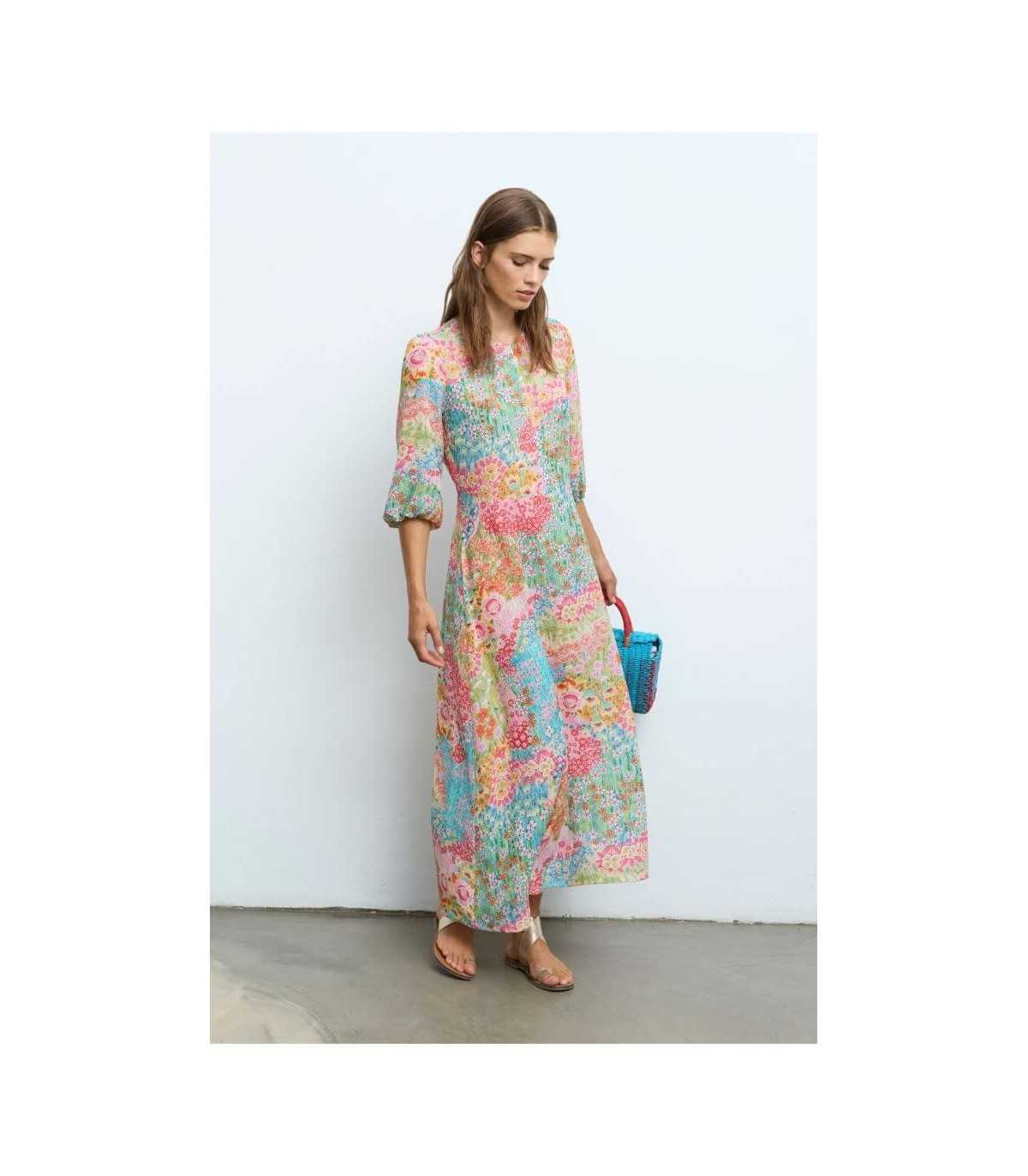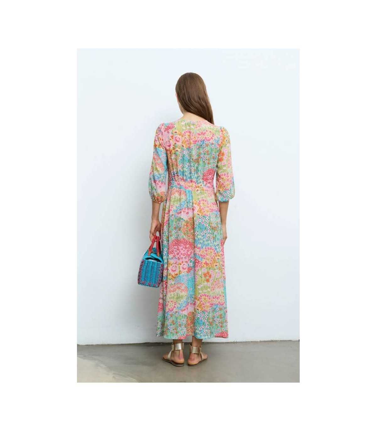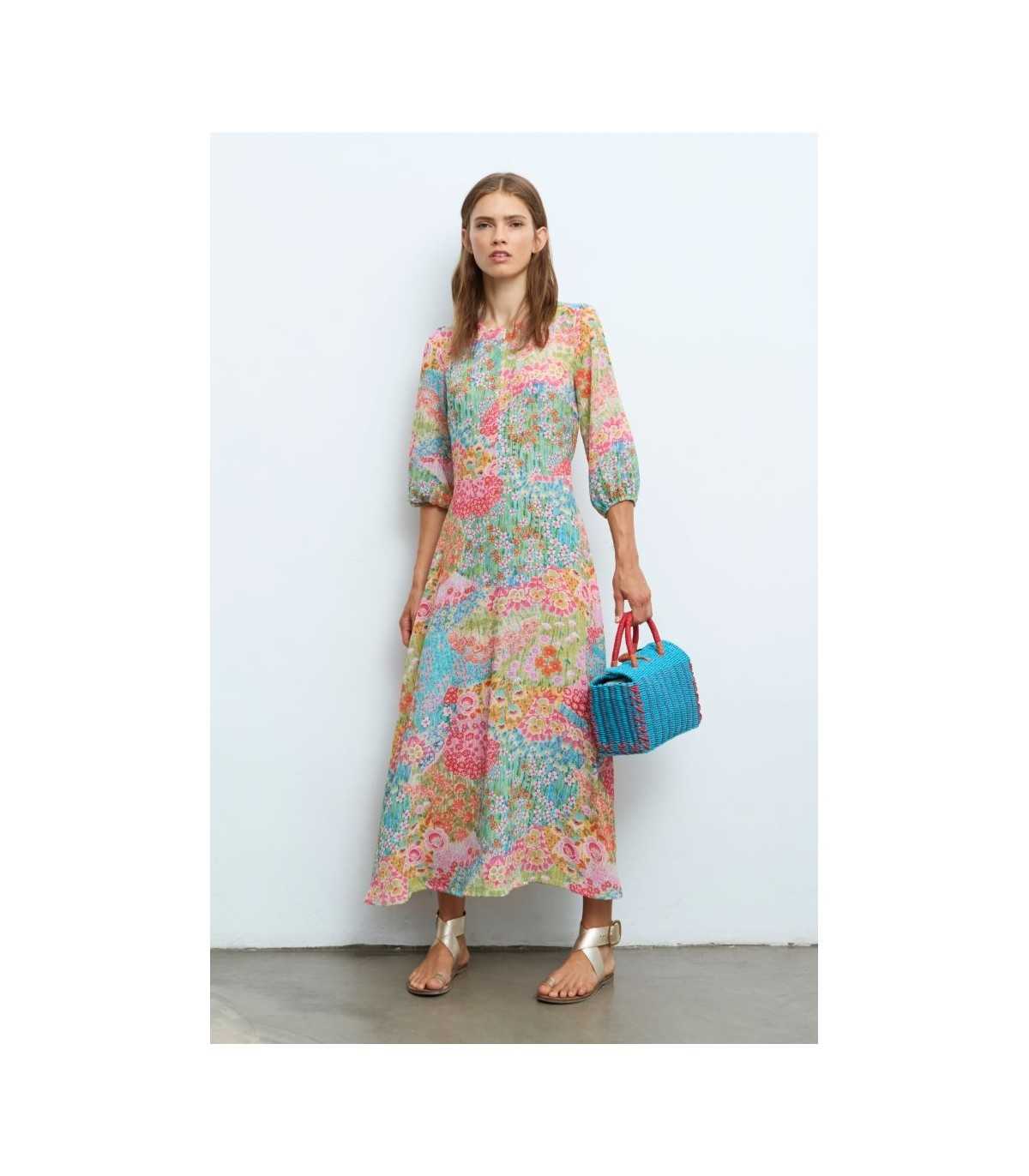 Vestido estampado de flores, cuello redondeado con cierre de cremallera, manga tres cuartos con puño elástico, goma de ajuste en la parte trasera de la cintura, terminación del bajo evasé y forro, de la marca española Aldo Martins.