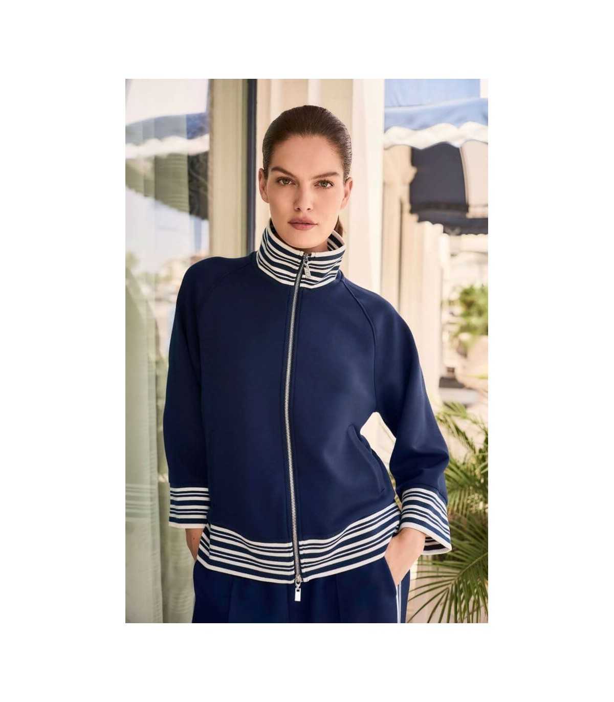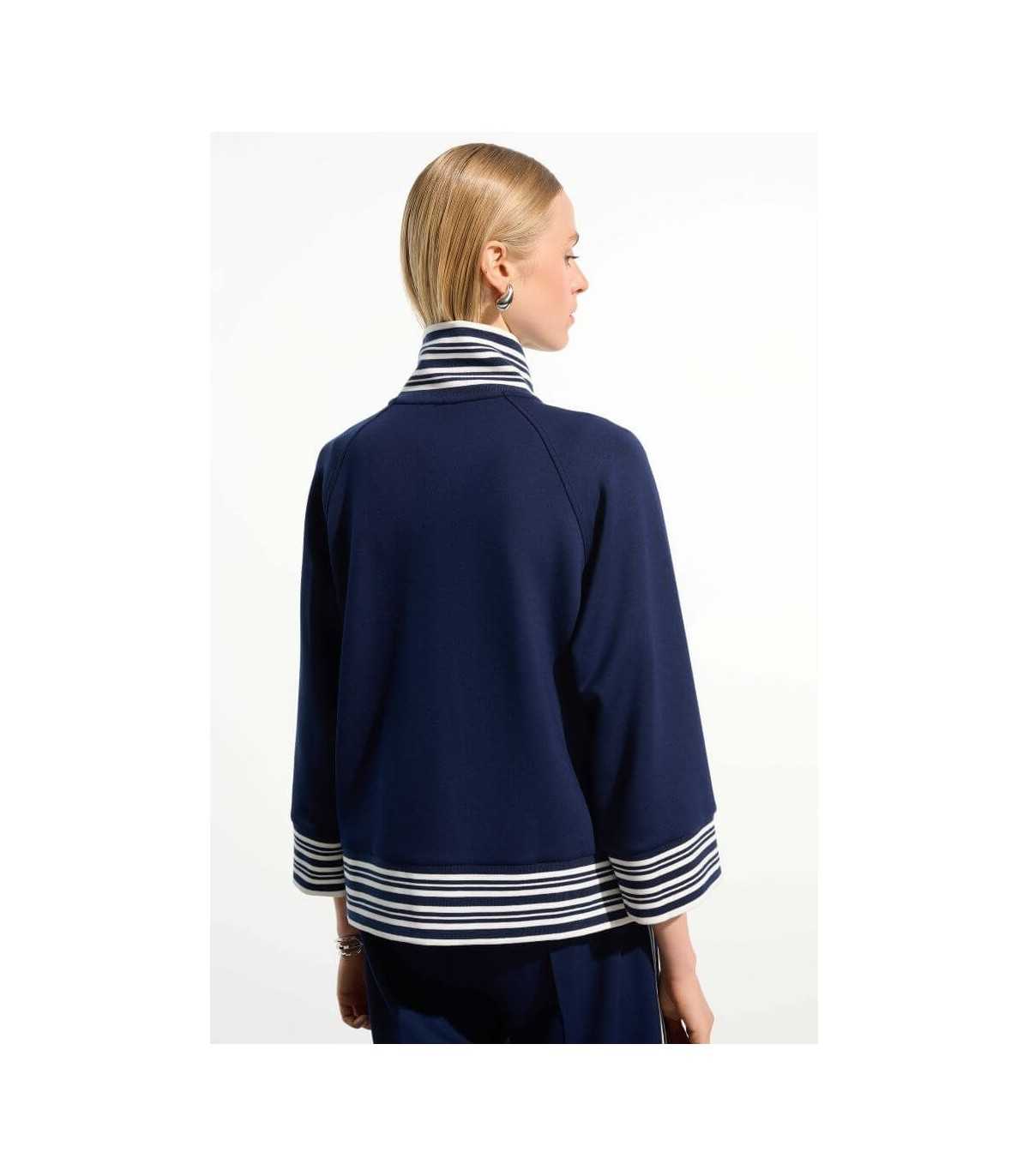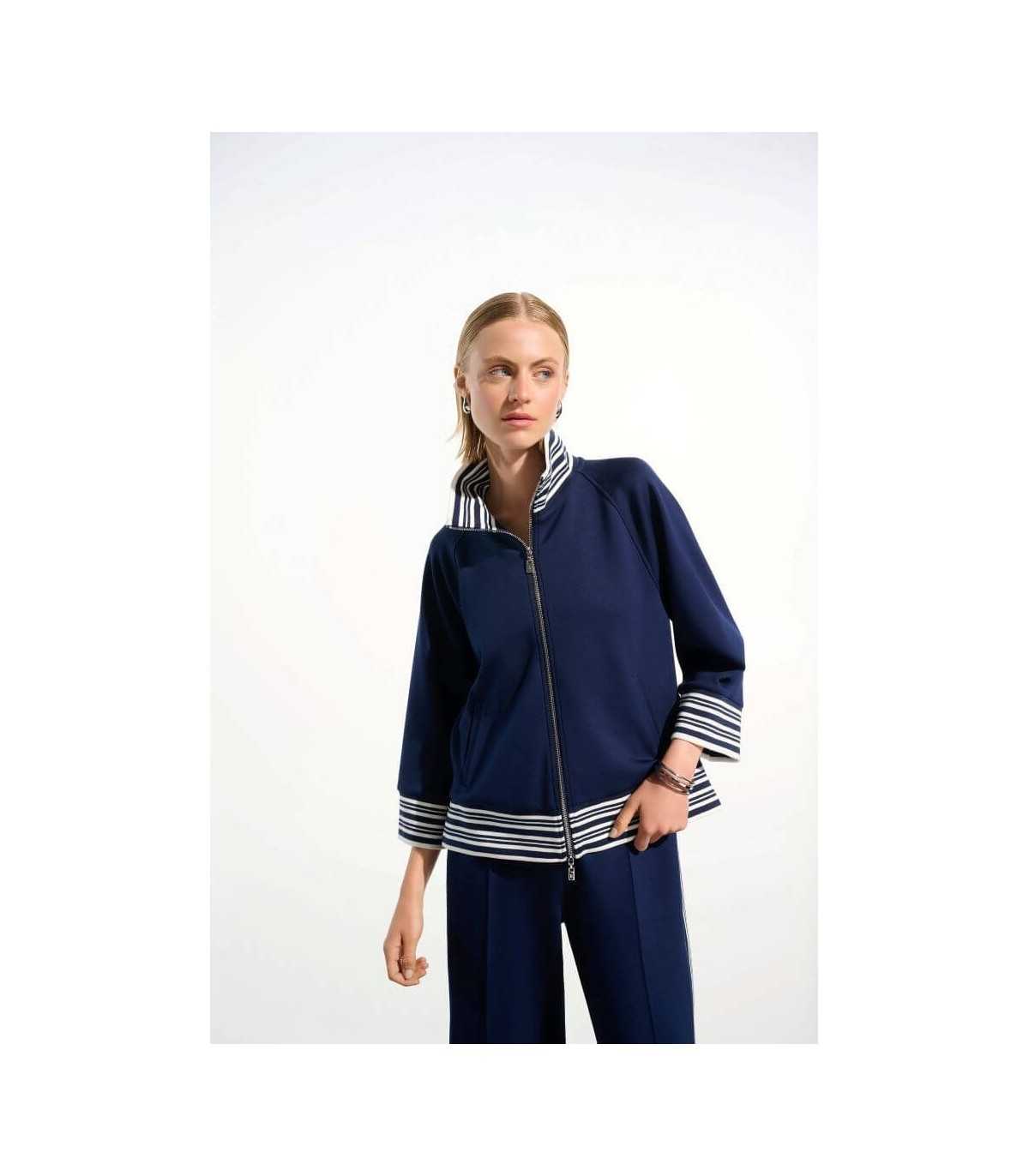 Chaqueta de jersey scuba con un toque deportivo, cierre de cremallera metálica delantera, ribete de canalé a rayas y mangas tres cuartos de raglán, de la marca canadiense Joseph Ribkoff.