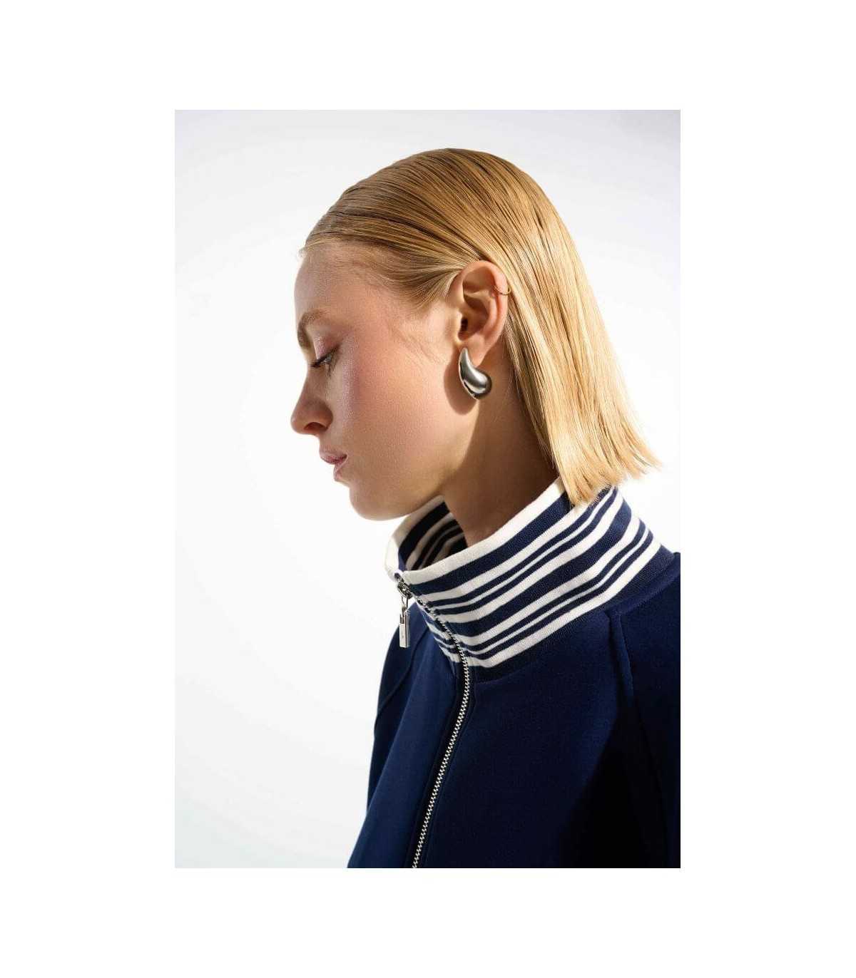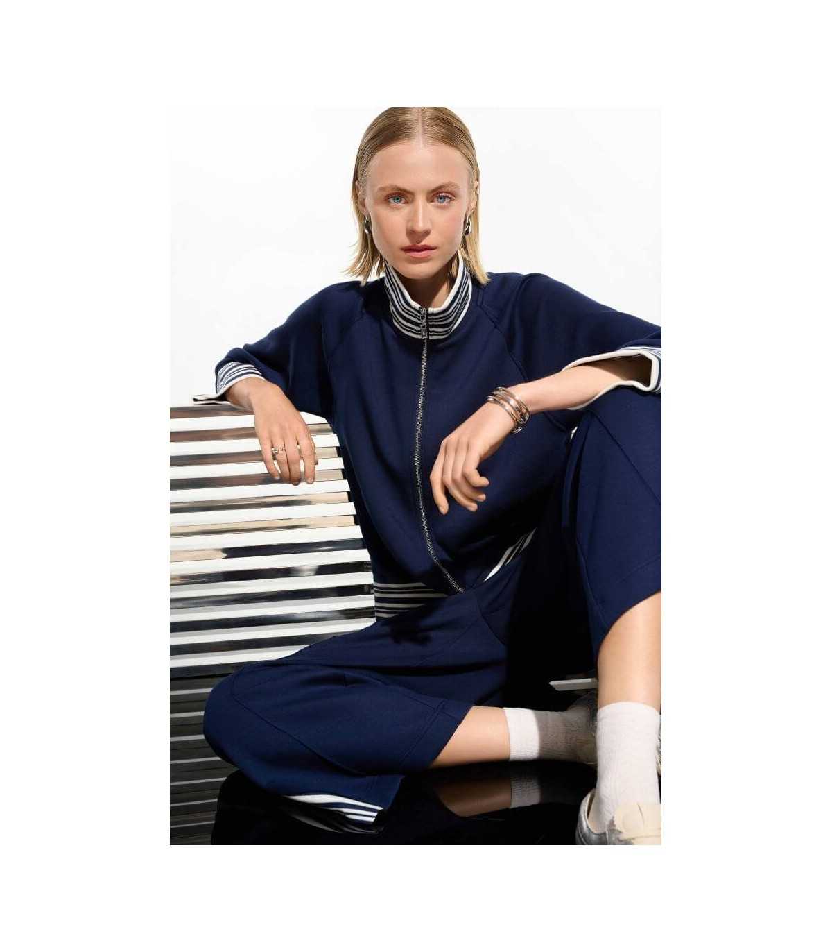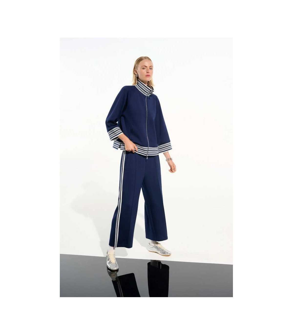 Chaqueta de jersey scuba con un toque deportivo, cierre de cremallera metálica delantera, ribete de canalé a rayas y mangas tres cuartos de raglán, de la marca canadiense Joseph Ribkoff.