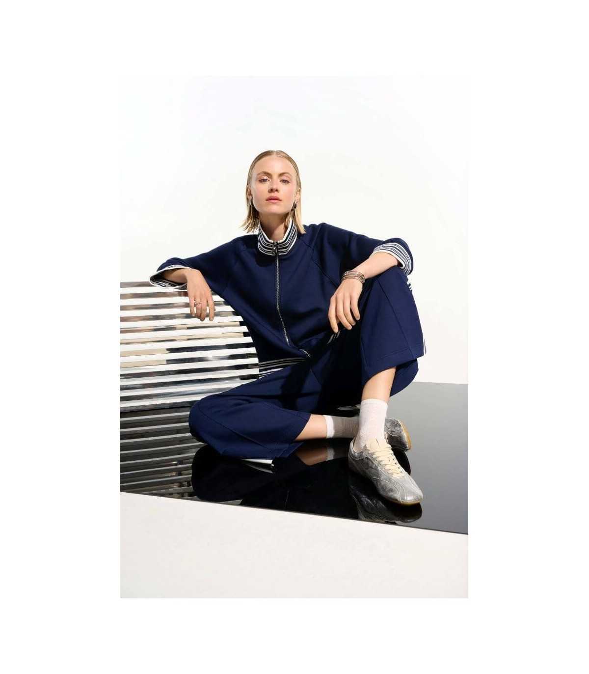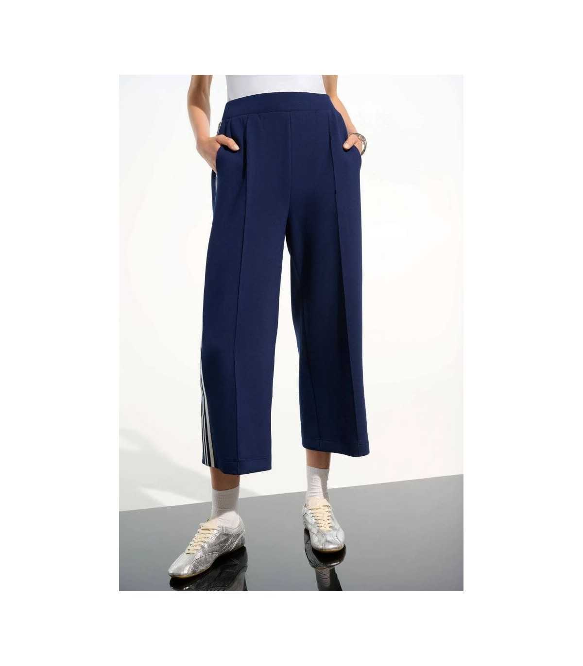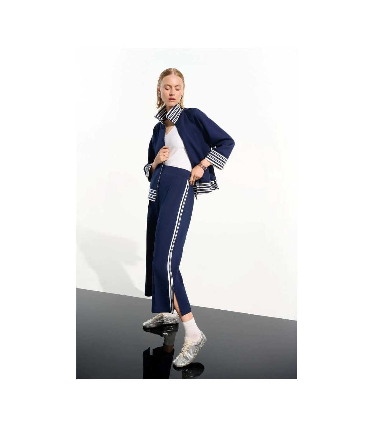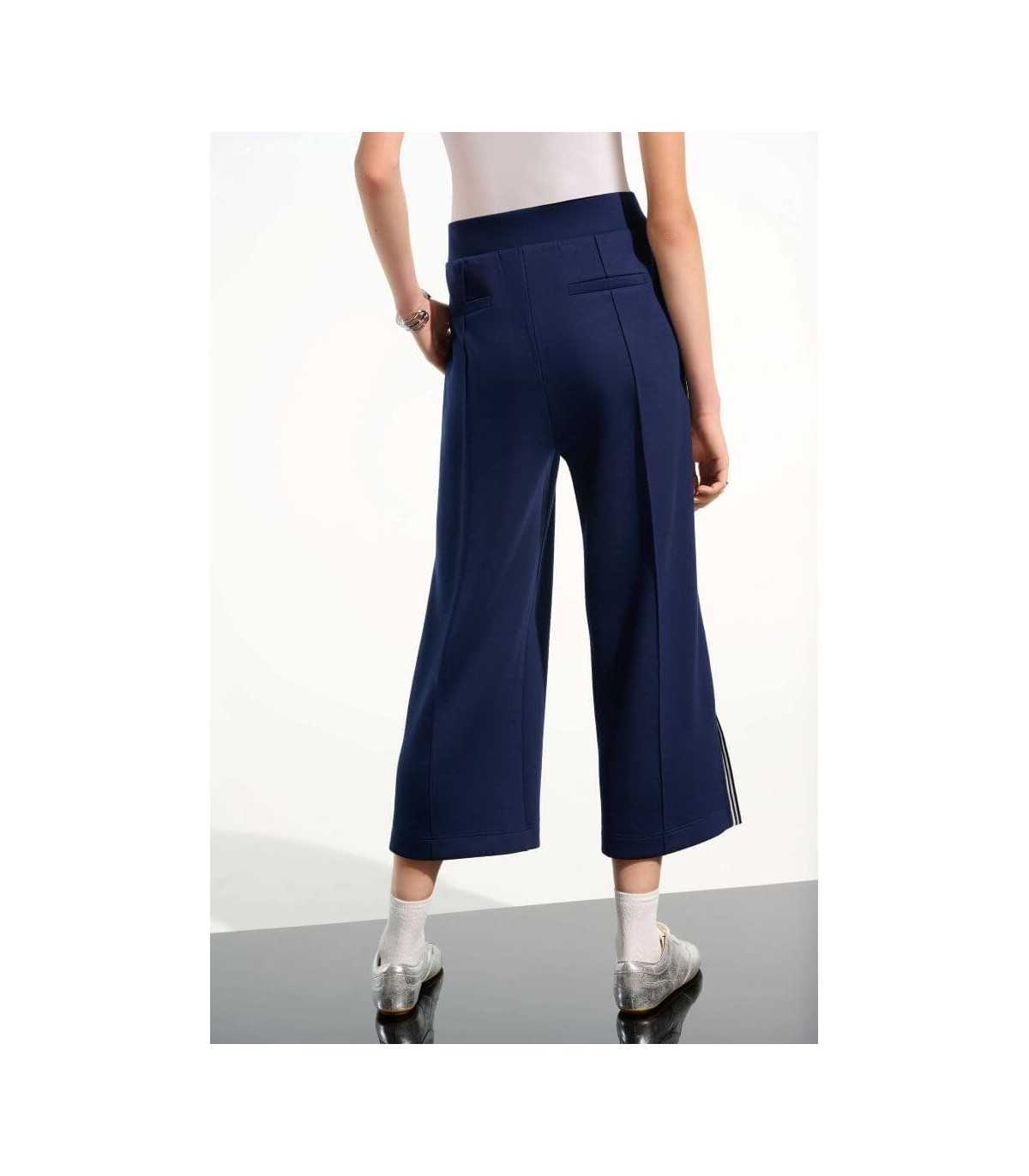 Pantalón deportivo culotte, color marino con rayas en blanco, cintura elástica y corte recto, de la marca canadiense Joseph Ribkoff.