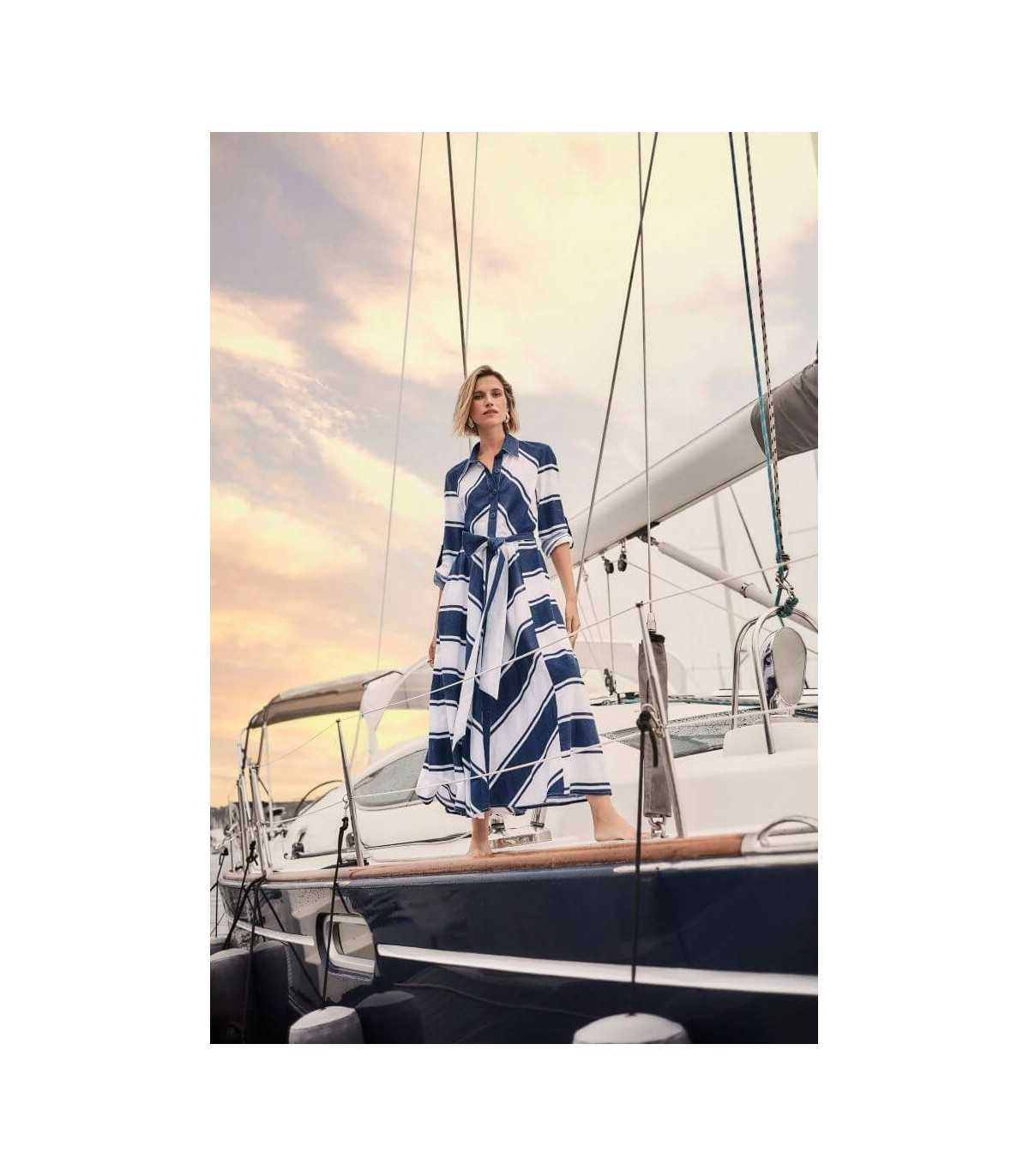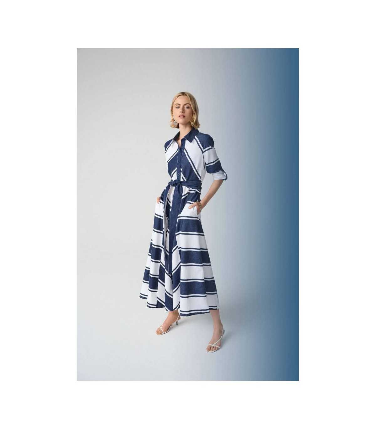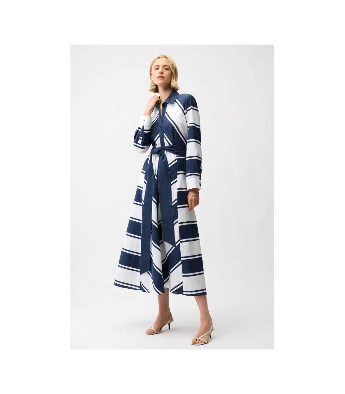 Vestido en tejido de algodón, tipo camisero, estampado de rayas, cuello camisa y tapeta delantera con botones, manga tres cuartos con lengüetas y fajín liso reversible, de la marca canadiense Joseph Ribkoff.