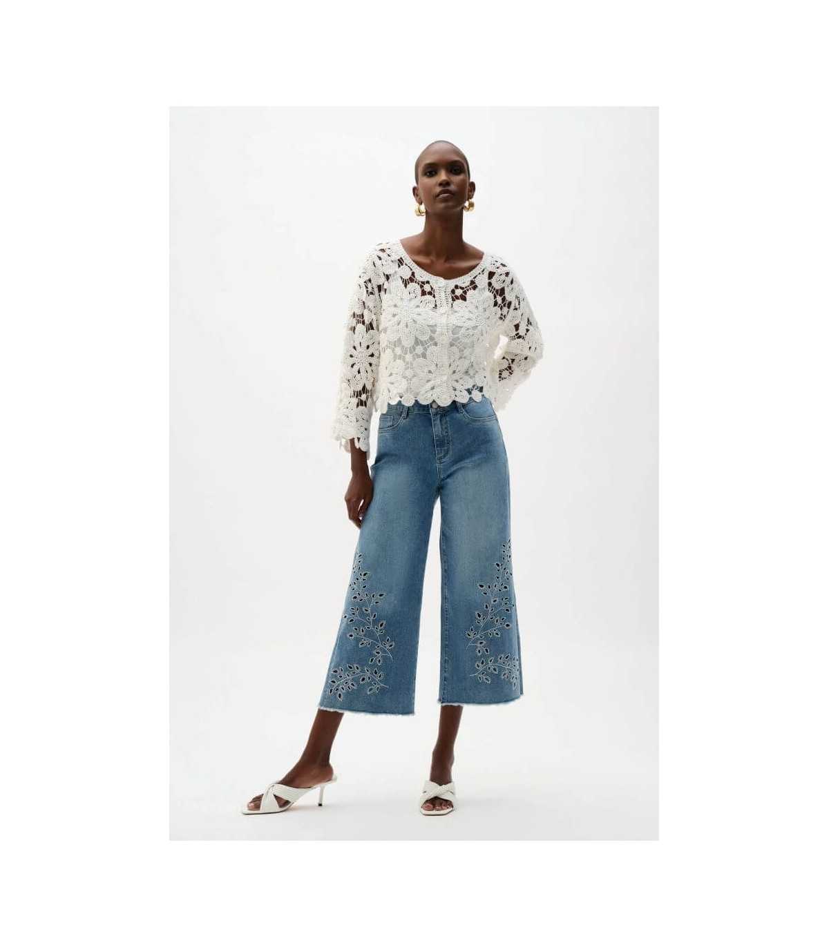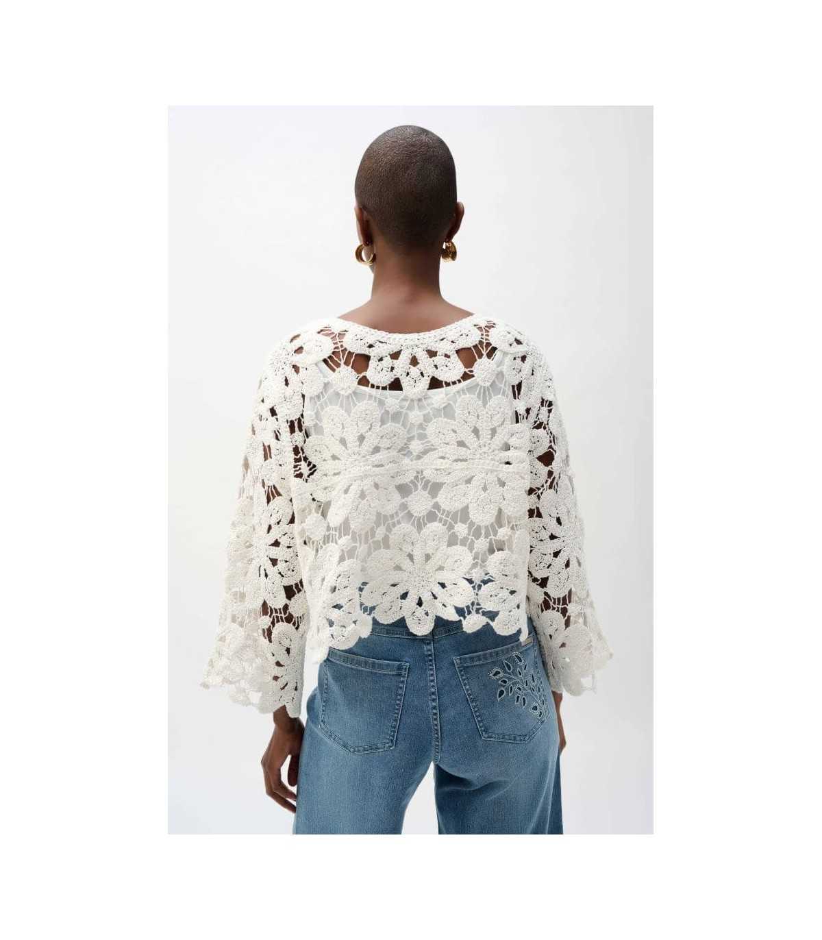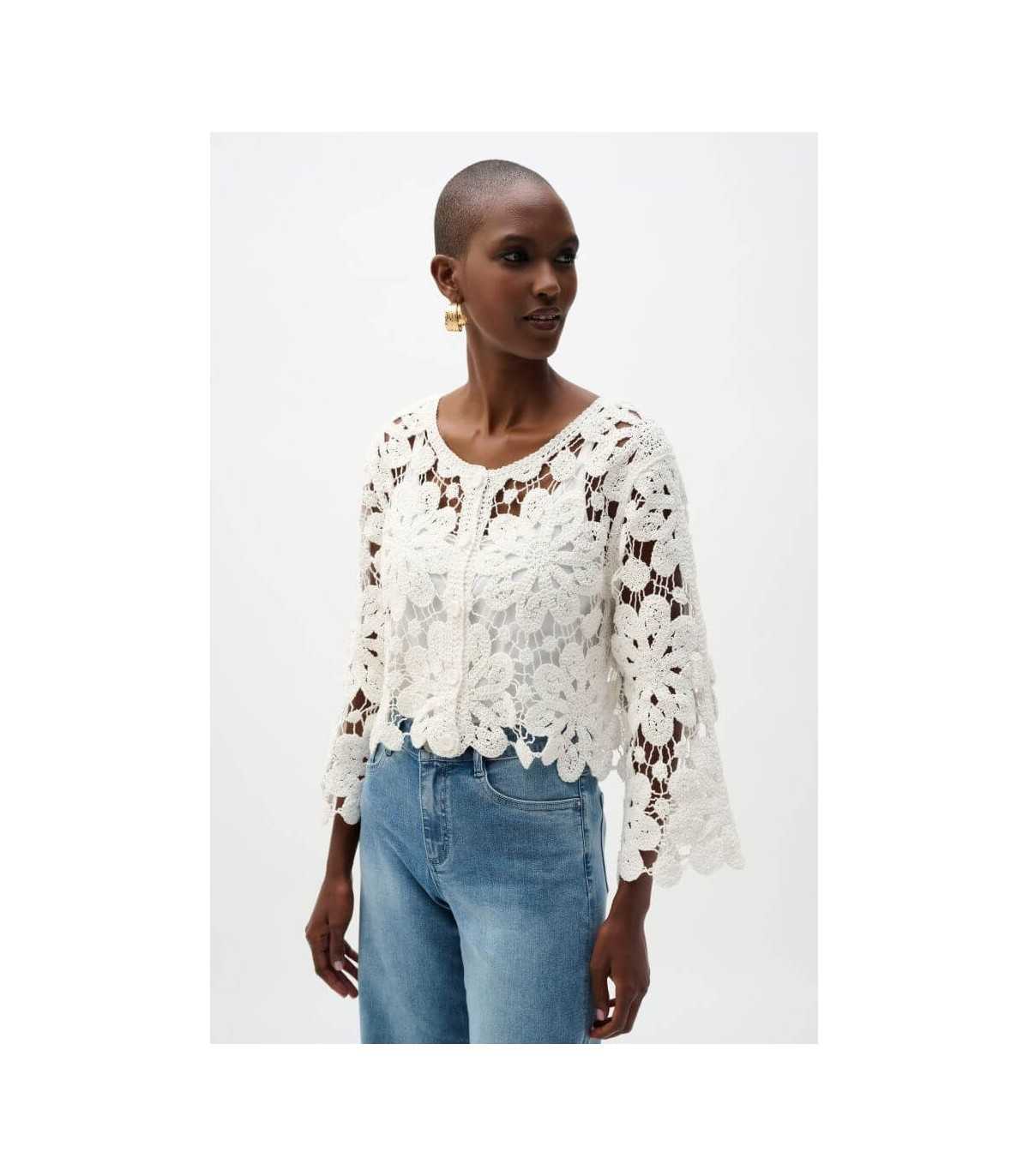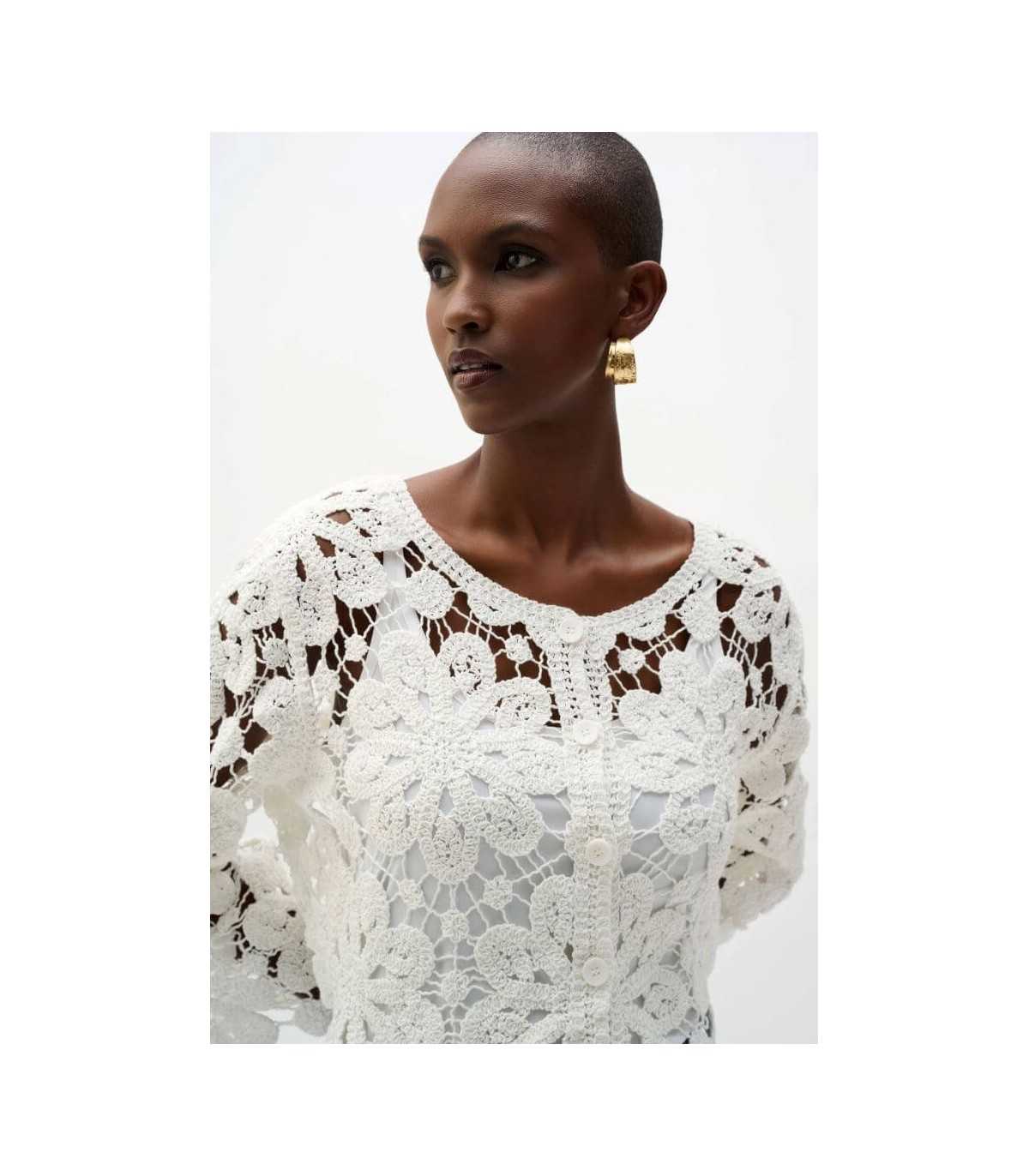 Chaqueta de punto de crochet de algodón, color blanco, manga tres cuartos y cierre de botones, de la marca canadiense Joseph Ribkoff.