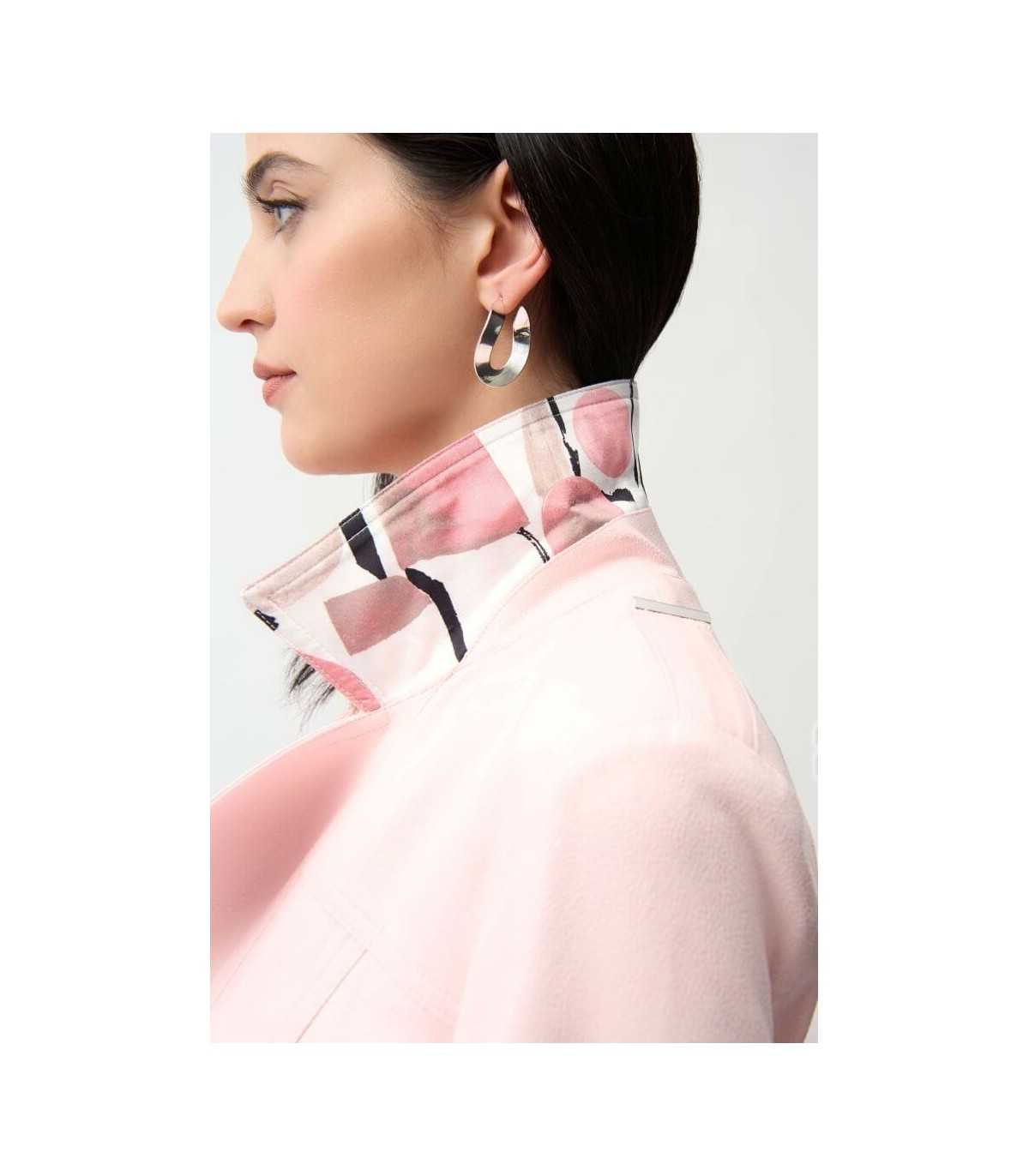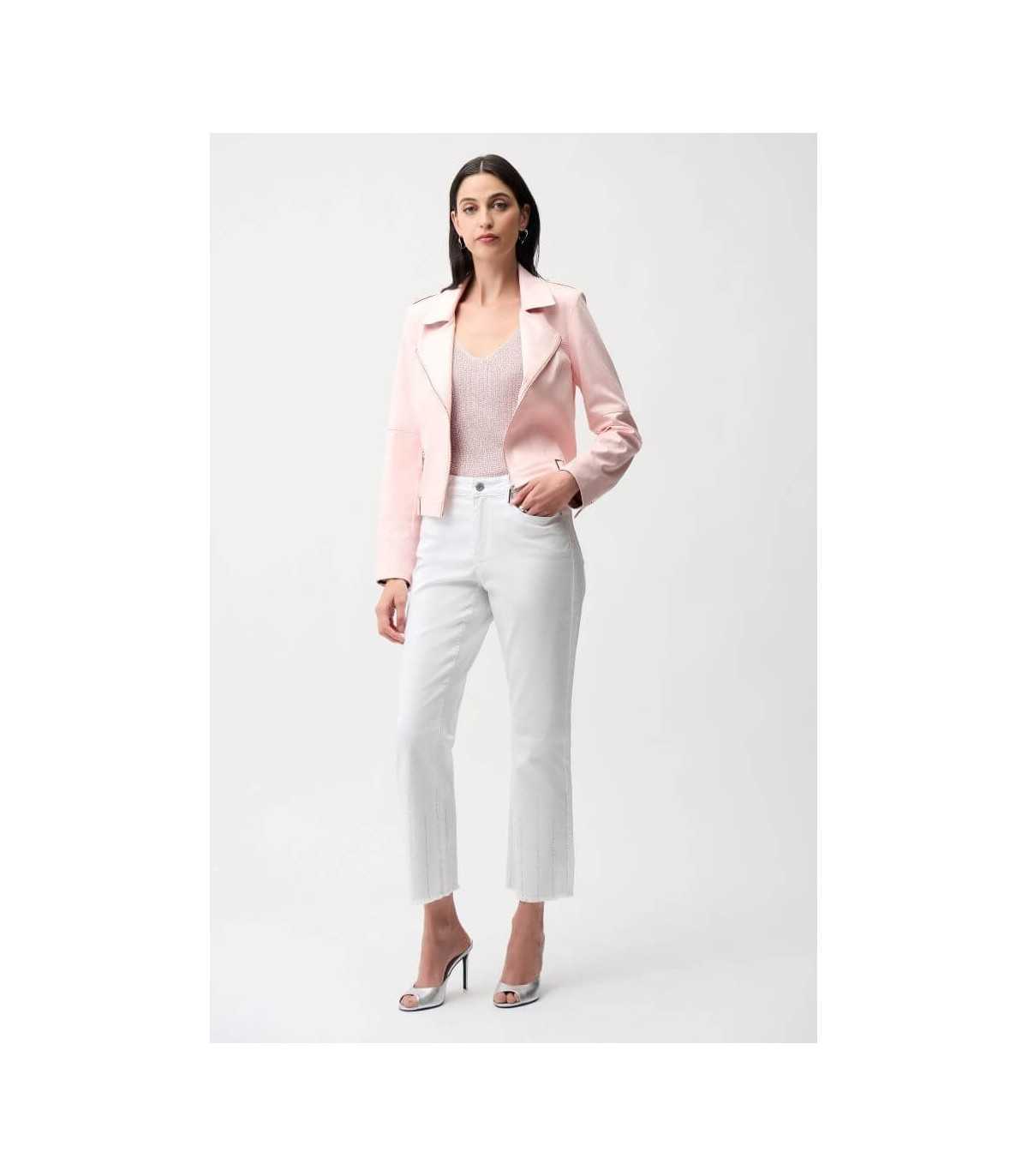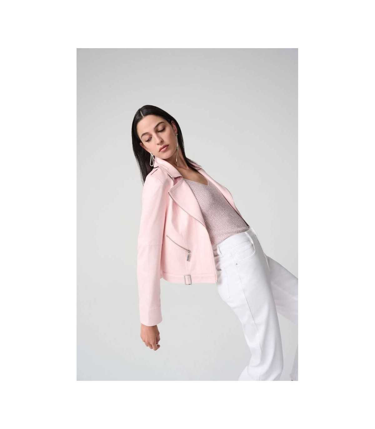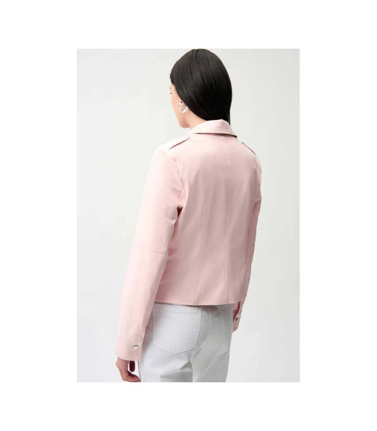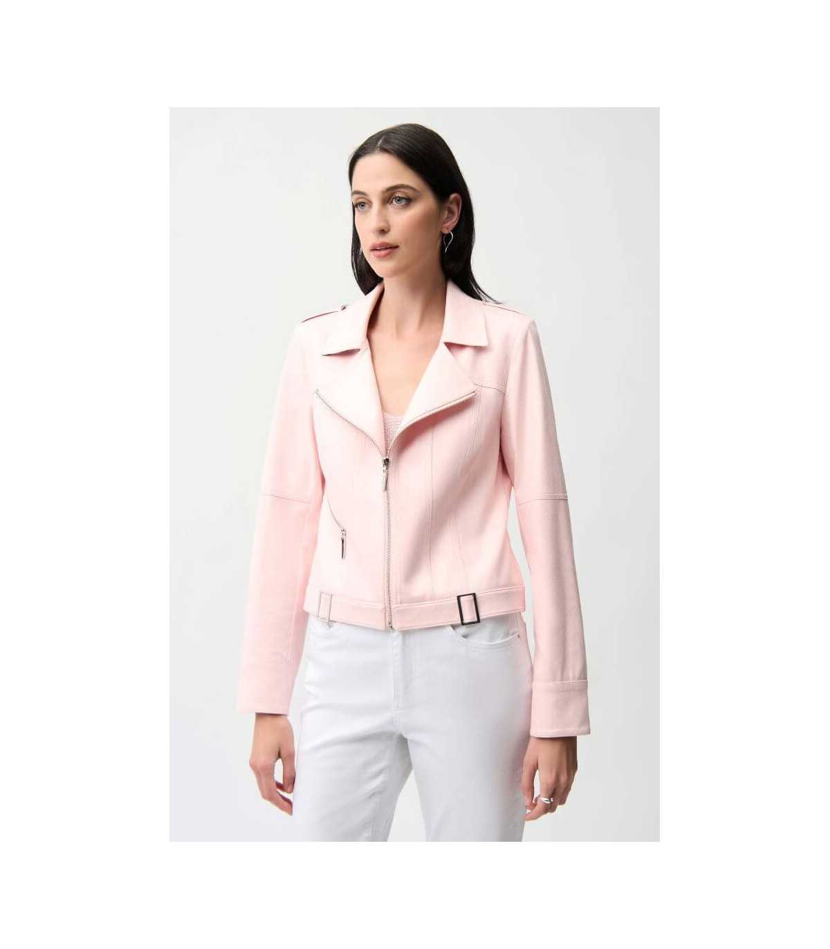 Chaqueta de ante sintético, color rosa claro, cierre delantero de cremallera, hebillas decorativas en el dobladillo delantero y forro de raso estampado, de la marca canadiense Joseph Ribkoff.