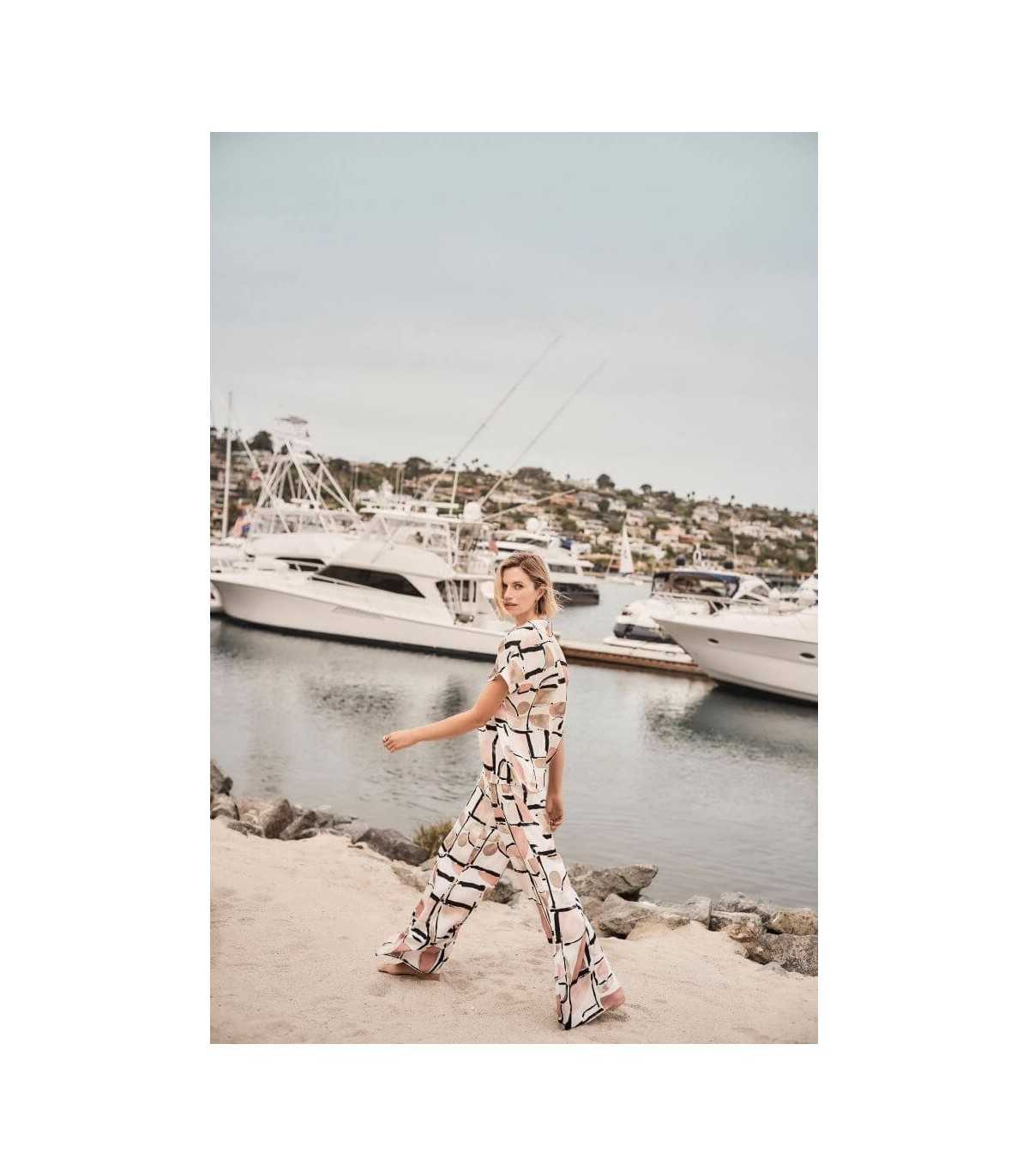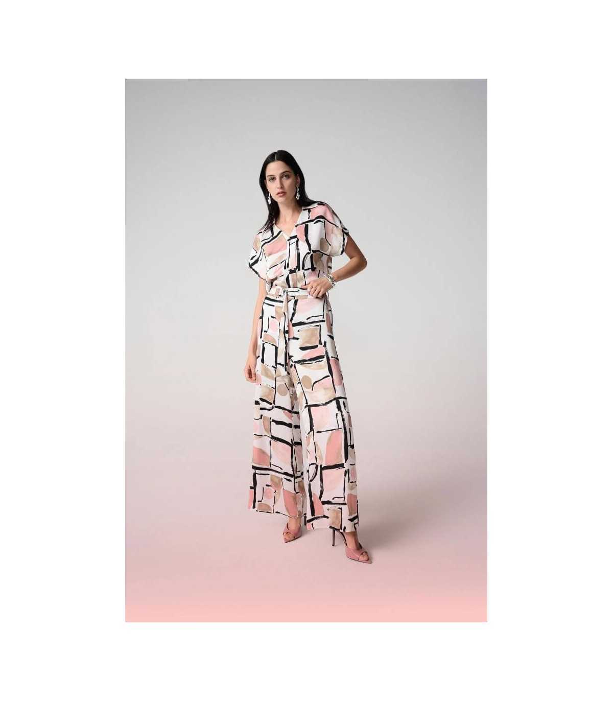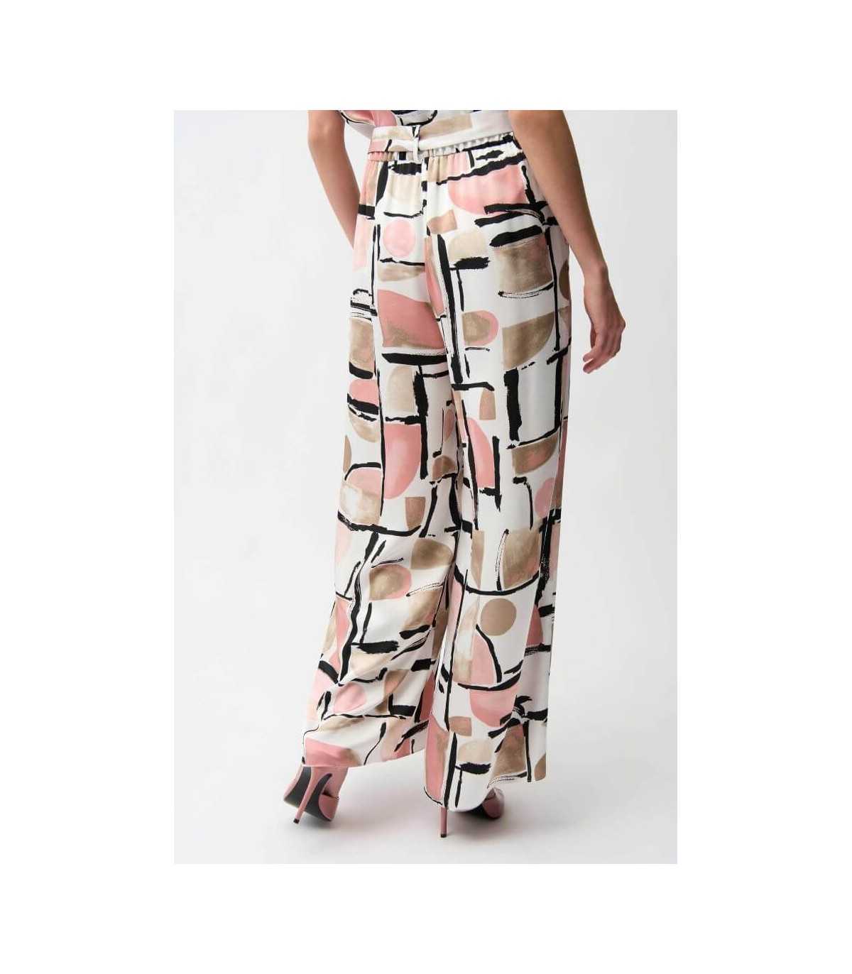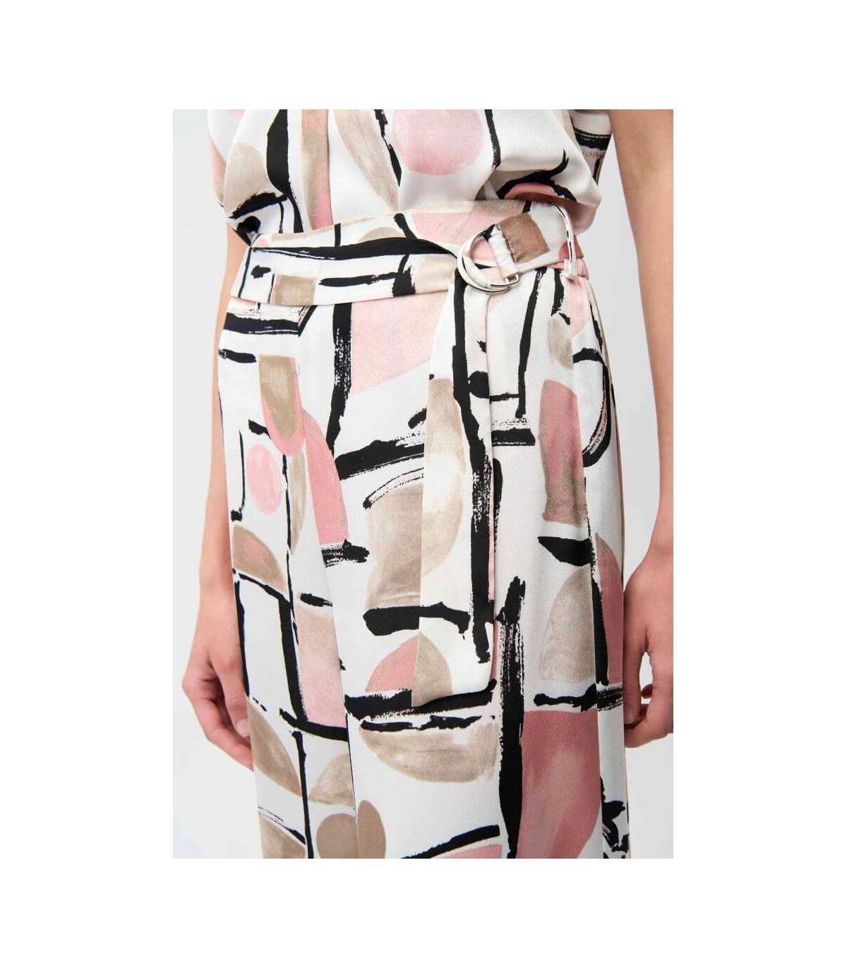 Pantalón en tejido de raso, estampado abstracto, cintura con pliegues y elástico fruncido en la parte trasera y fajín extraíble con detalle de anilla, de la marca canadiense Joseph Ribkoff.