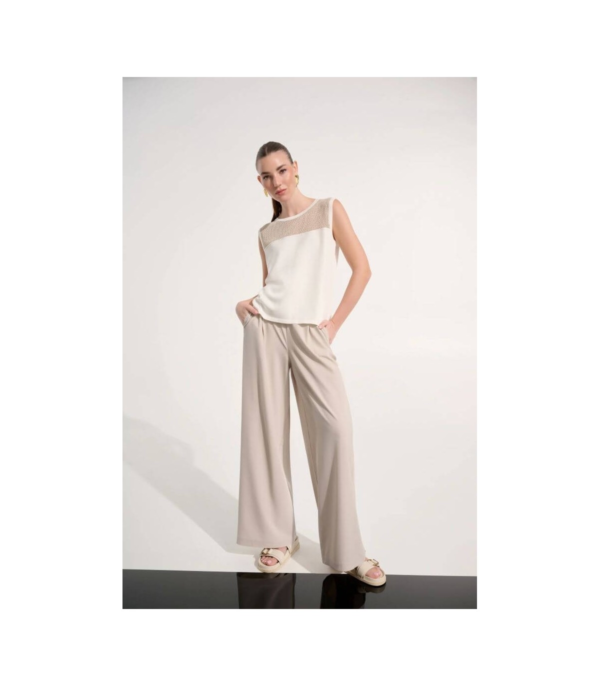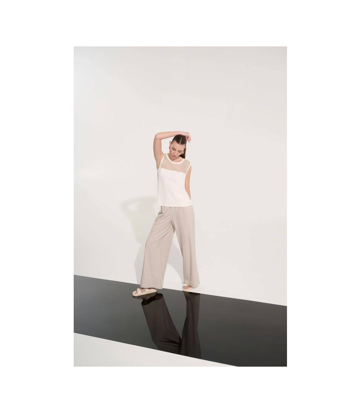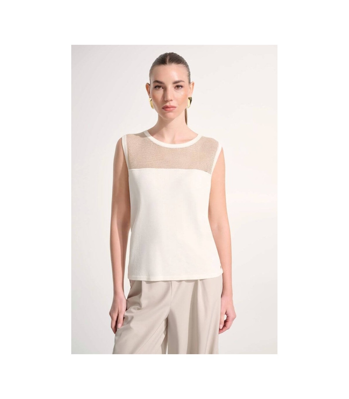 Top en tejido de punto, cuello redondo con canesú de malla, color crudo y corte recto sin mangas, de la marca canadiense Joseph Ribkoff.