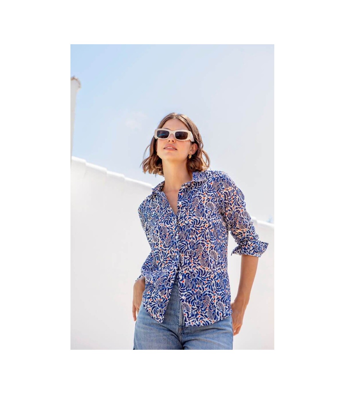 Camisa estampada en tonos azul y crudo, manga larga con puño y cierre de botones, de la marca española Trovels.