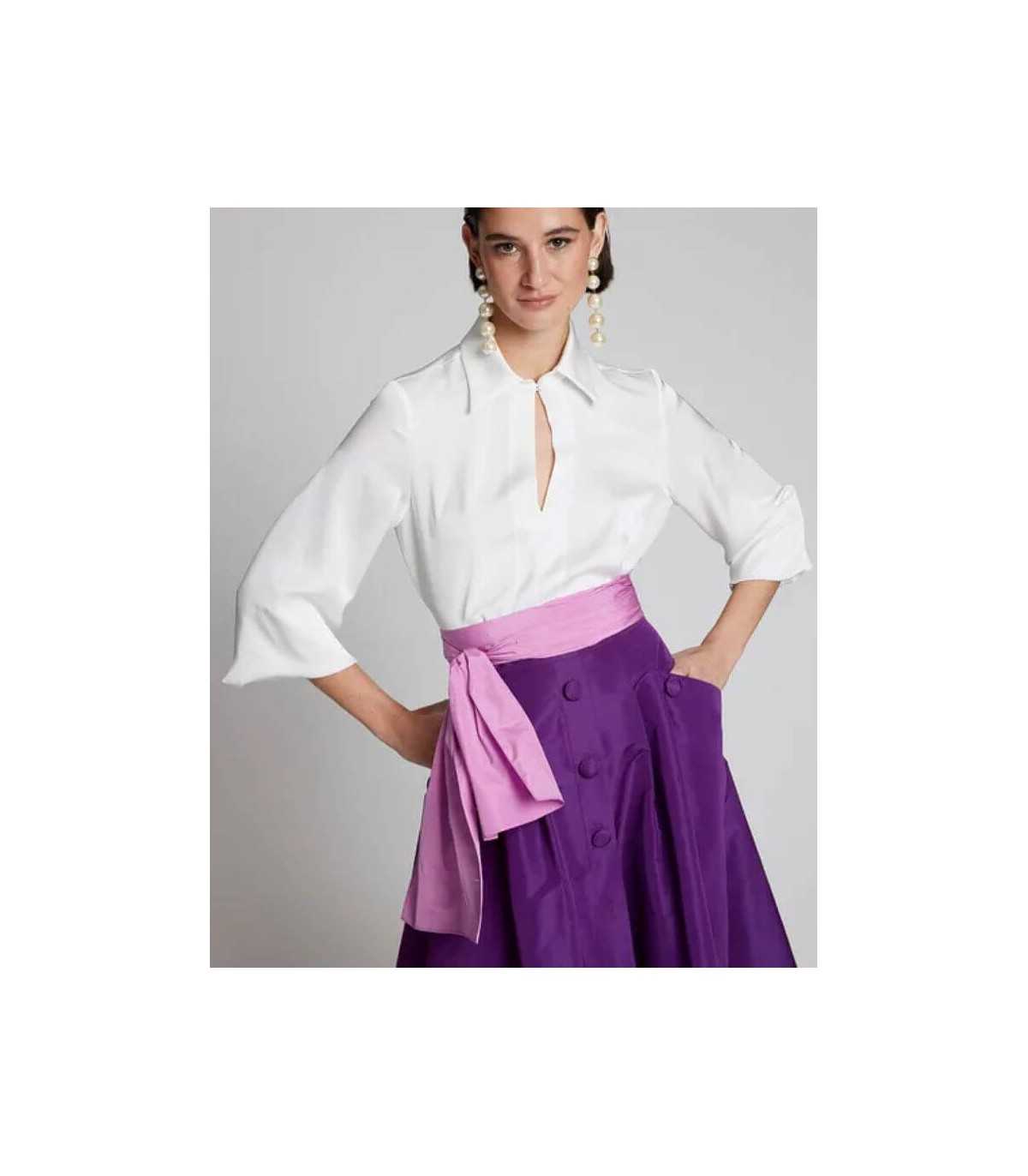 Blusa blanca en tejido de poliéster satinado, cuello camisero con abertura y cierre de un botón y manga larga con terminación de puños elásticos de la marca española Moskada.
