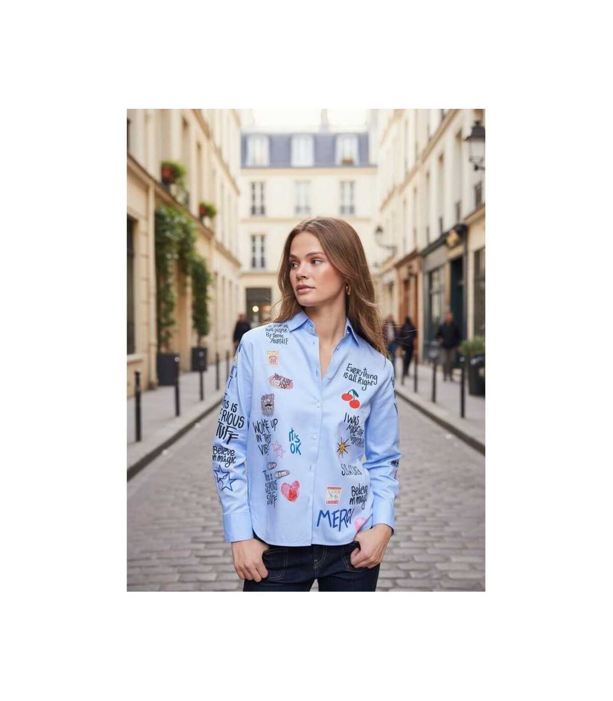 Camisa oxford azul, ilustraciones tipo serigrafia con palabras, dibujos y símbolos en varios colores, corte recto y bajo ligeramente redondeado, cuello camisero con cierre de botones, manga larga y puño abotonado, de la marca española Vilagallo.
