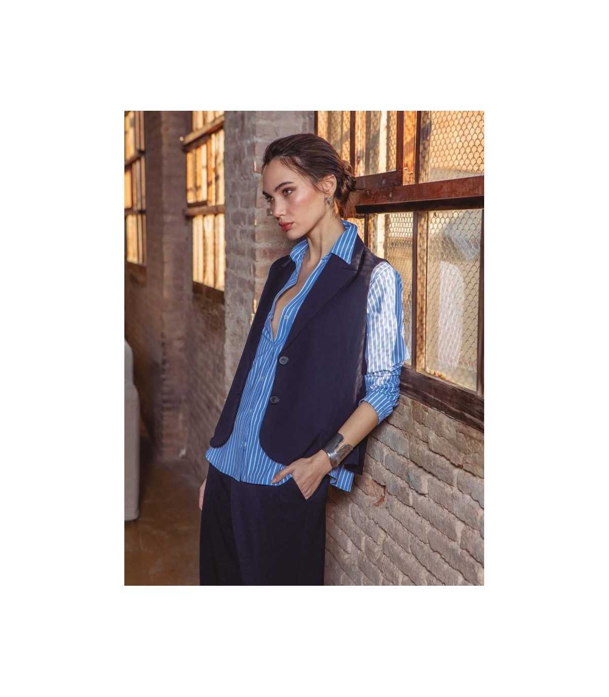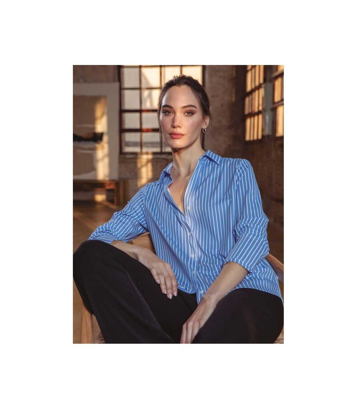 Camisa básica en tejido elástico, está disponible en rayas azul y blanco y en blanca completamente lisa, cuello camisero con escote en forma de V y cierre de botones, de la marca española Trovels.