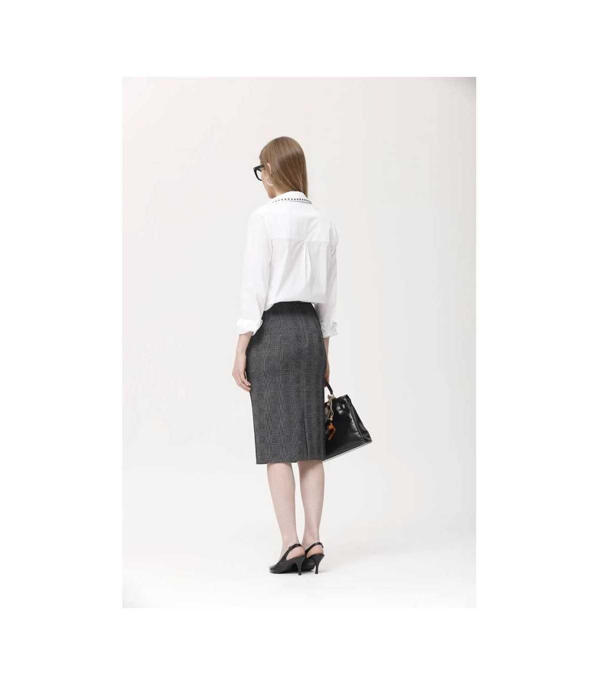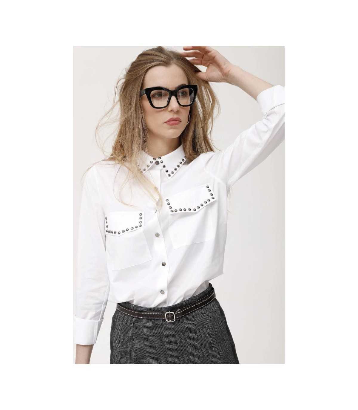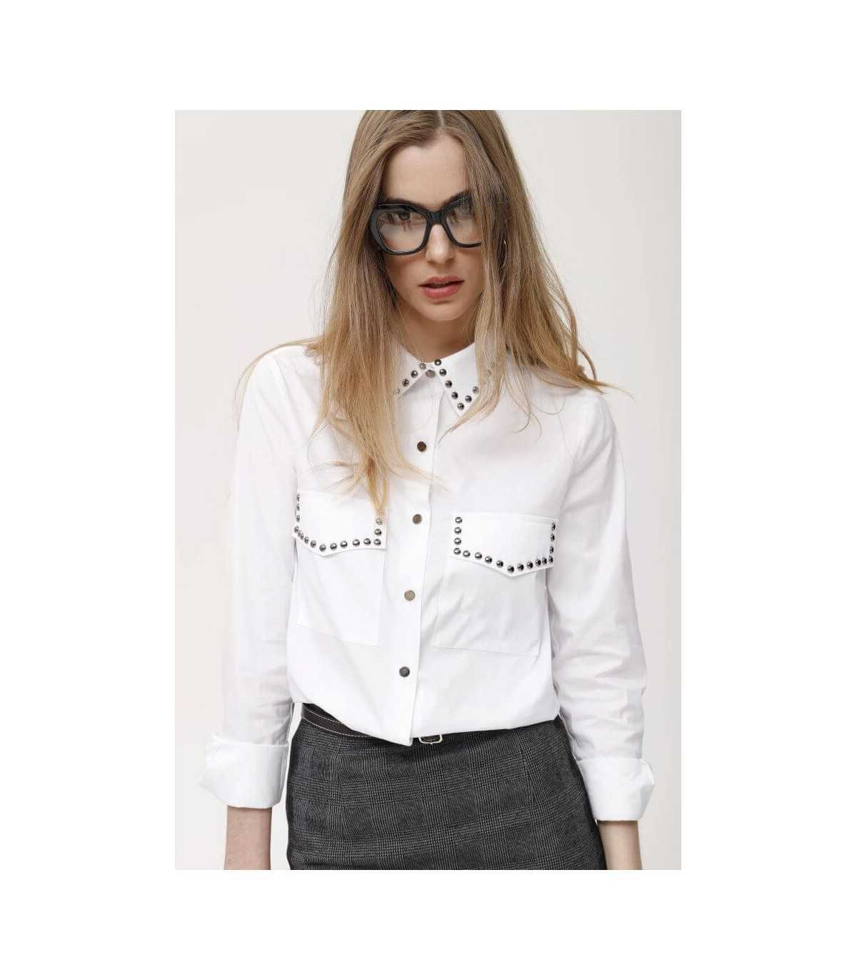 Camisa blanca de algodón stretch con botones metálicos, adornadas con aplicaciones metálicas en el cuello y bolsillos, de la marca española Oky.