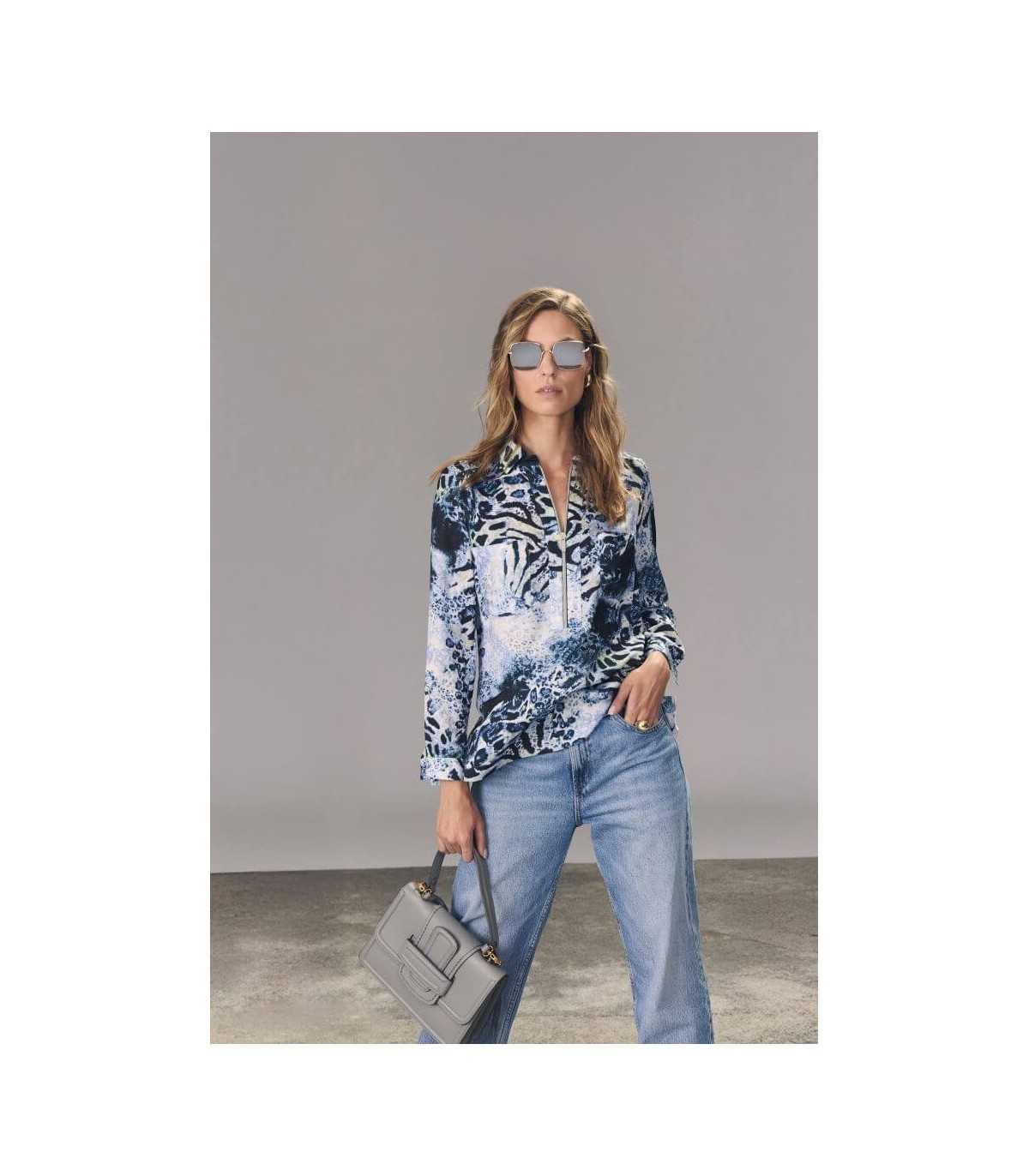 Camisa estampado multicolor, cuello camisero con cierres de botones y terminación del bajo redondeado, de la marca española Aldo Martins.Composición: 92% viscosa, 8% elastano.