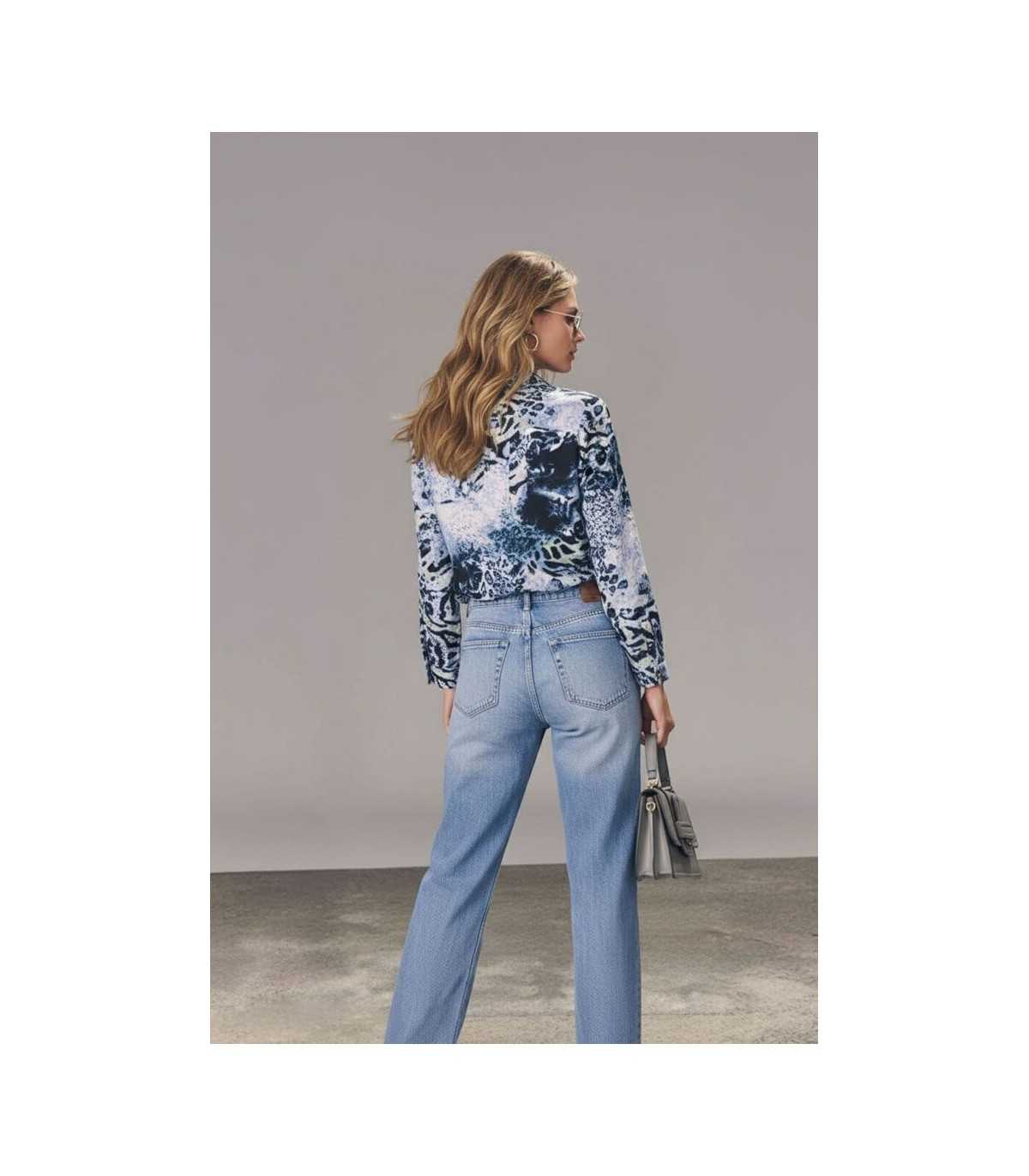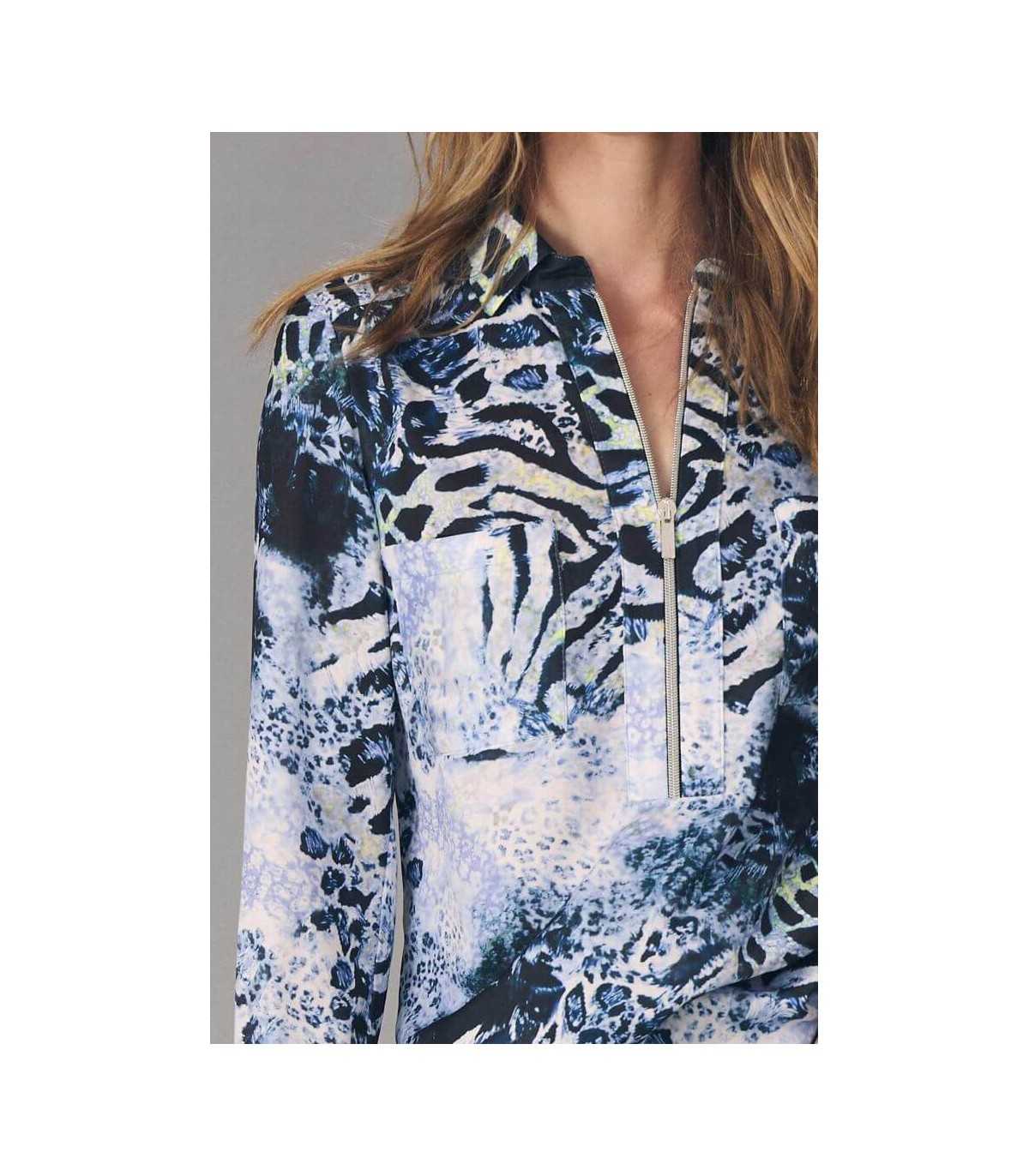 Blusa estampada en animal print en tonos azules, dos bolsillos y cuello tipo polo con cierre de cremallera, de la marca española Carmela Rosso.