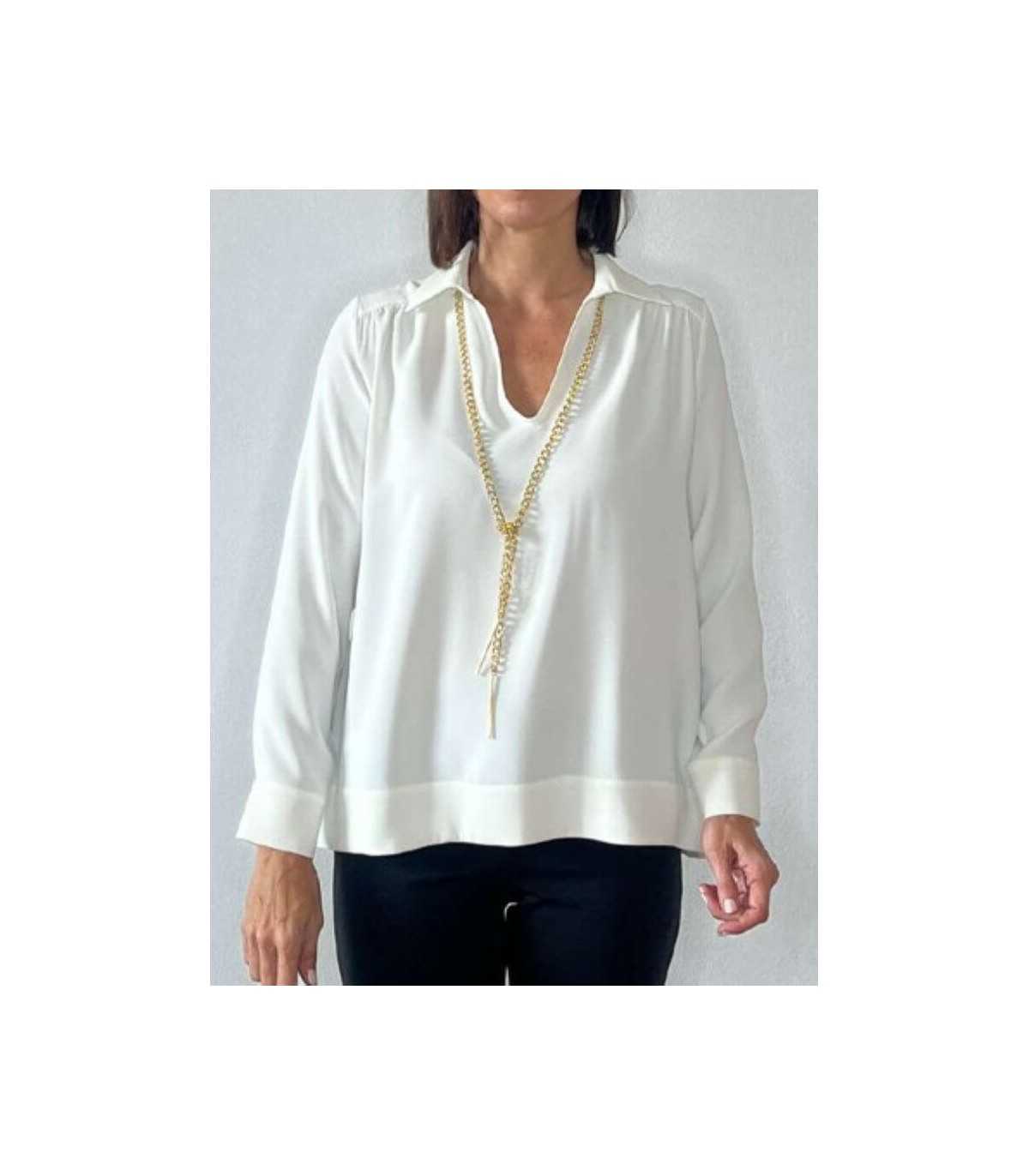 Blusa básica, cuello camisero con cierre de botones, manga larga terminada en puño y terminación del bajo con puntas redondeadas, de la marca española Civit.Composición 100% poliéster.