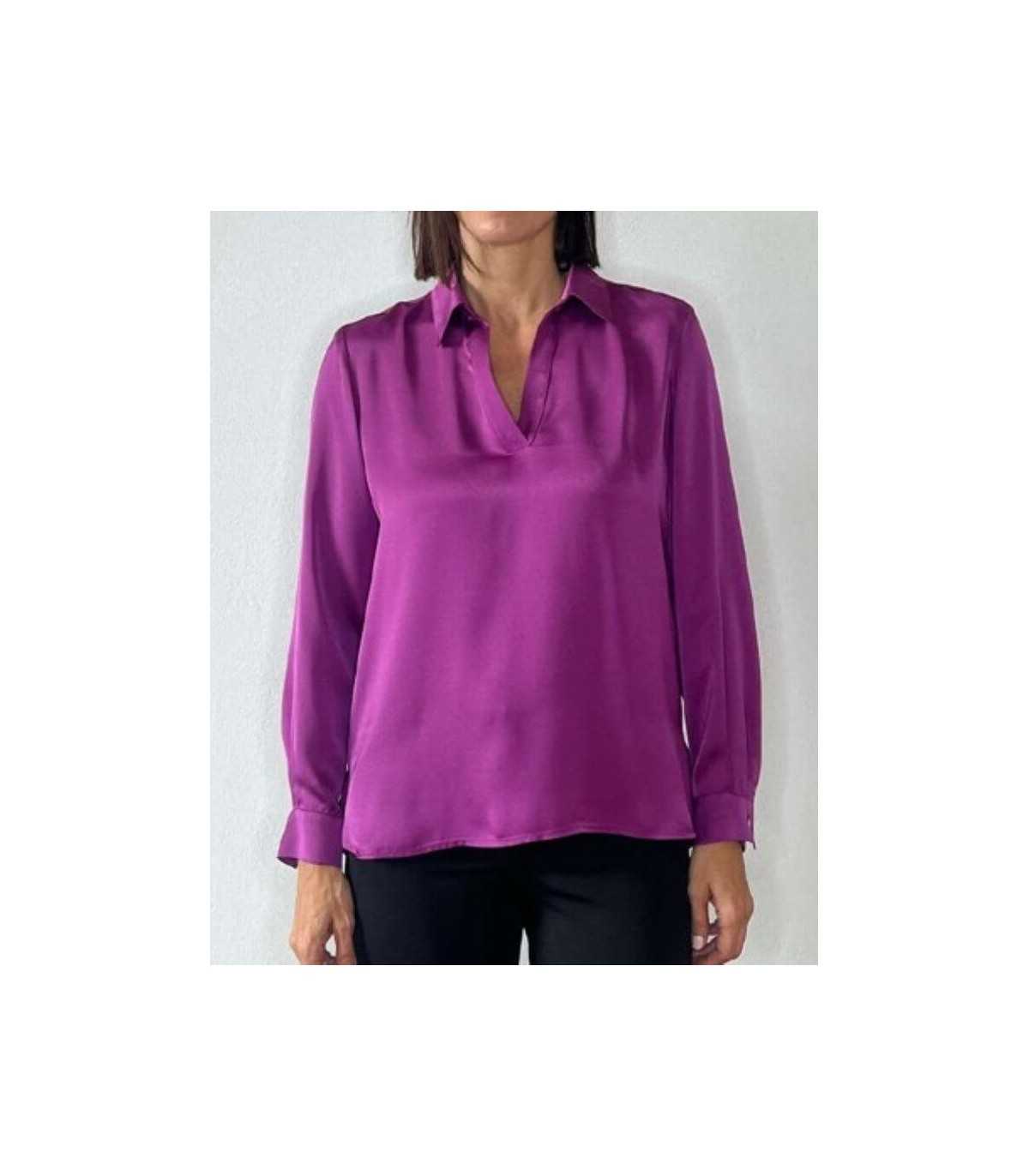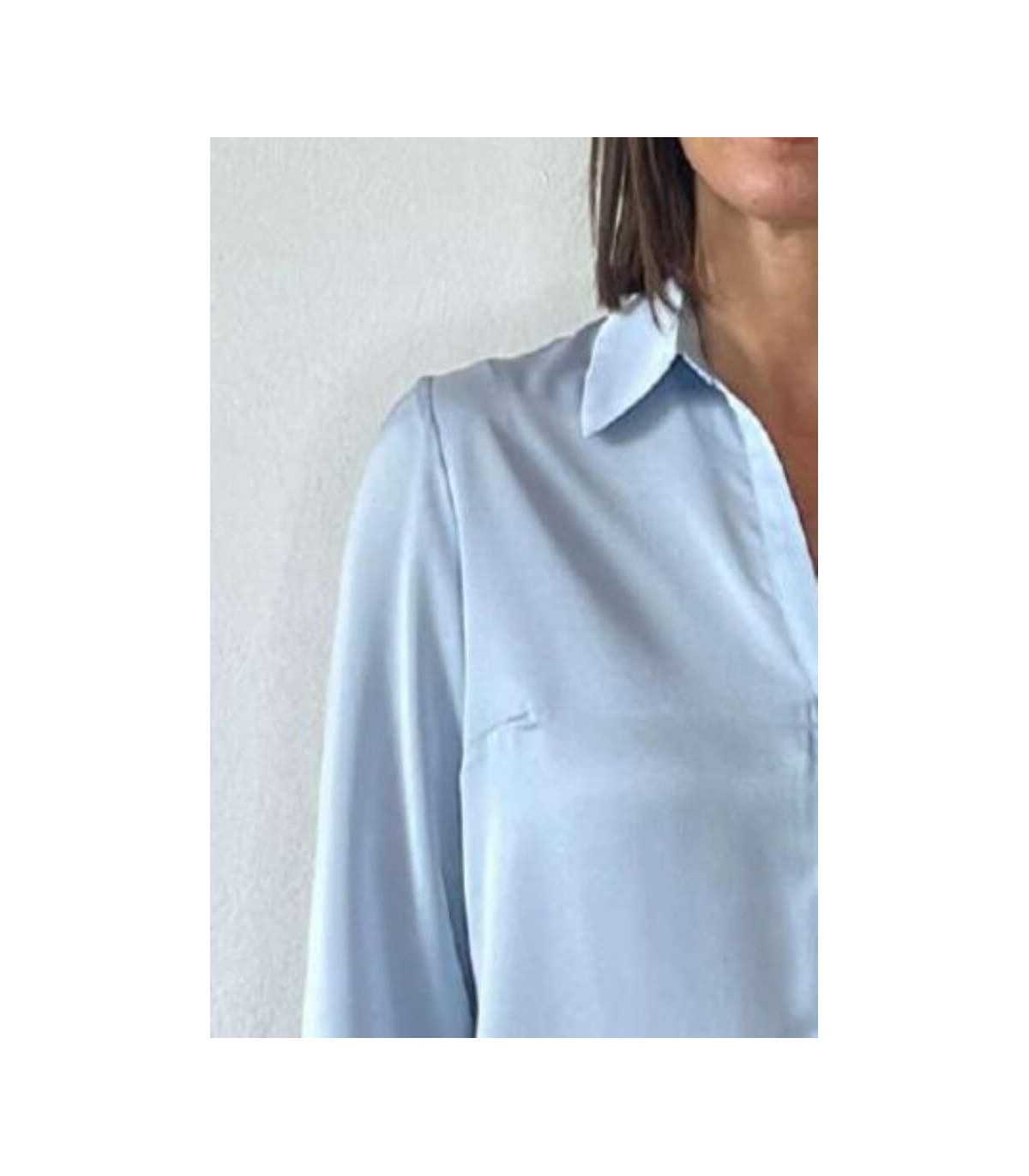 Blusa básica, cuello camisero con cierre de botones, manga larga terminada en puño y terminación del bajo con puntas redondeadas, de la marca española Civit.Composición 100% poliéster.