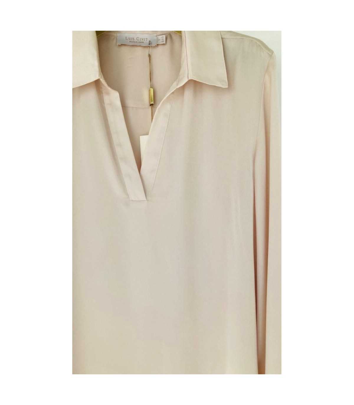 Blusa en tejido satinado, cuello polo, puño con cierre de botones y línea recta con terminación del bajo puntas redondeadas, de la marca española Luis Civit.